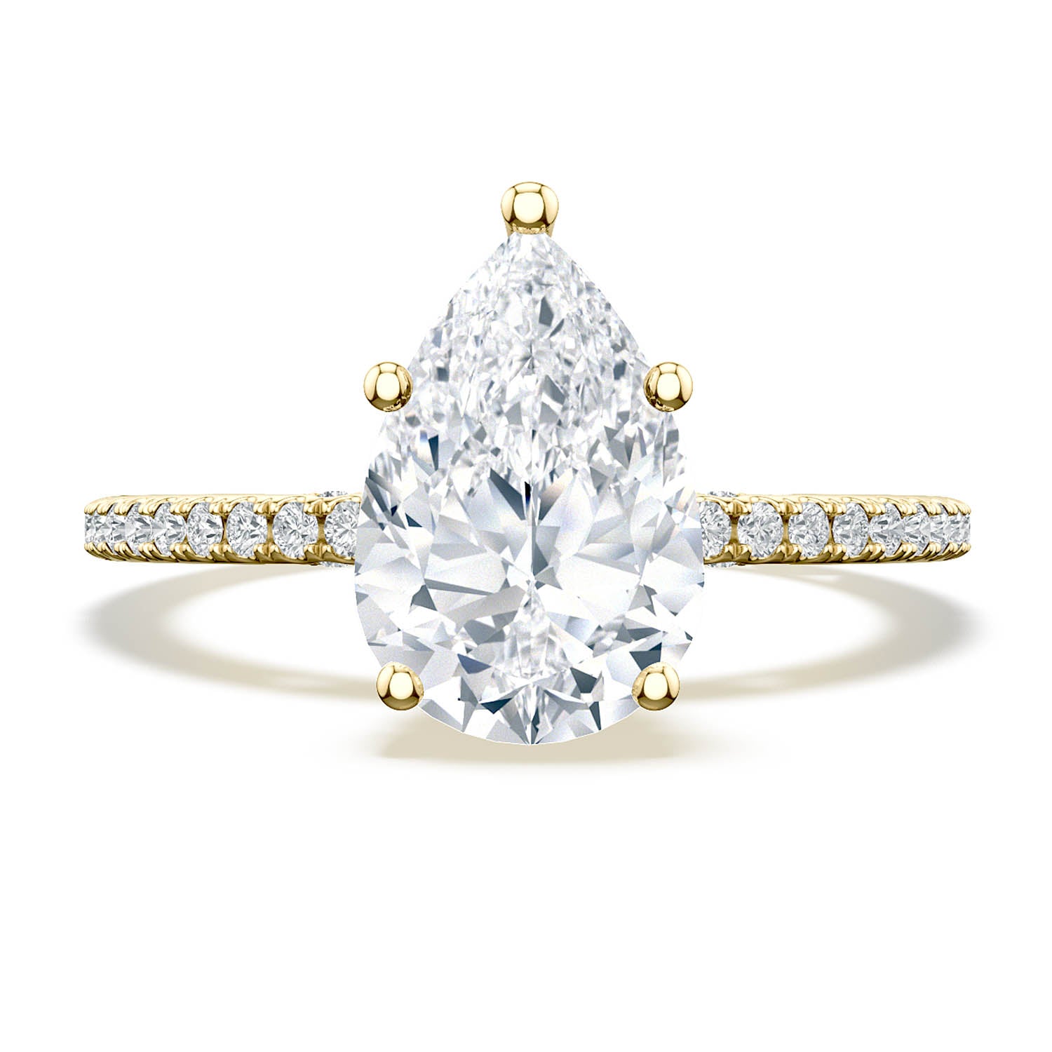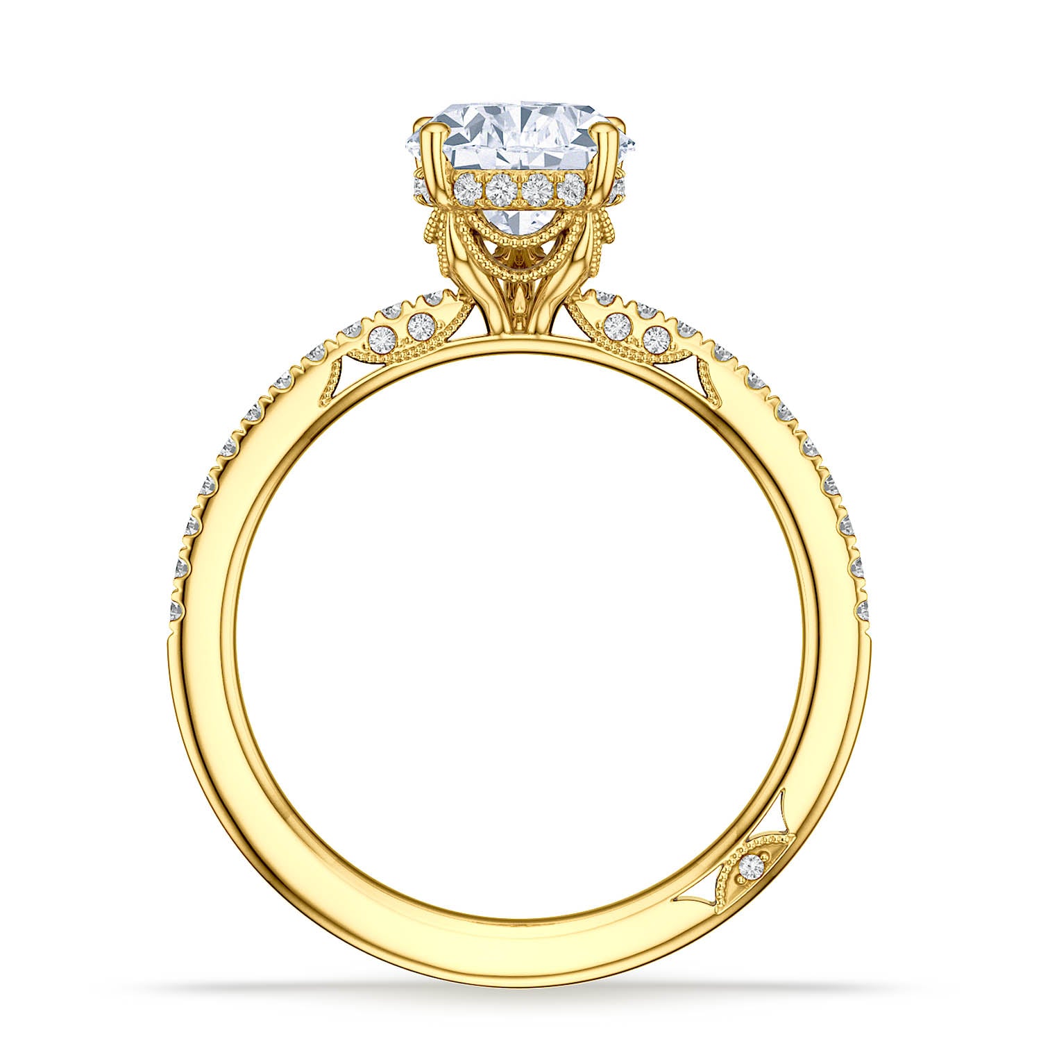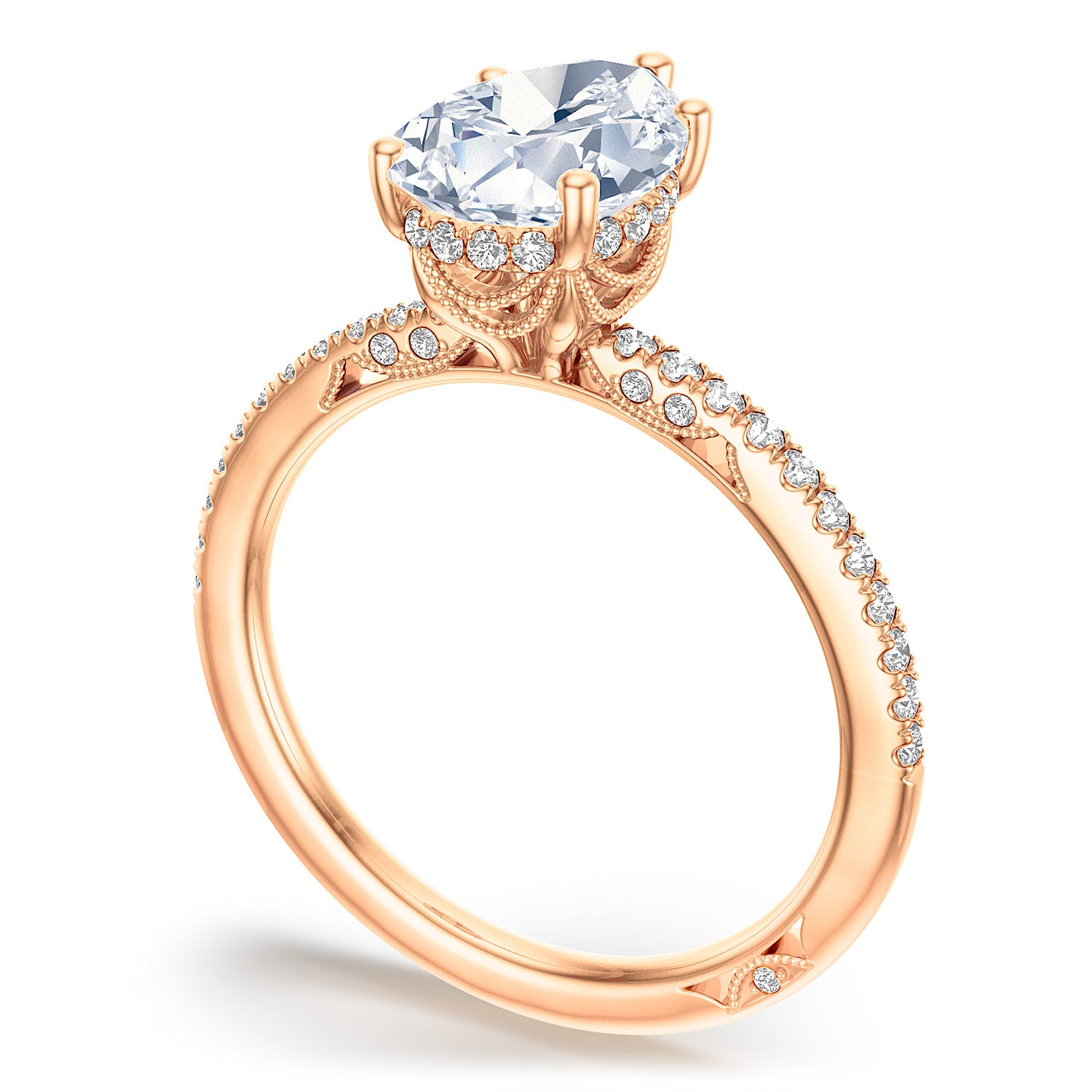 Draping milgrain from the crown is a joyful nod to the wedding day. Delicate pavé diamonds adorn the ceiling, and Simply TACORI crescent fabric decorates the inner face. A hidden bloom complements the french pavé band with an ornamented sparkle.