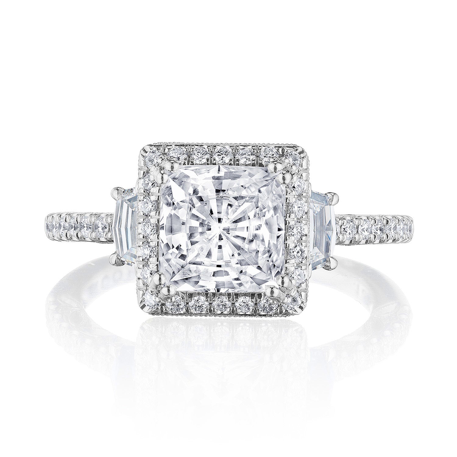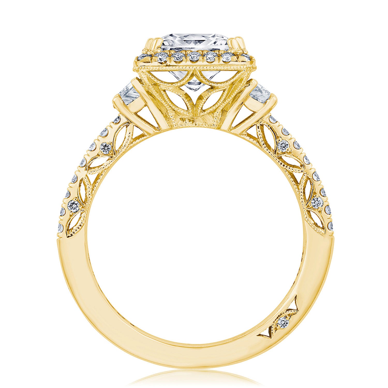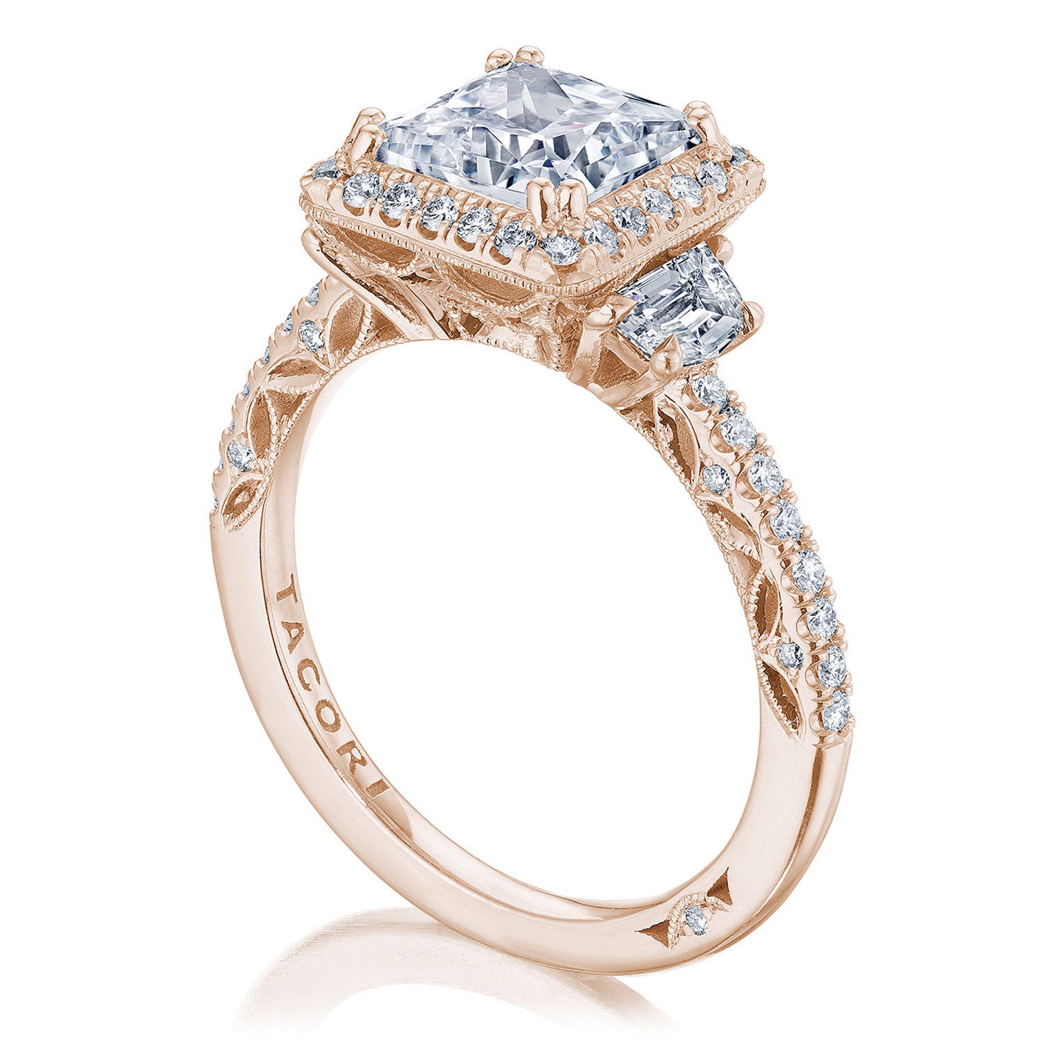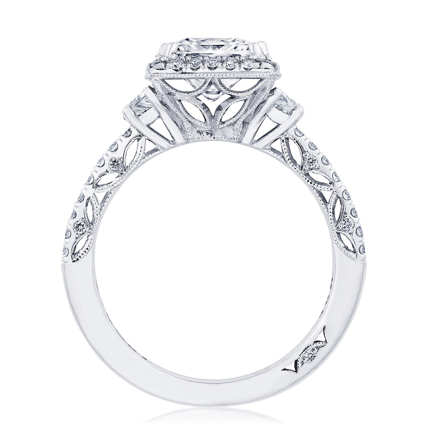 This elegant three-stone setting is exceptionally detailed. A Spotlight Bloom with radiant Cadillac side stones sit atop a meticulous French pavé band with lace-like, milgrain-edged Dantela Crescent Fabric.