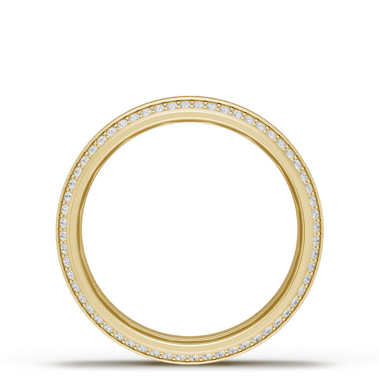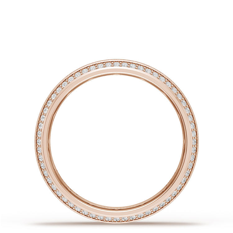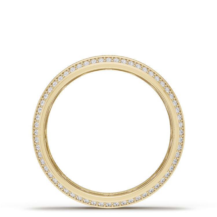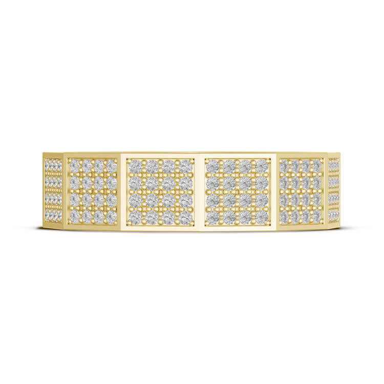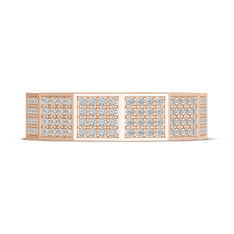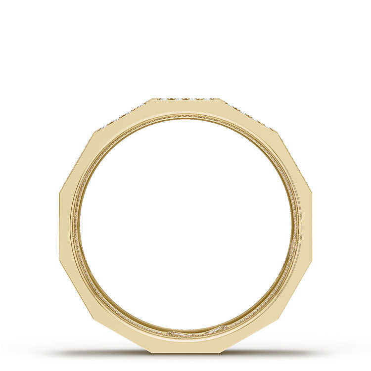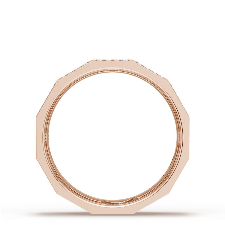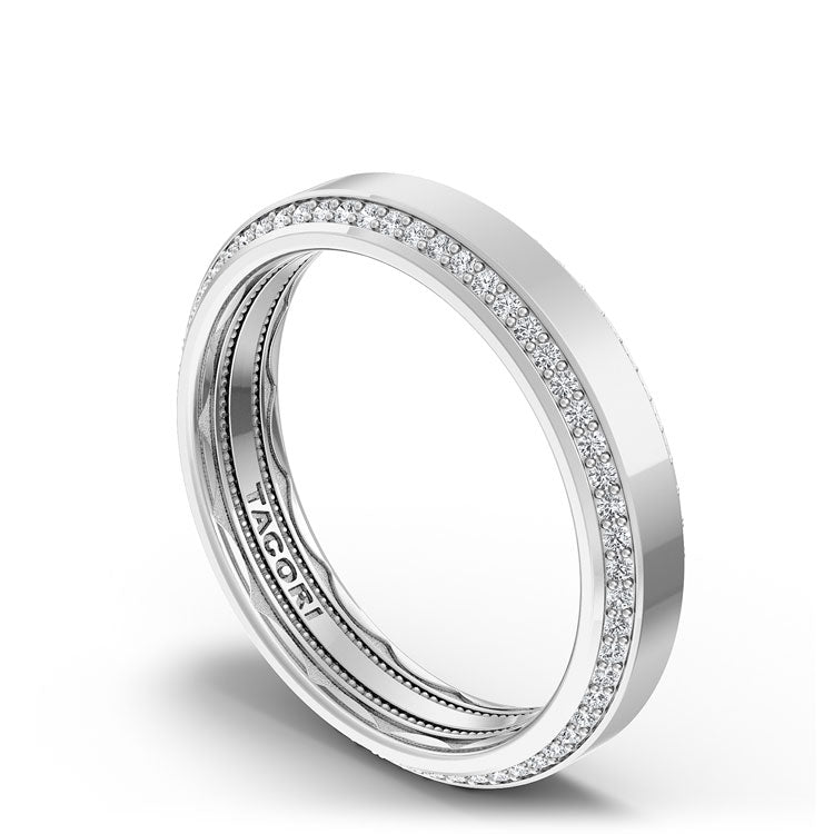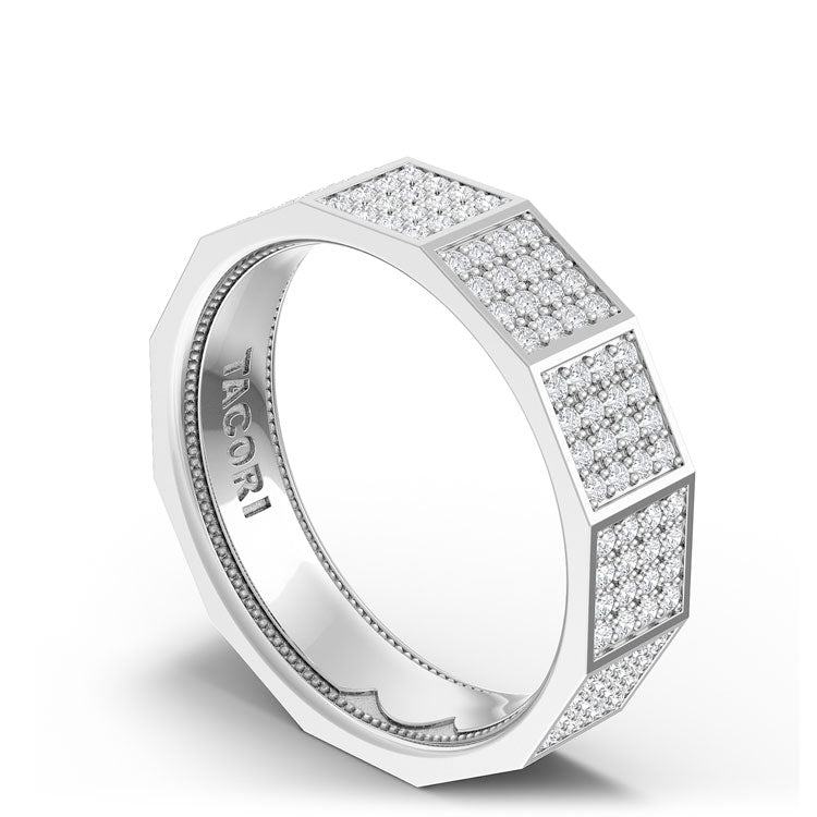 Every facet of this multifaceted wedding band is decorated with a grid of round brilliant pave-set diamonds. The inner face silhouette features a single TACORI Crescent and hand-hewn milgrain. Rings are available in sizes 4-12.