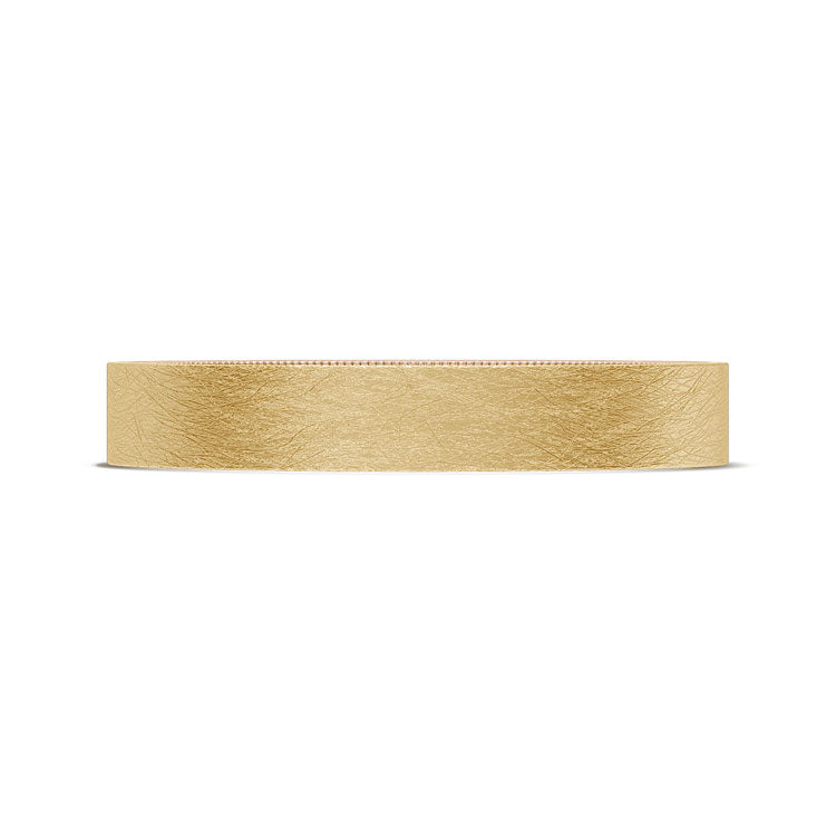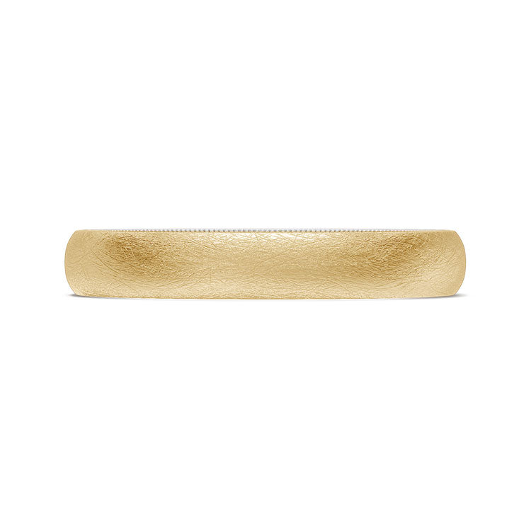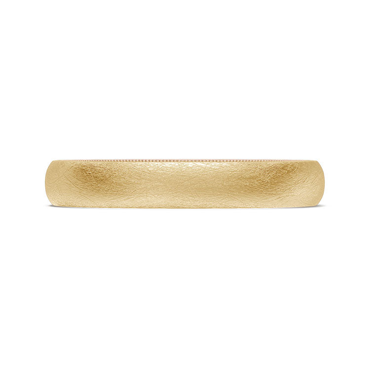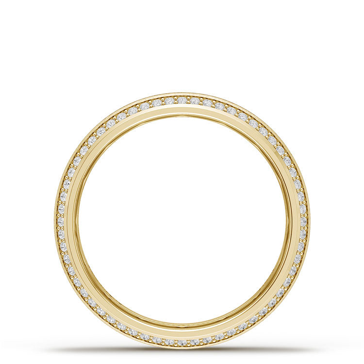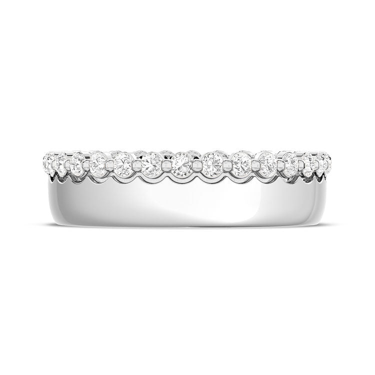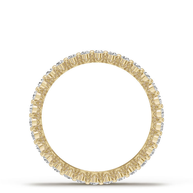 Prong-secured round brilliant diamonds encircle the upper perimeter of the wedding band, with each stone countoured with meticulous engraving. Crescents embellish the inner face silhouette. Rings are available in sizes 4-12.
