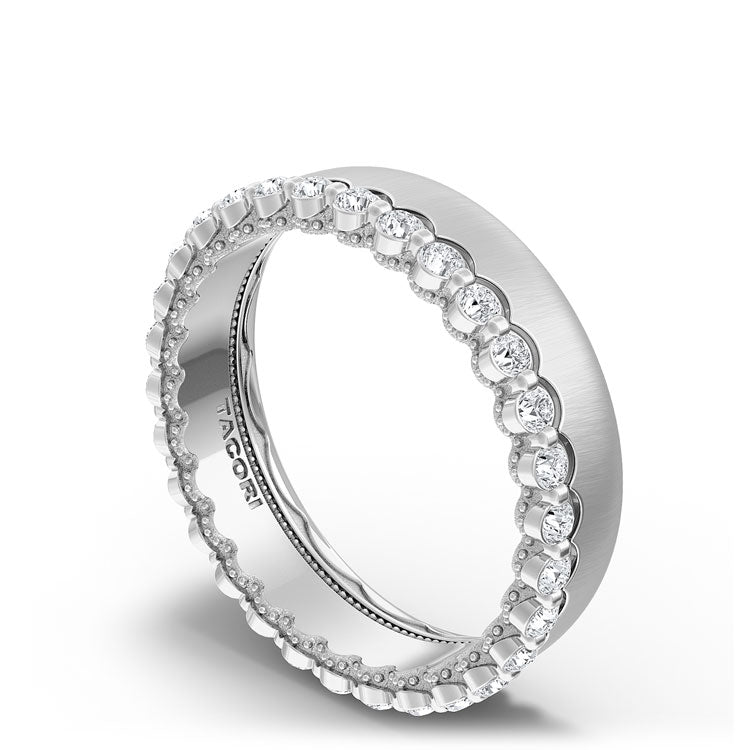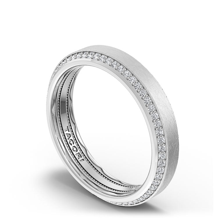Facets of the satin-finish band alternate with embellishments of hand-set pave diamonds for a textured display. The inner face is decorated with a single TACORI Crescent and hand-hewn milgrain. Rings are available in sizes 4-12.