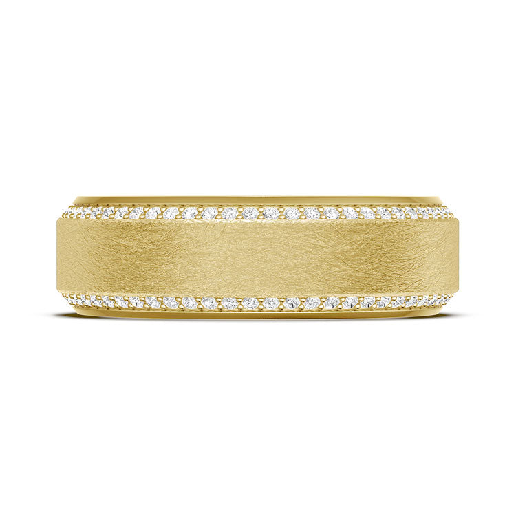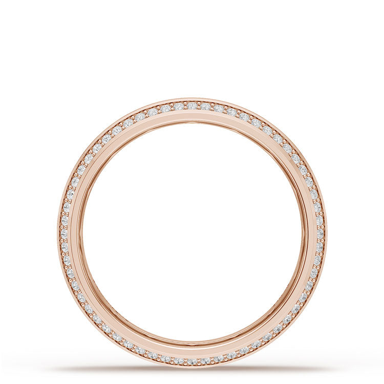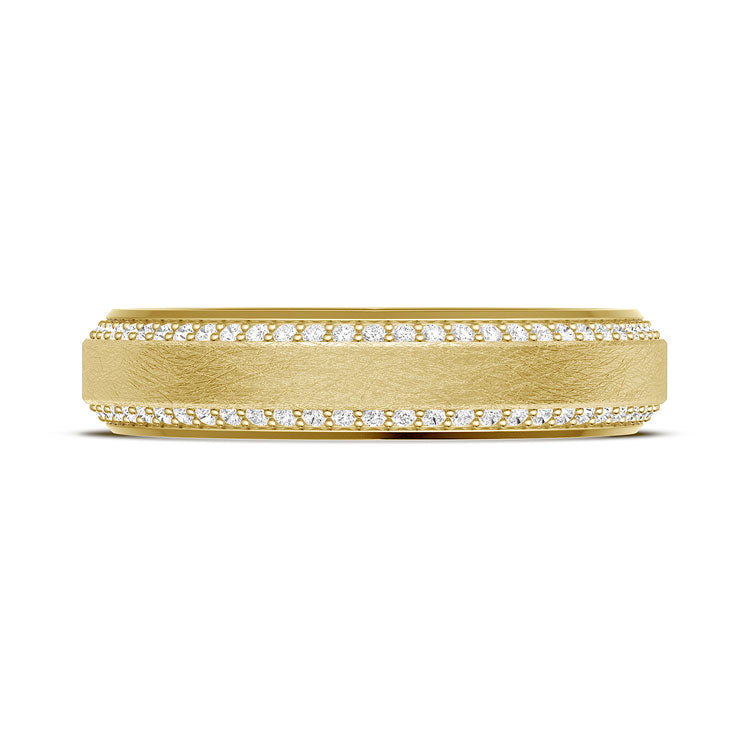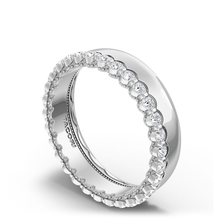 Two eternities of round-brilliant diamonds are hand set into beveled grooves that countour the wedding band's ceiling. TACORI Crescents and hand-hewn milgrain decorate the inner face. Rings are available in sizes 4-12.