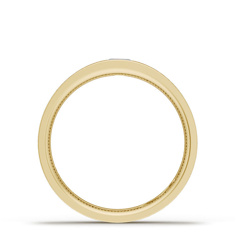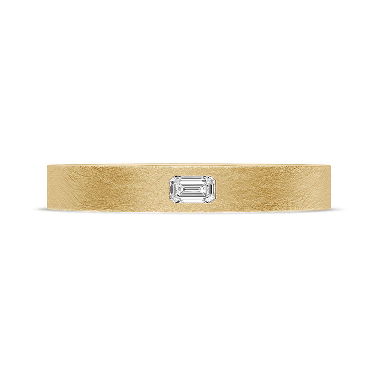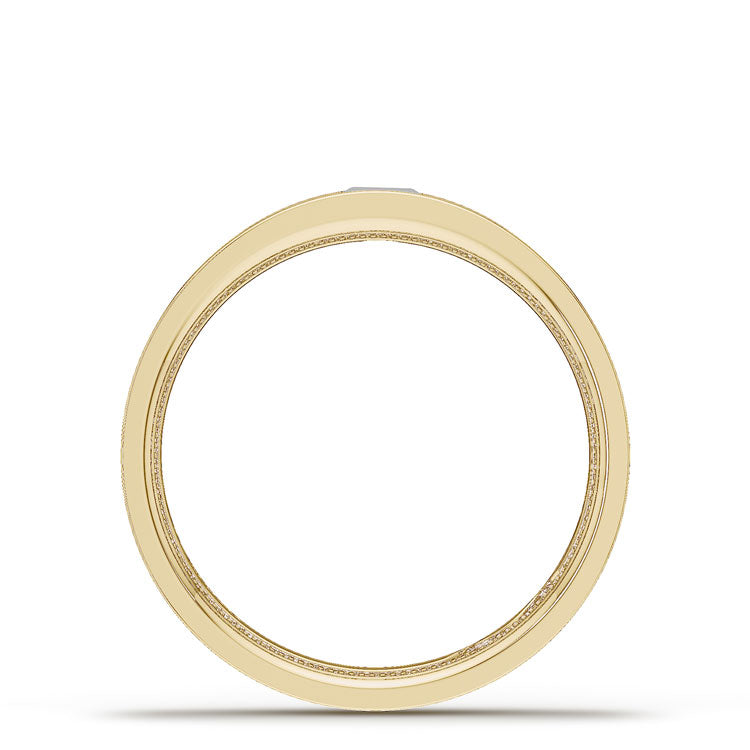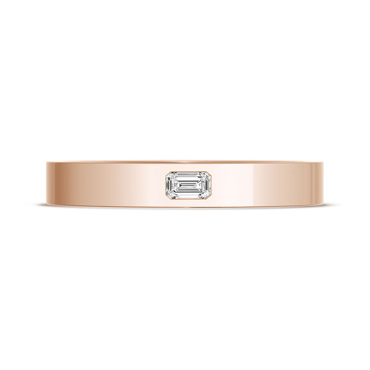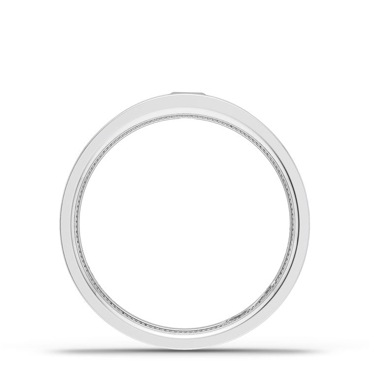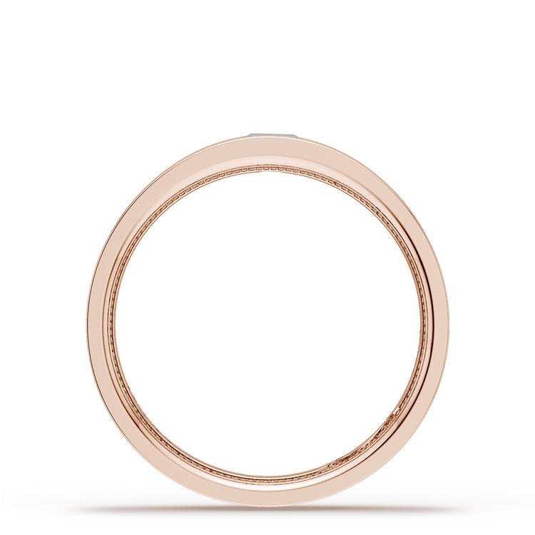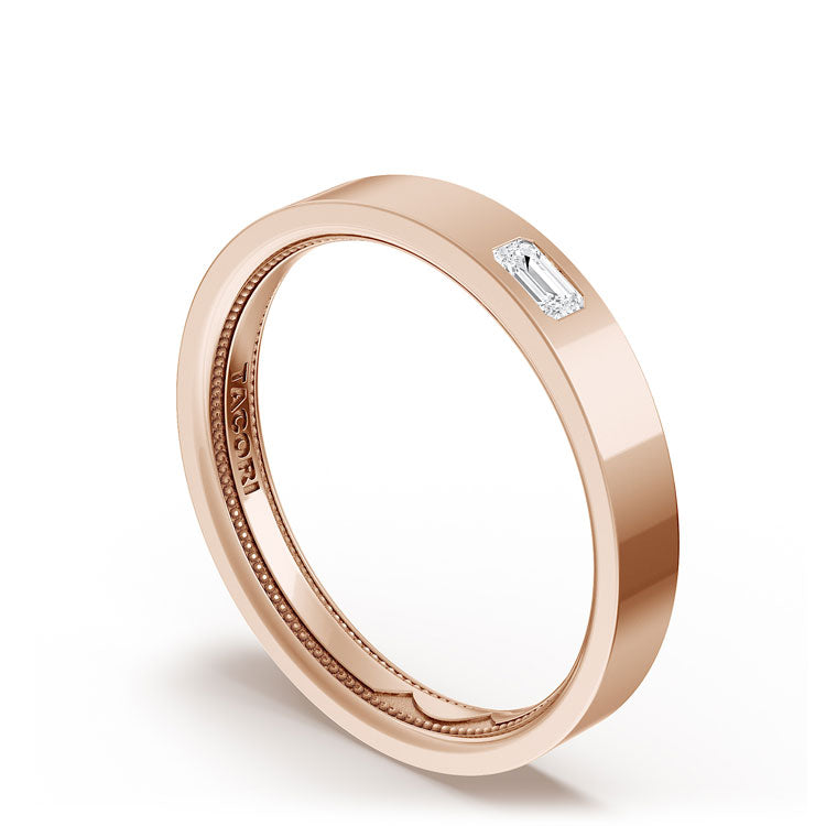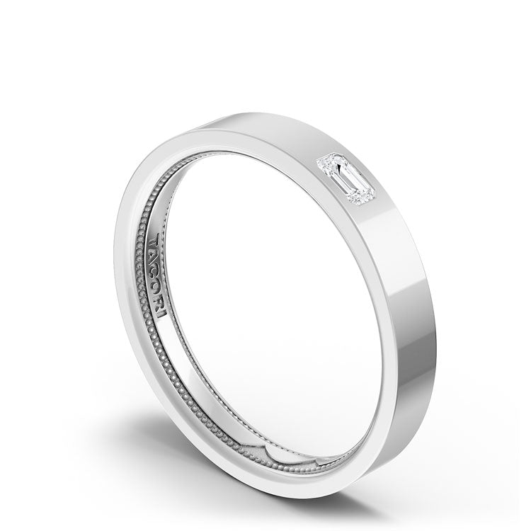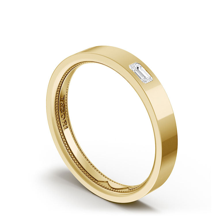 A single bezel set TACORI exclusive diamond is set into the ceiling of a delicate wedding band. The inner face silhouette features TACORI Crescent detailing and hand-hewn milgrain. Rings are available in sizes 4-12.