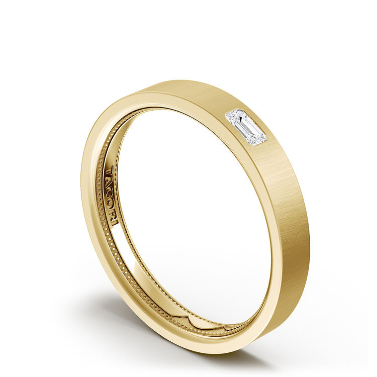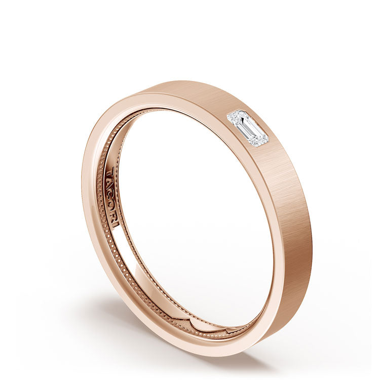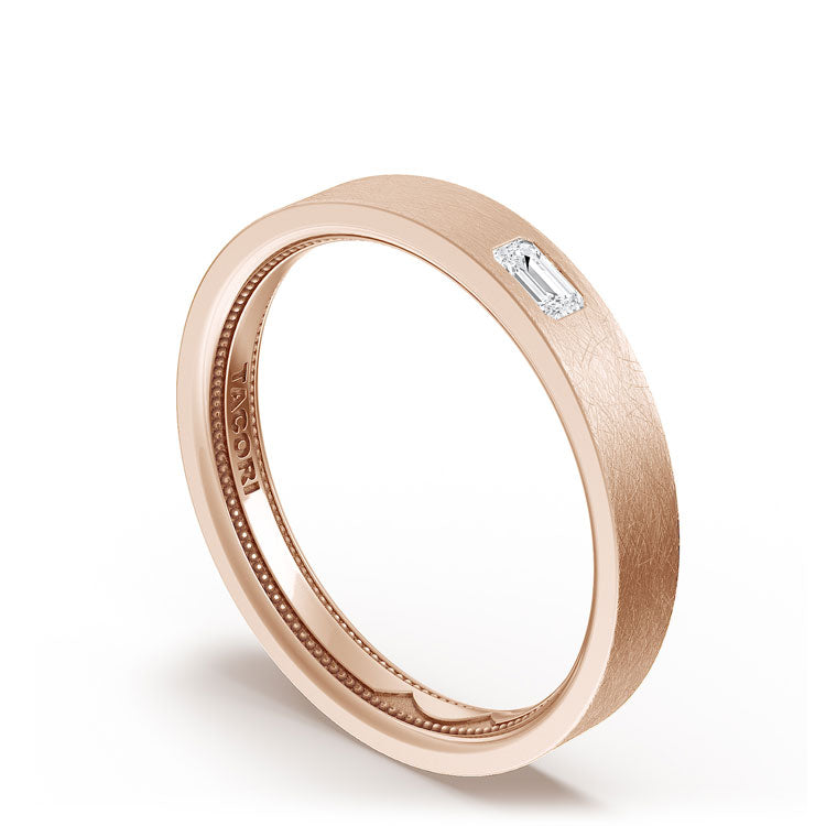 A satin exterior is accented with a Tacori-exclusive triple-cut diamond, bezel-set into the flat-top band. This simple but elegant design is complemented by full sculpted crescent detail and a soft-comfort fit interior.
