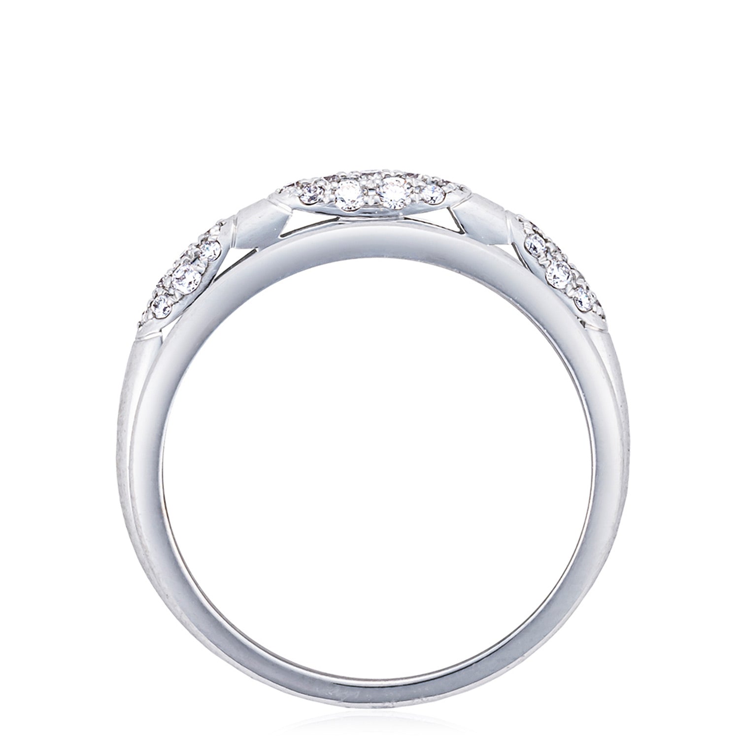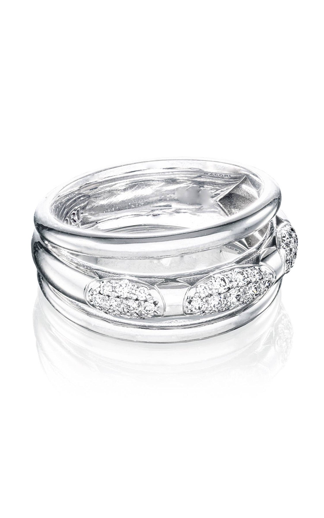 Three 18k gold bands, joined at the peripheral resting point of the ring, create a charming stacked effect. The center band is studded with the Tacori crescent in three ellipse-shape patterns of round brilliant Diamonds.