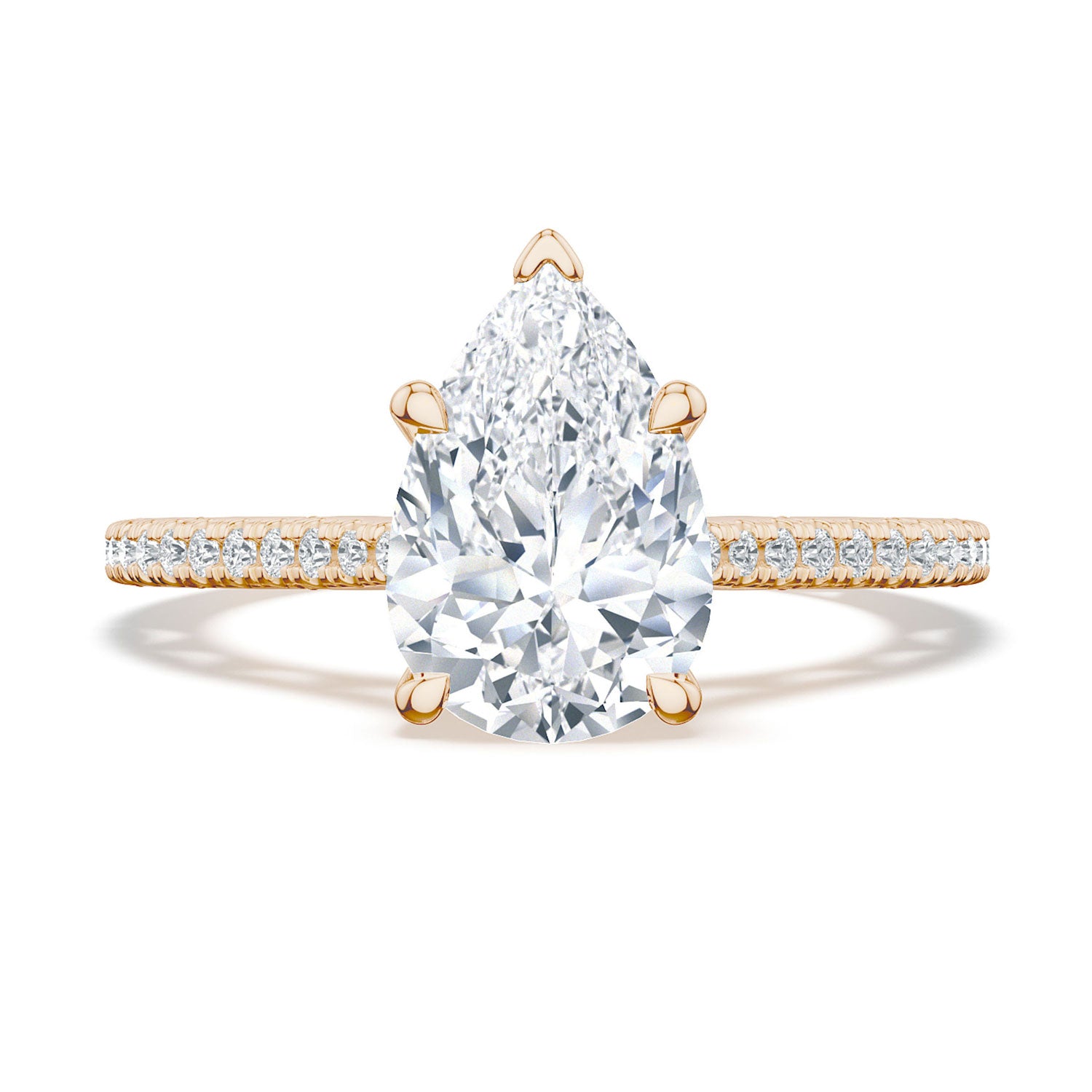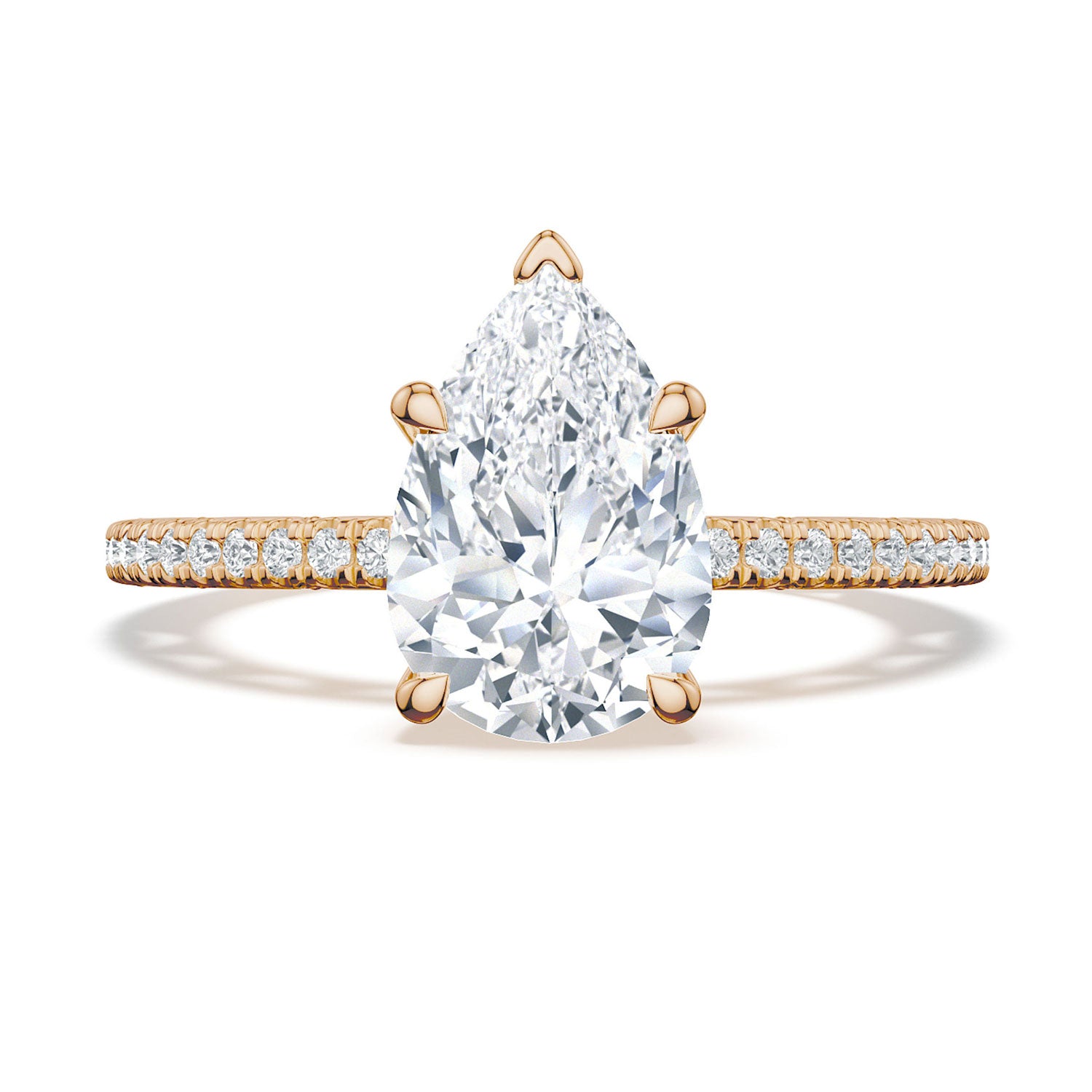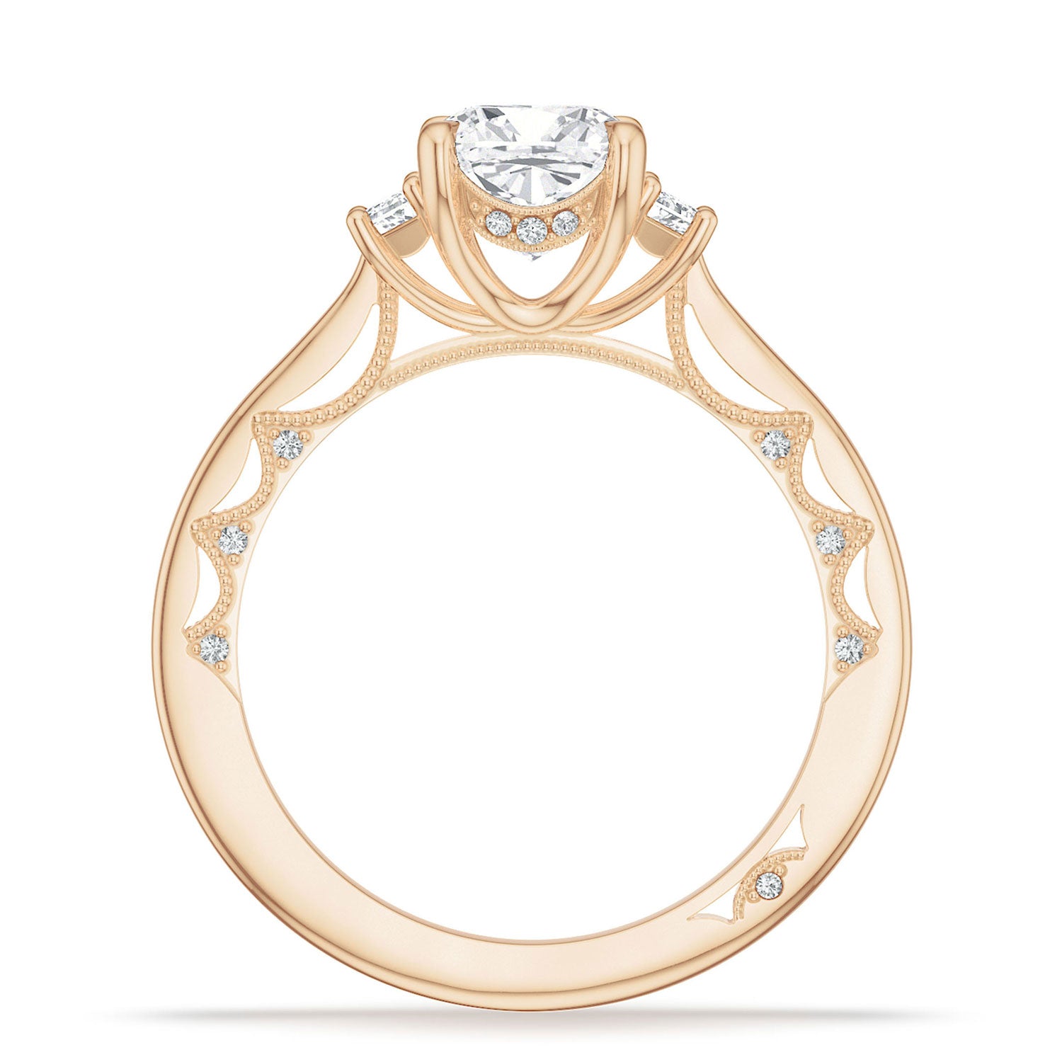A Princess Solitaire is set into an 18kt Rose Gold foundation. Masterfully set round brilliant diamonds trace up the ceiling and hand-hewn beading adds texture to the silhouette.