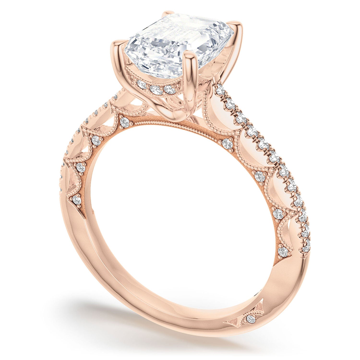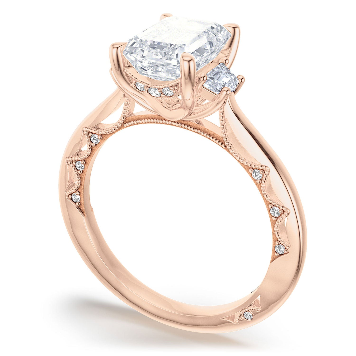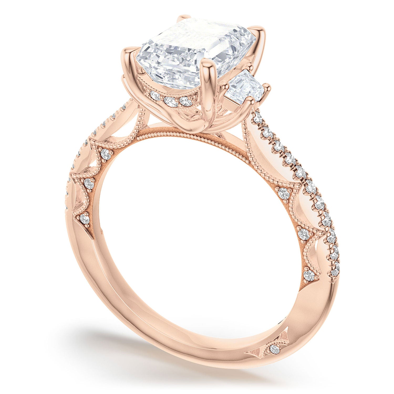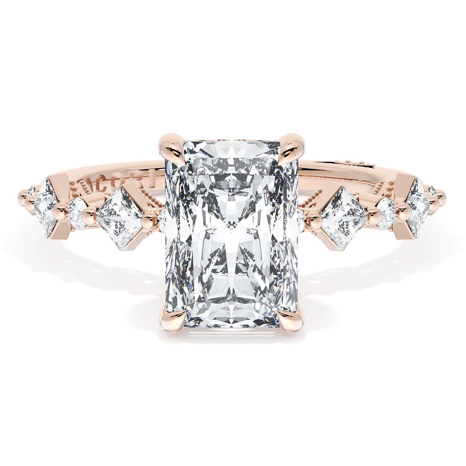 A Radiant Solitaire is set into an 18kt Rose Gold foundation. Alternating carré and round brilliant diamonds trace up the ceiling and hand-hewn beading adds texture to the silhouette.