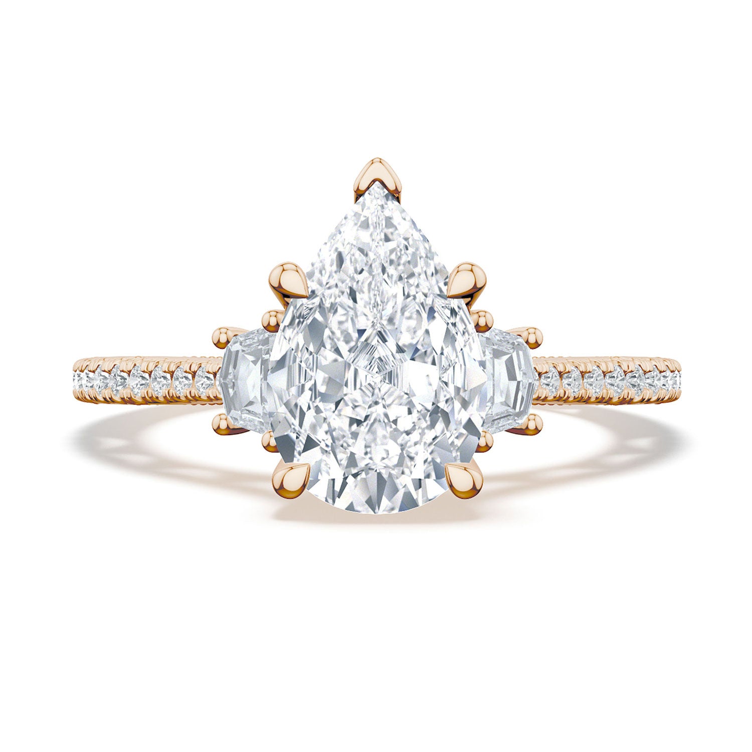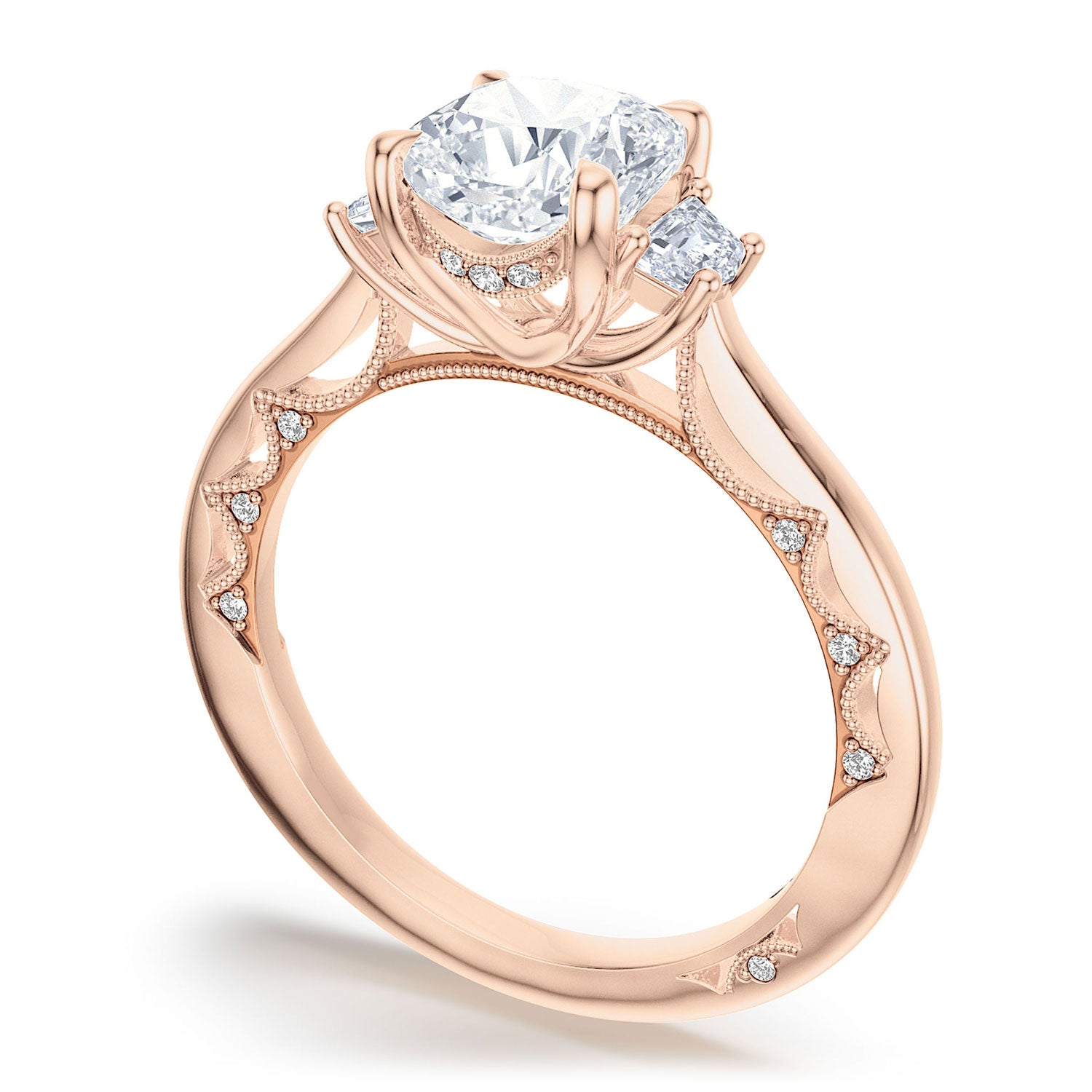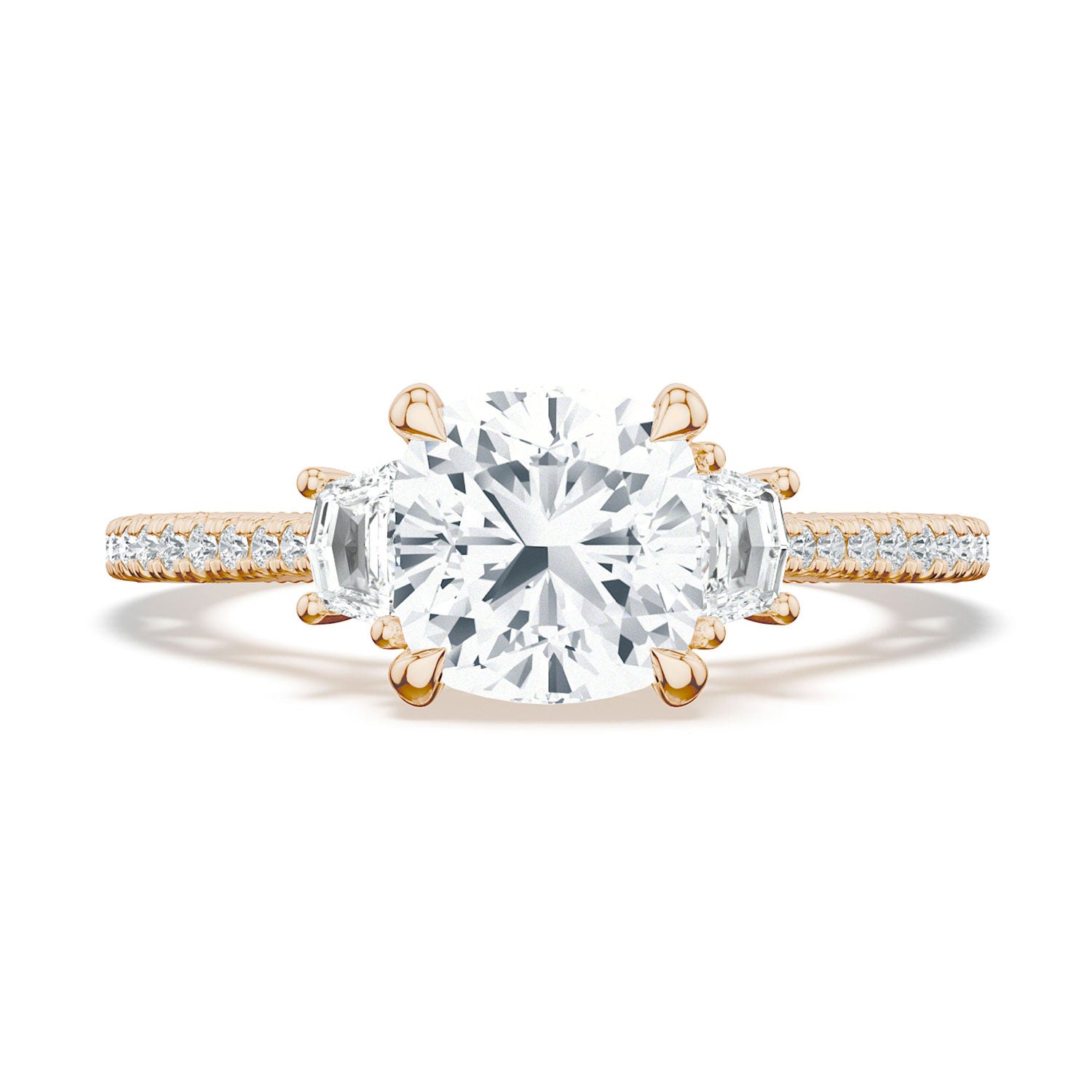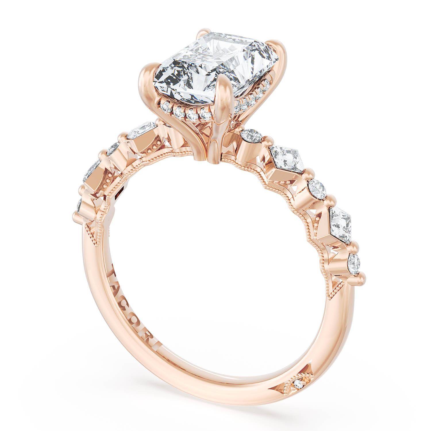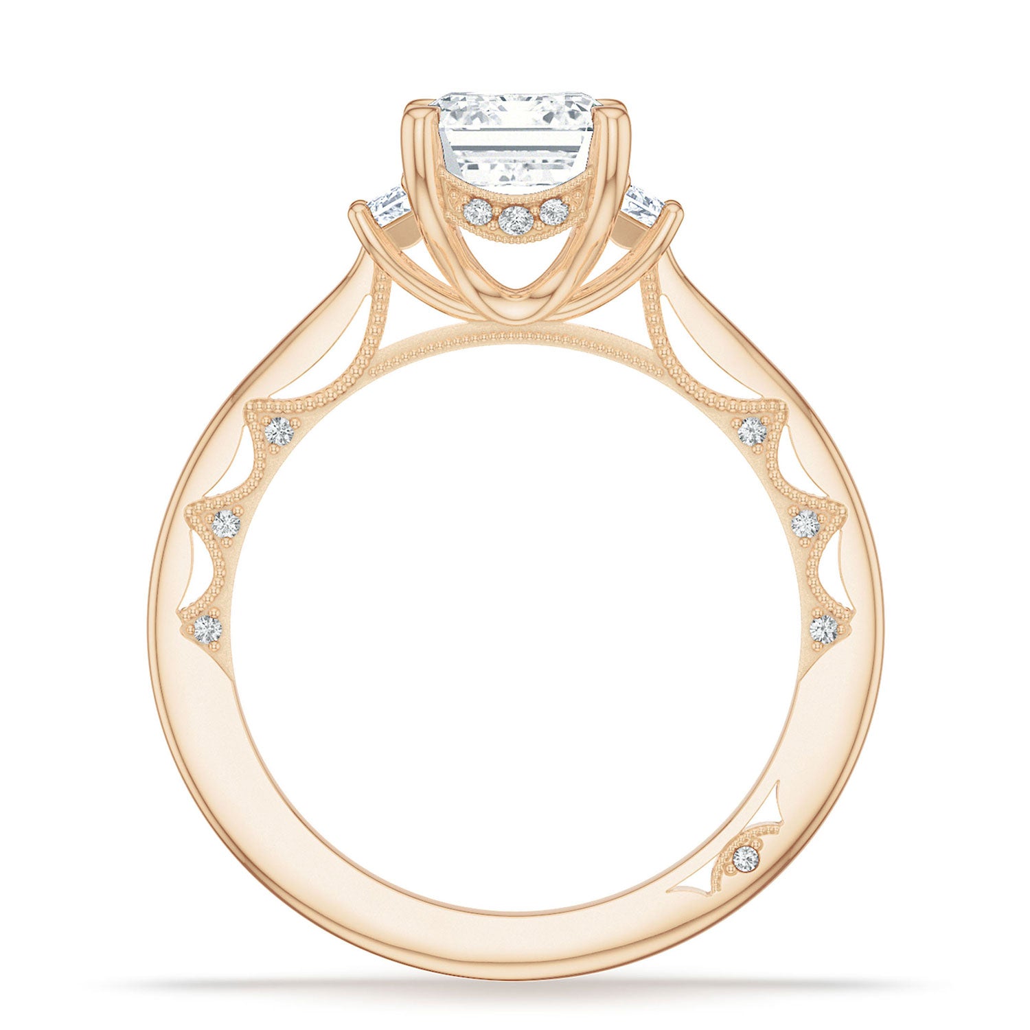 A Radiant Solitaire is set into an 18kt Rose Gold foundation. Alternating carré and round brilliant diamonds trace up the ceiling and hand-hewn beading adds texture to the silhouette.