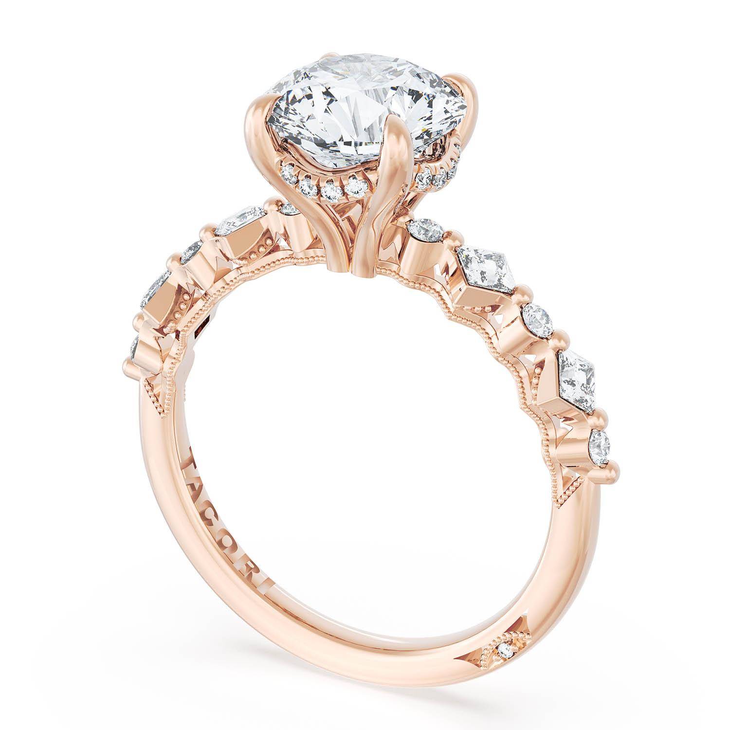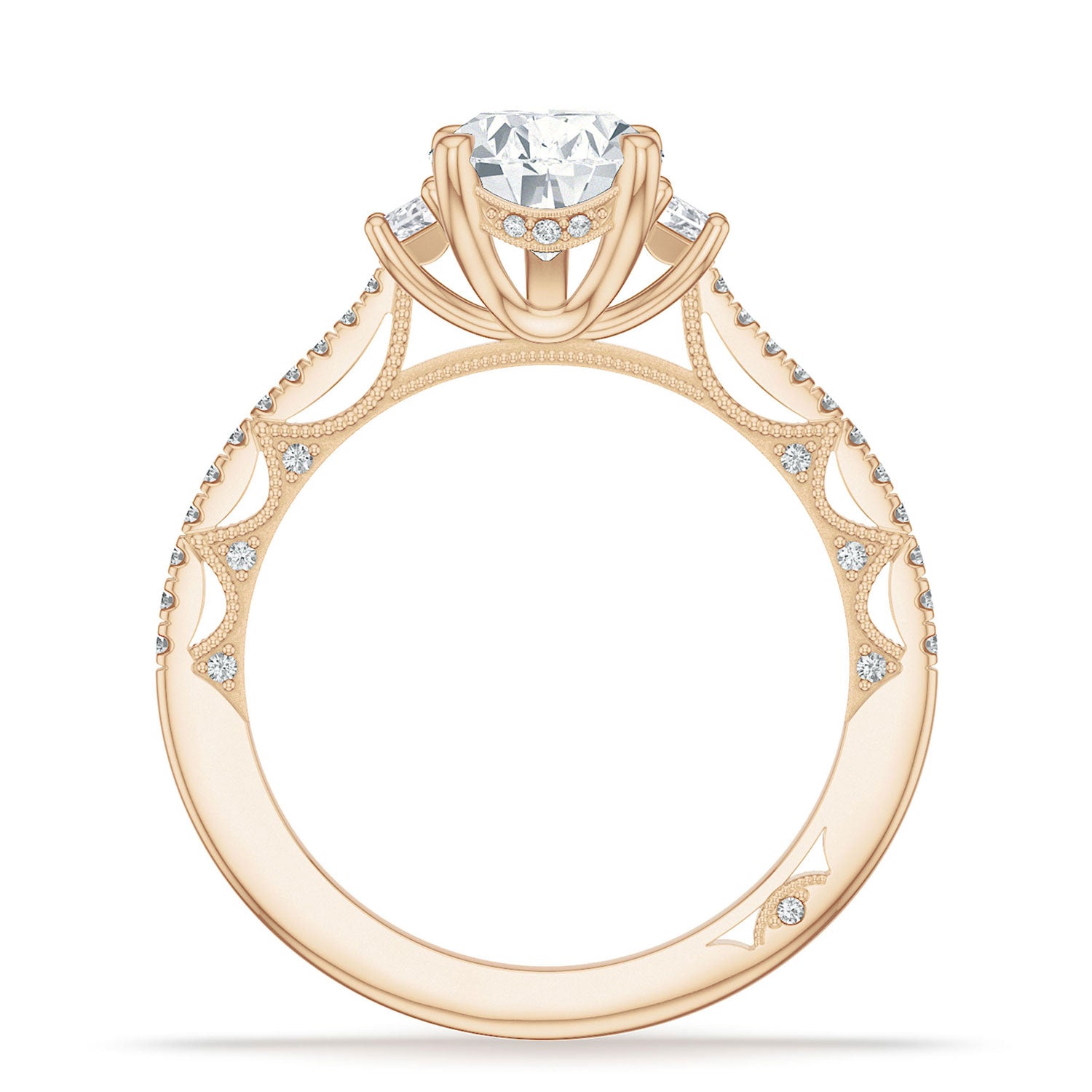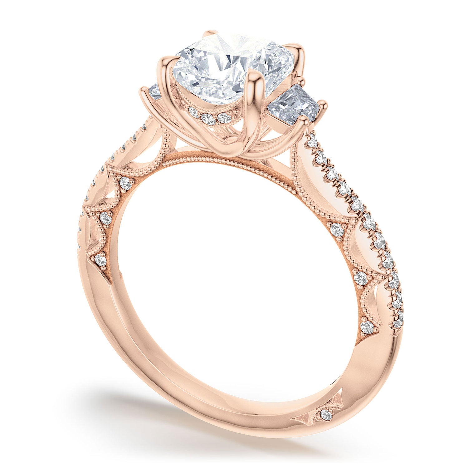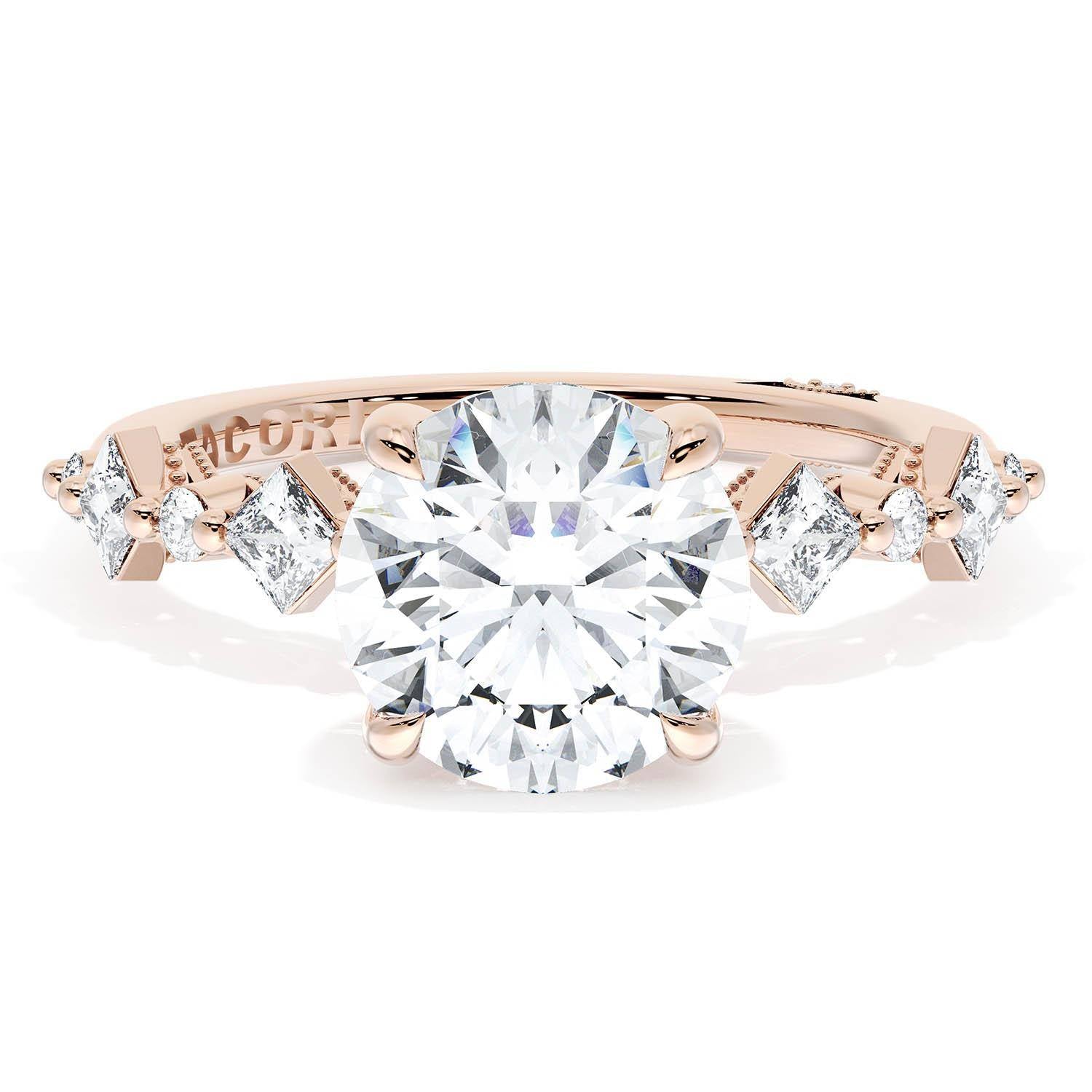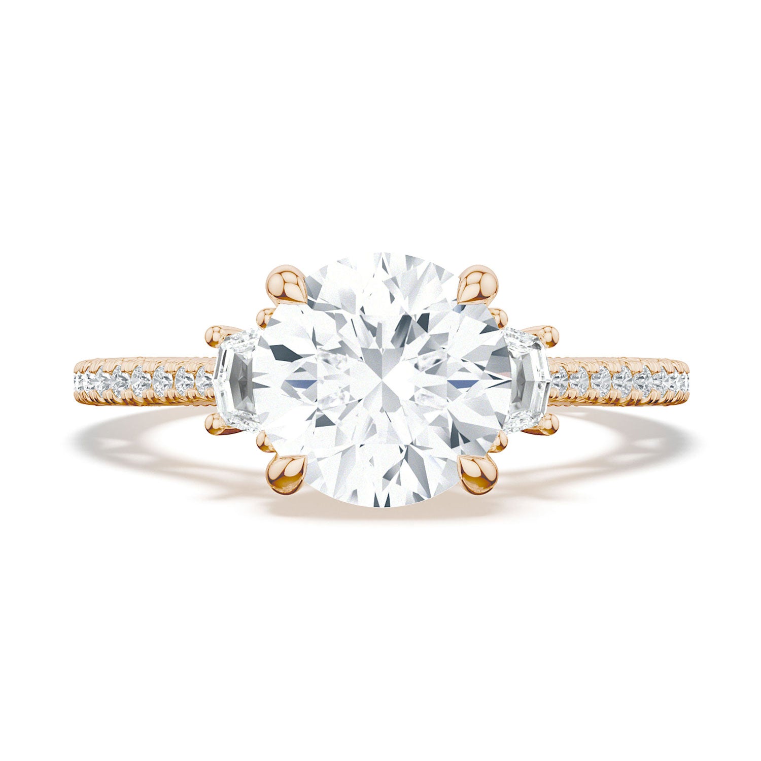 A Round Solitaire is set into an 18kt Rose Gold foundation. Alternating carré and round brilliant diamonds trace up the ceiling and hand-hewn beading adds texture to the silhouette.