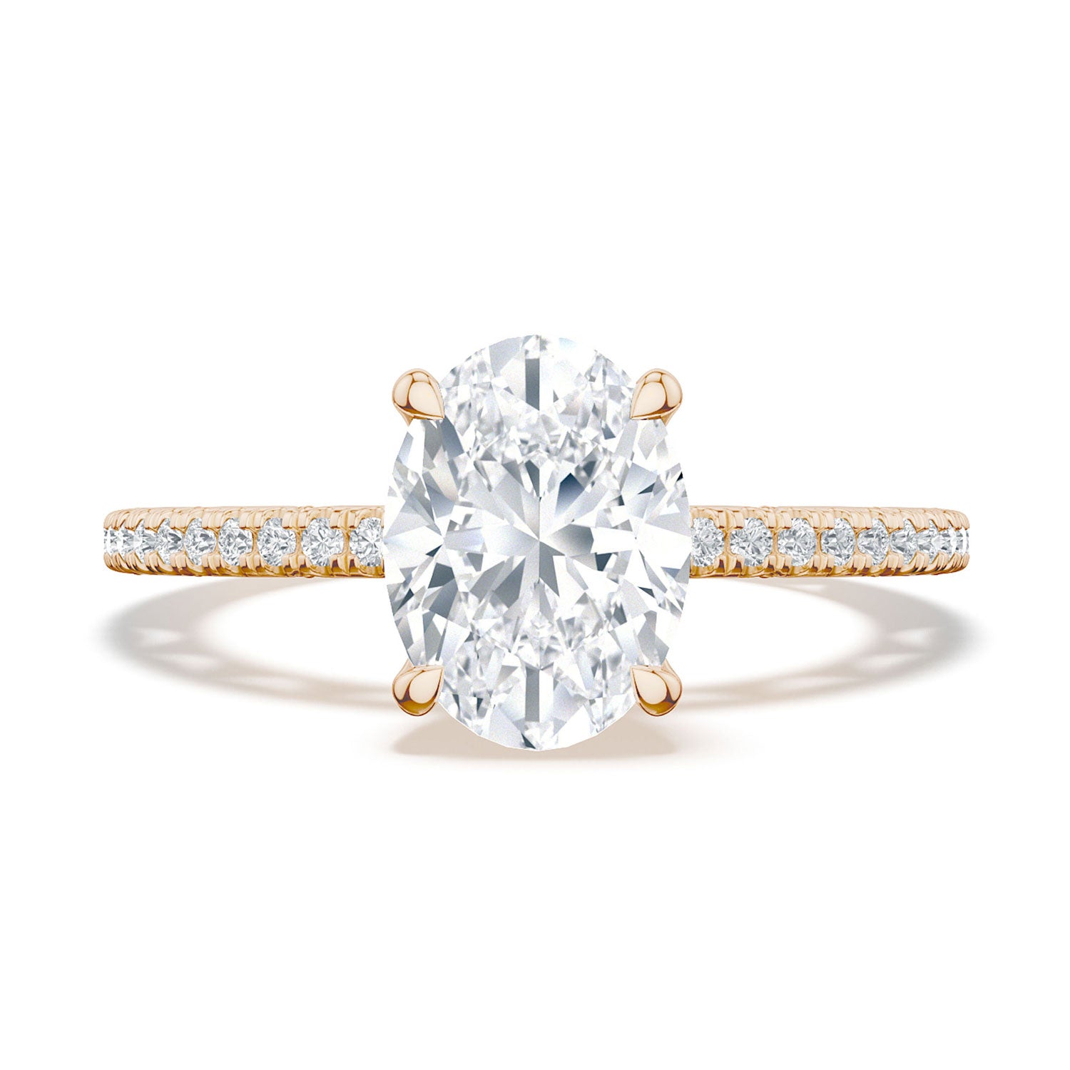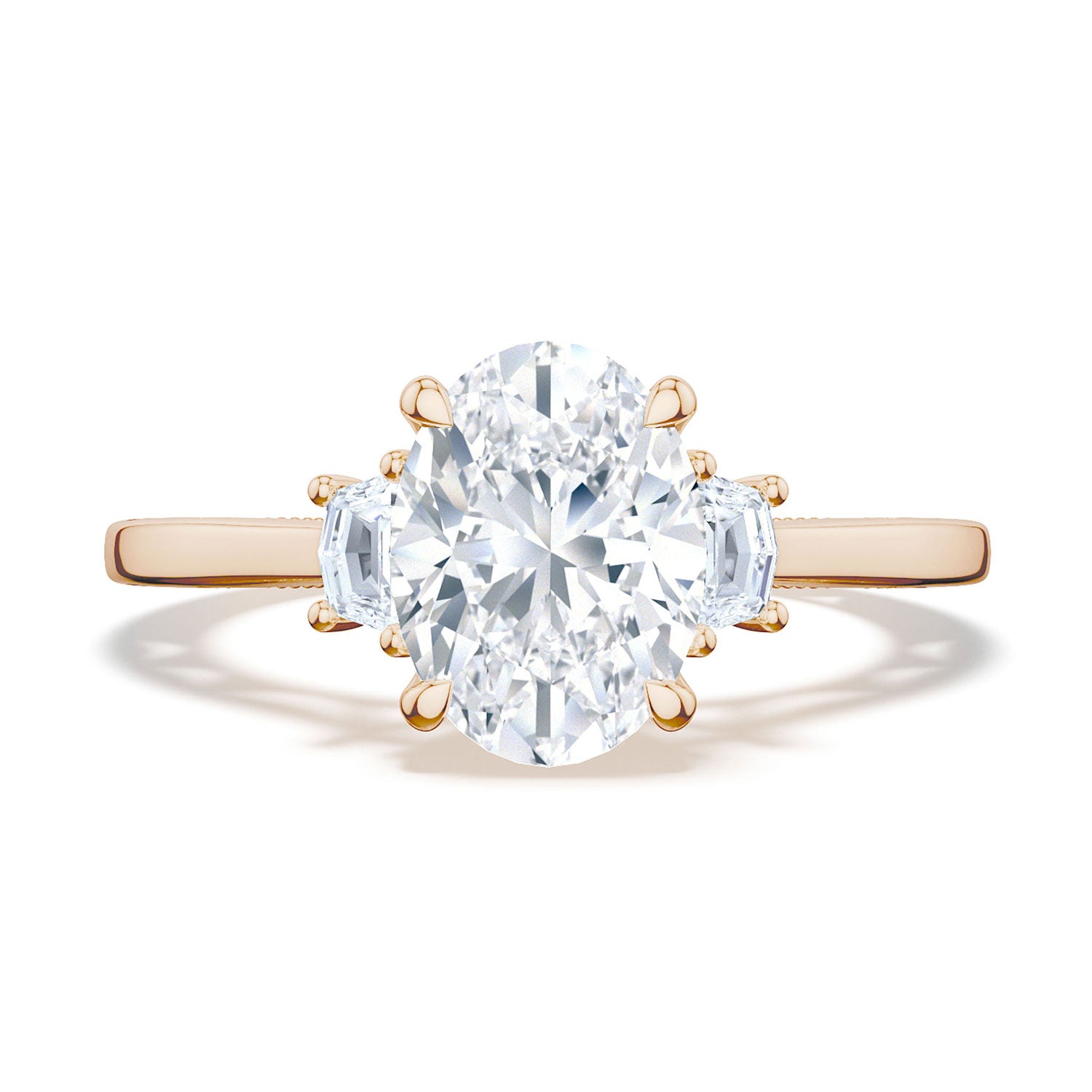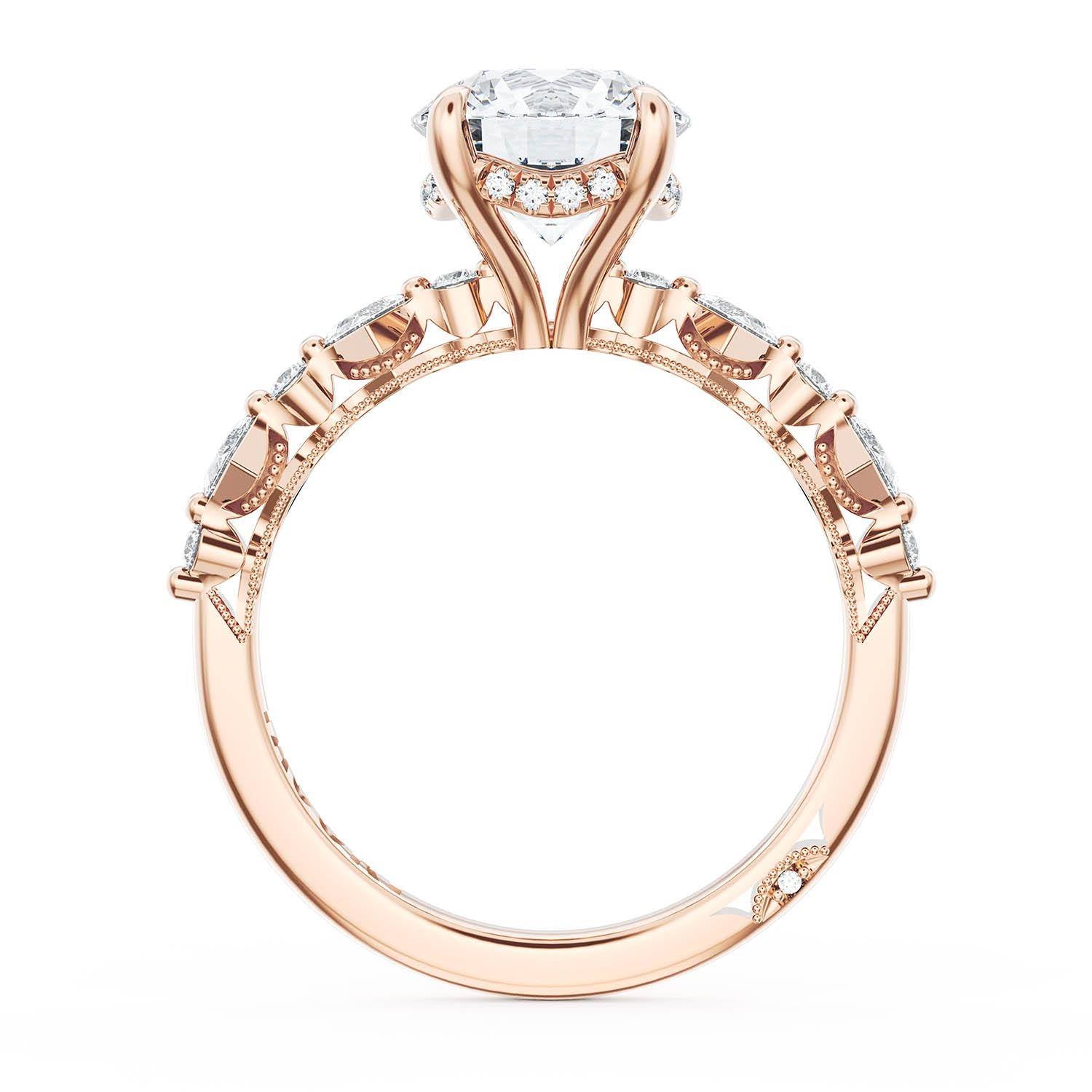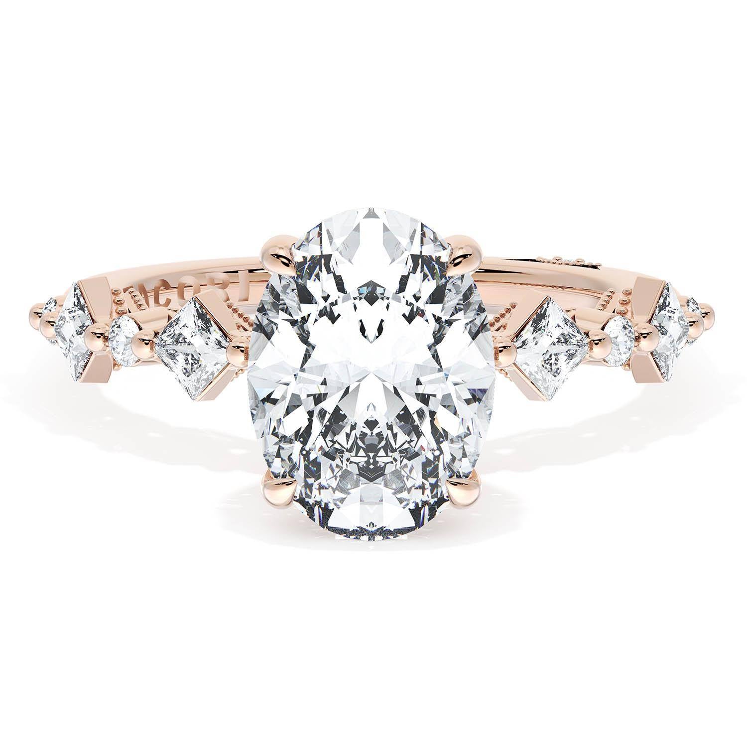 An Oval Solitaire is set into an 18kt Rose Gold foundation. Alternating carré and round brilliant diamonds trace up the ceiling and hand-hewn beading adds texture to the silhouette.