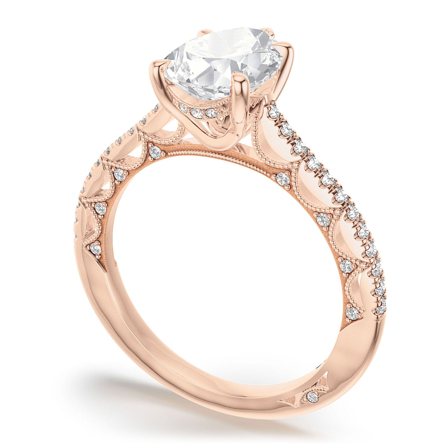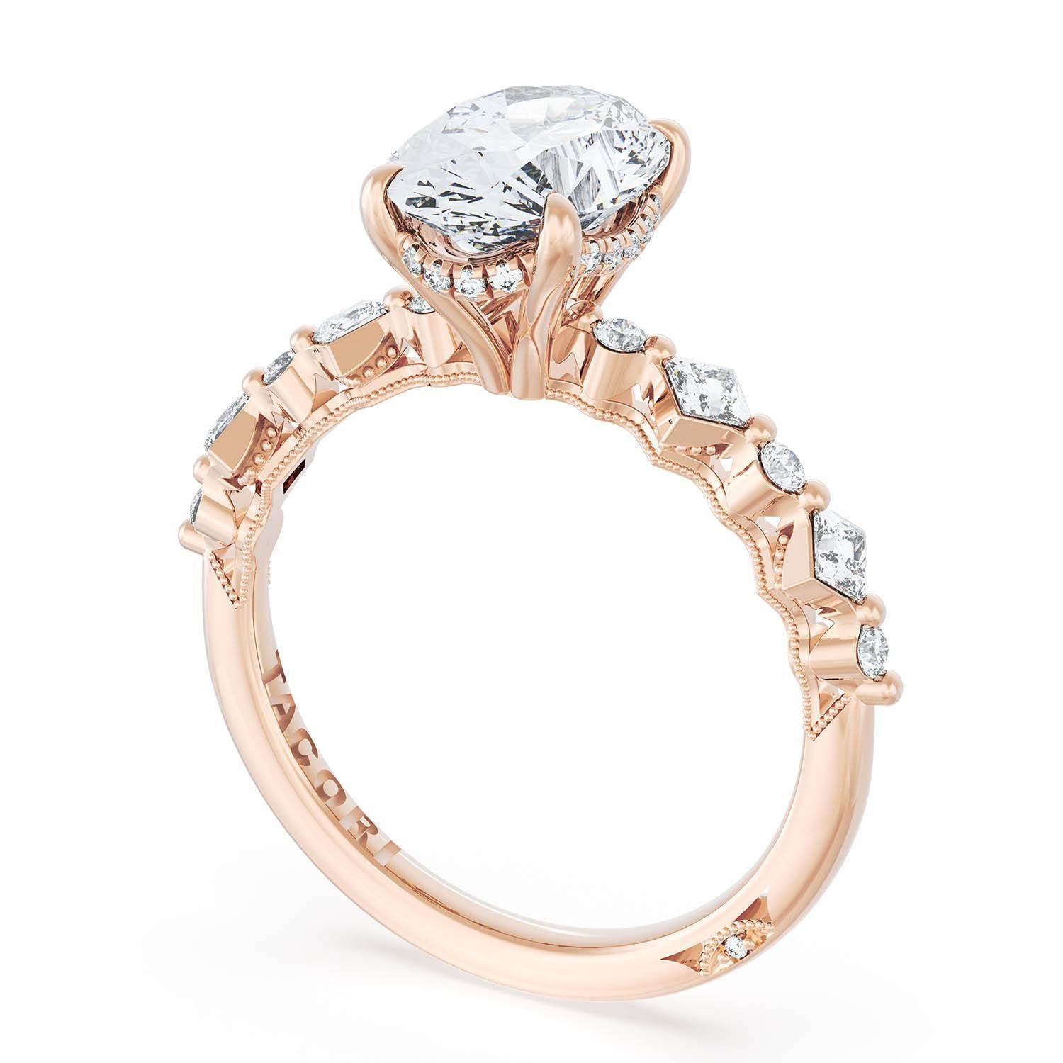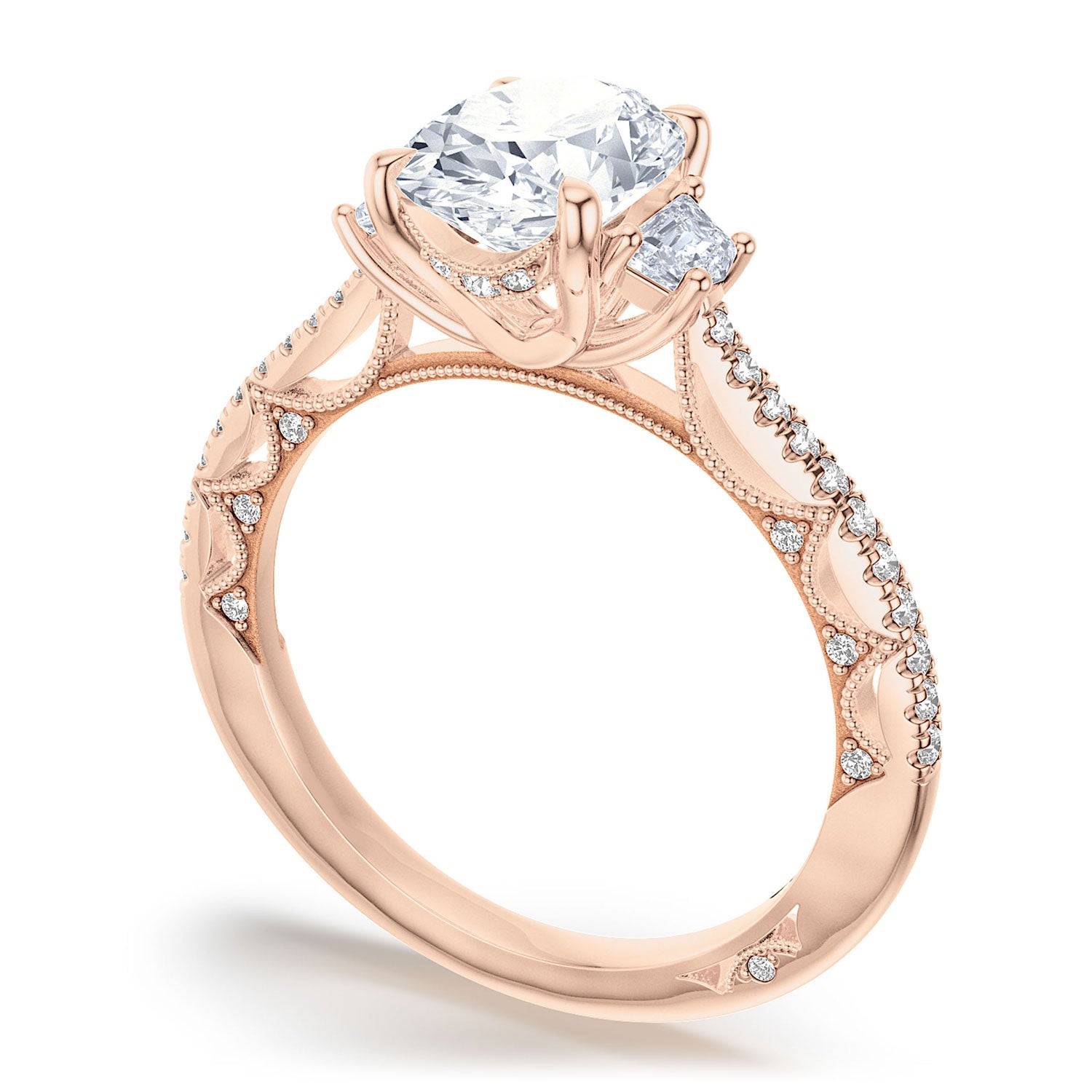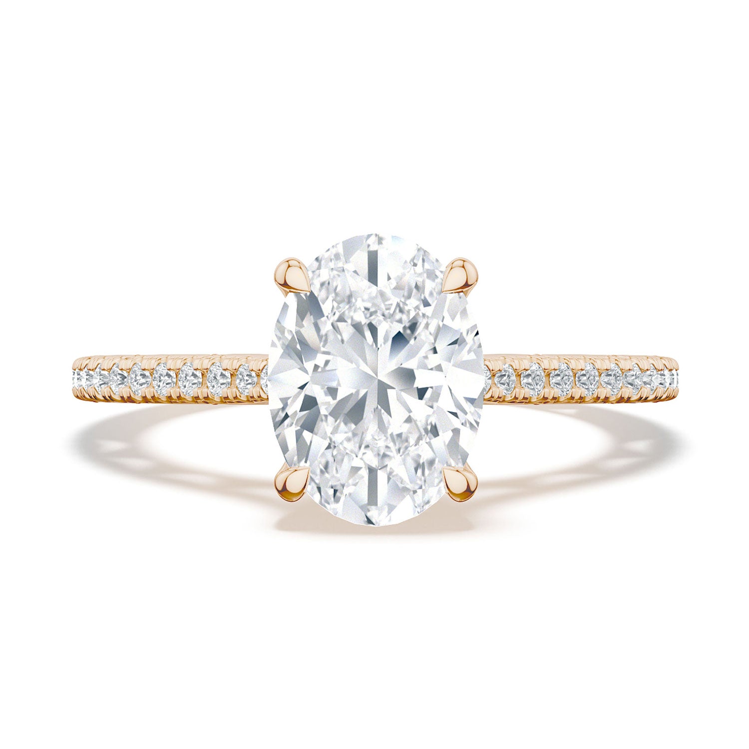 An Oval Solitaire is set into an 18kt Rose Gold foundation. Alternating carré and round brilliant diamonds trace up the ceiling and hand-hewn beading adds texture to the silhouette.