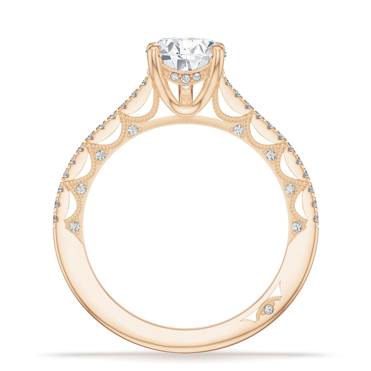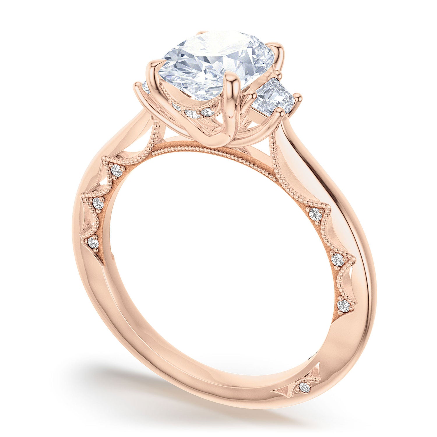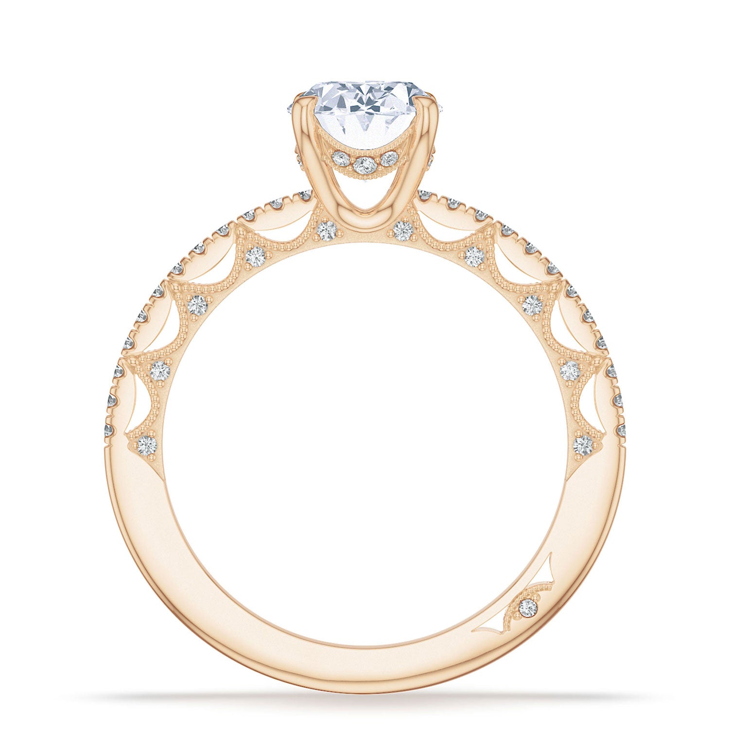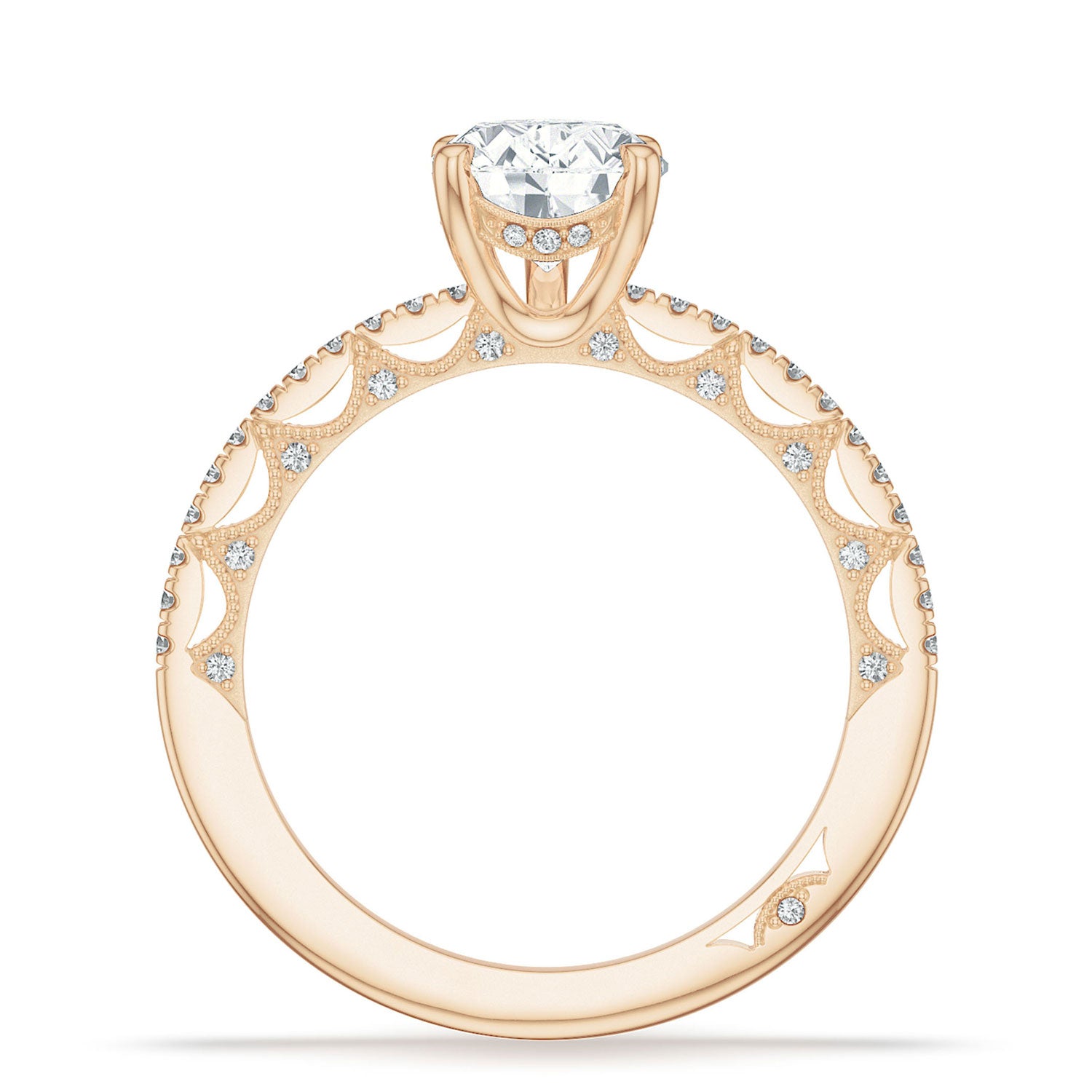 An Oval Solitaire is set into an 18kt Rose Gold foundation. Alternating carré and round brilliant diamonds trace up the ceiling and hand-hewn beading adds texture to the silhouette.