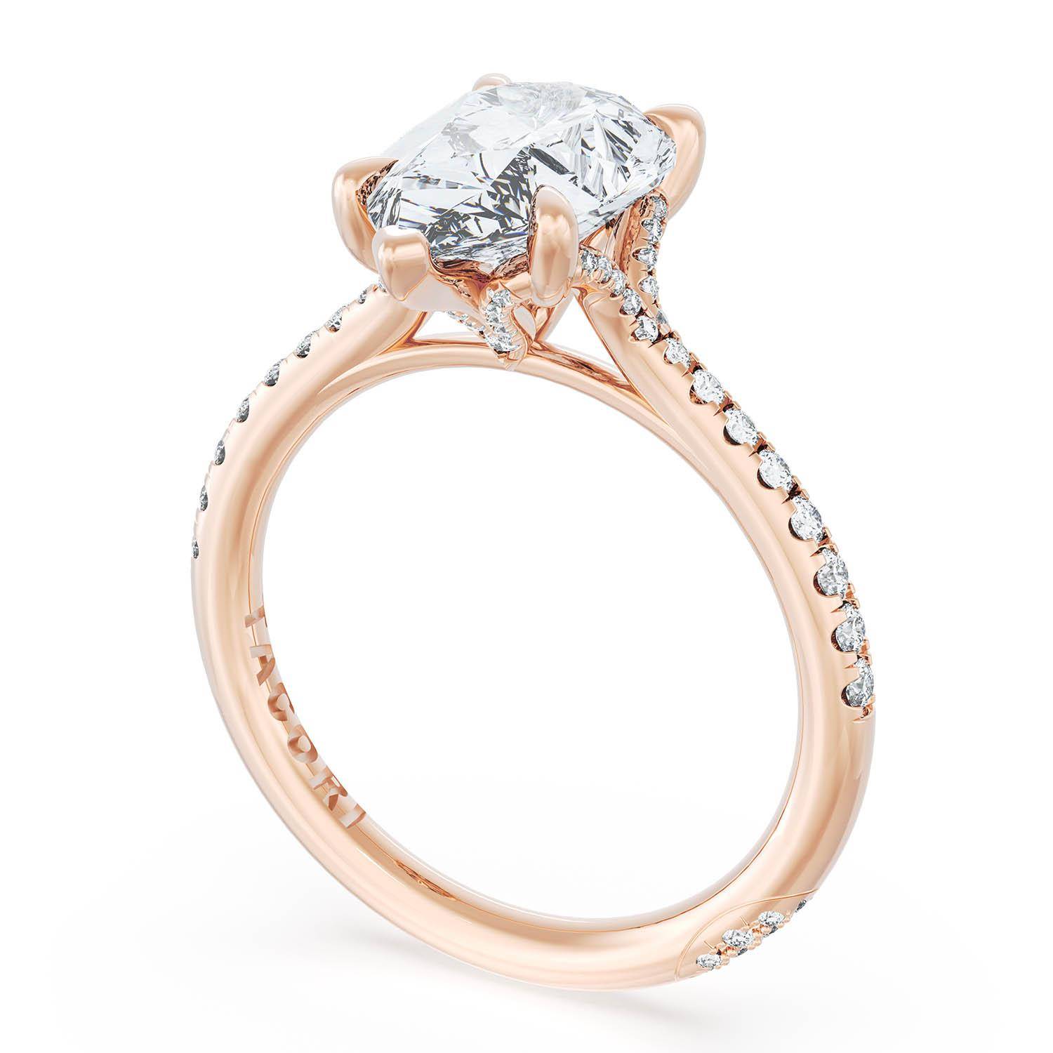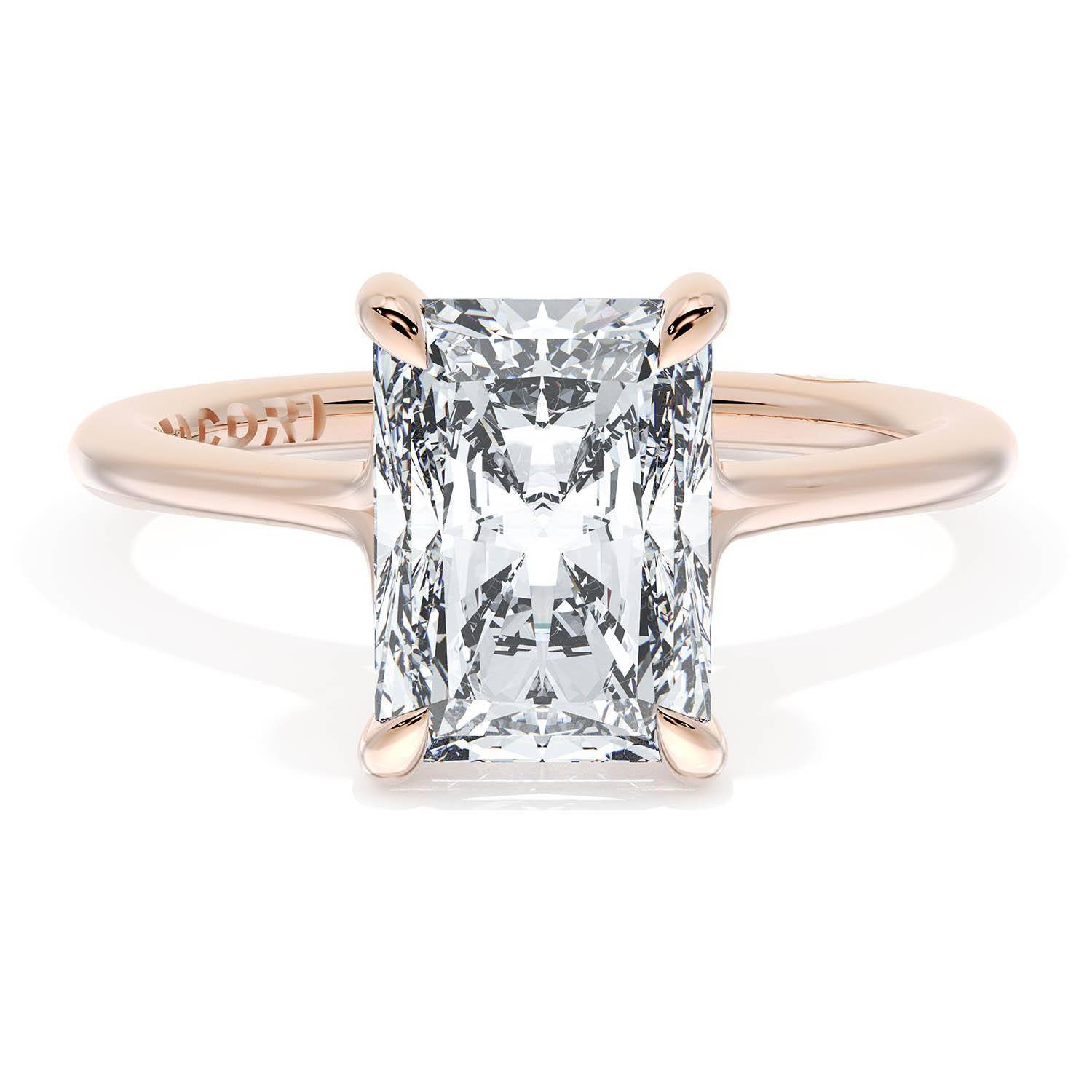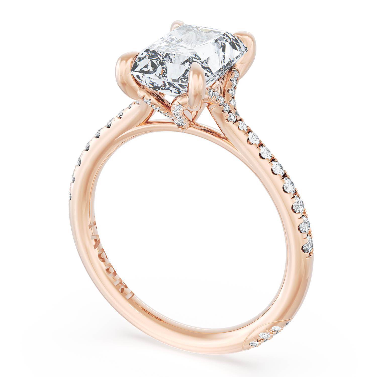 A Radiant Solitaire is set into a unique corset-inspired crown on a high-polish 18kt Rose Gold foundation. A diamond-studded Founder's Crescent marks the resting point.