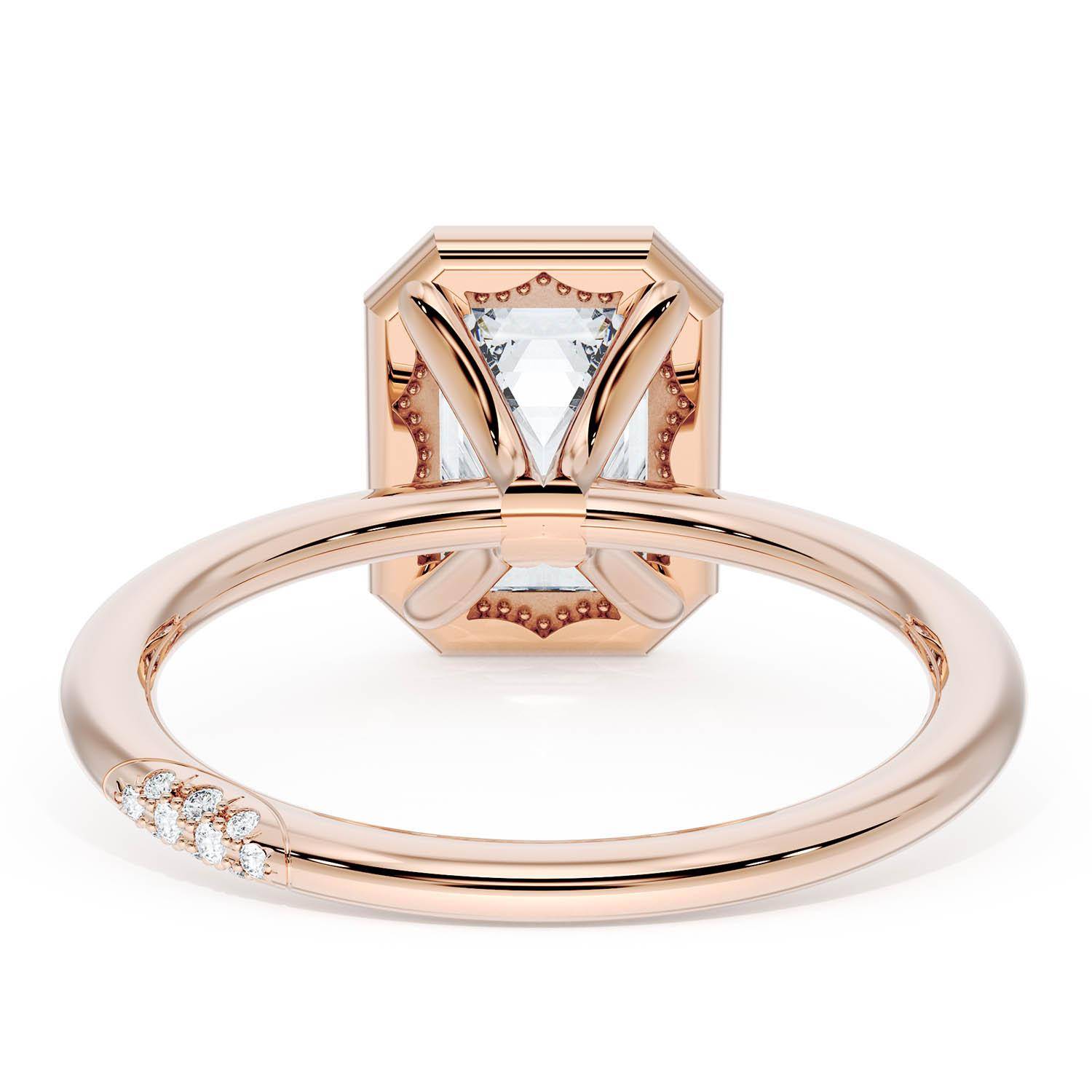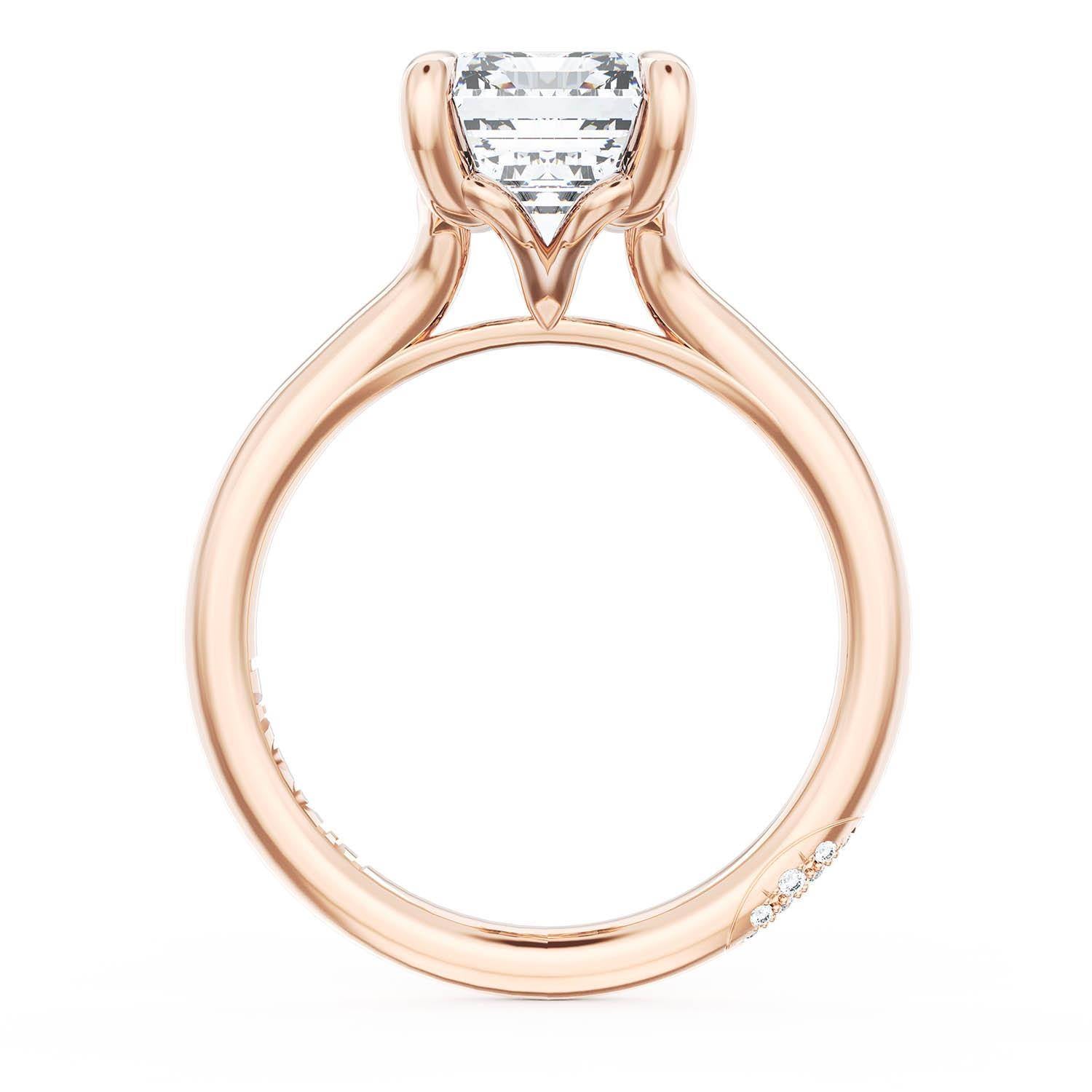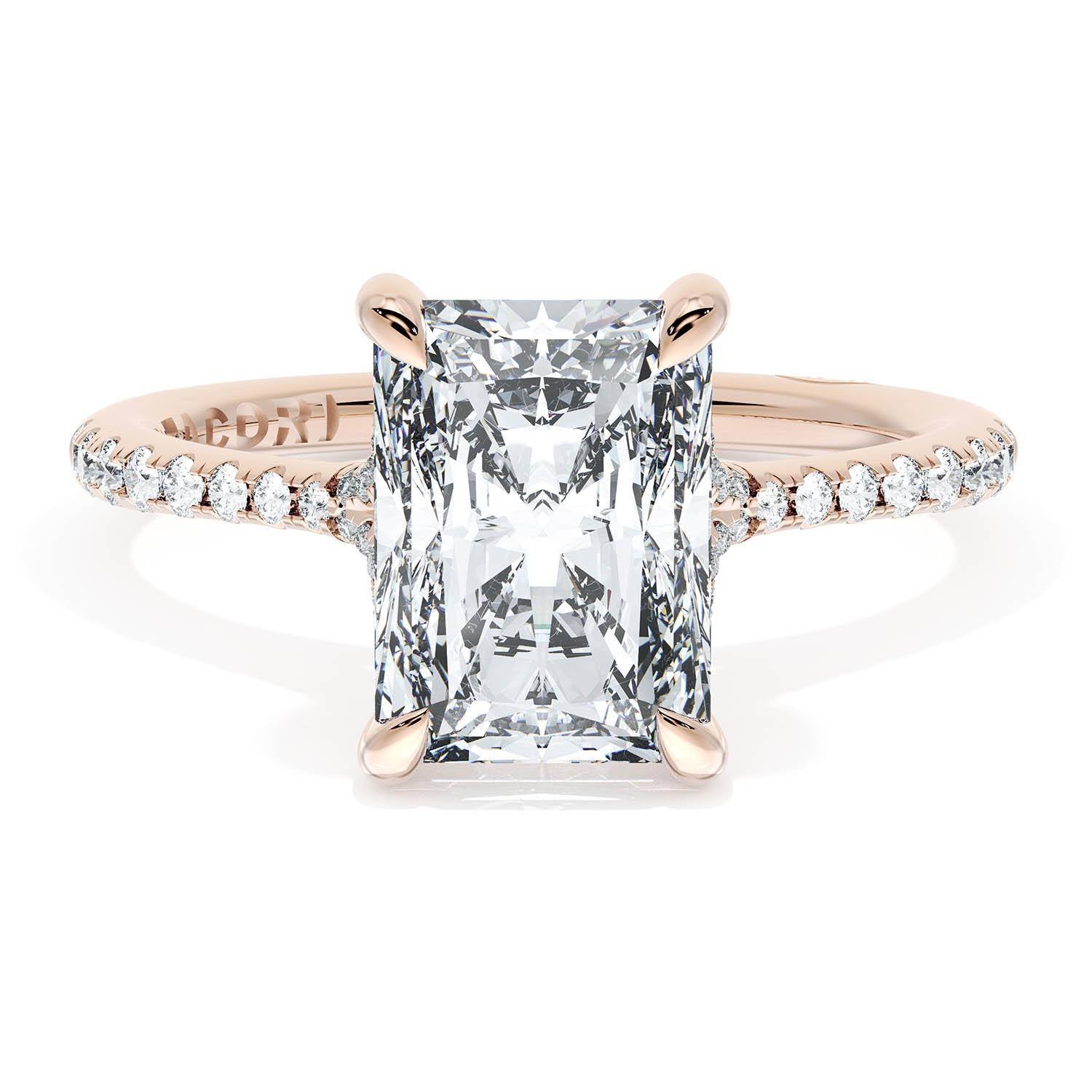 A Radiant Solitaire is set into a unique corset-inspired crown on a high-polish 18kt Rose Gold foundation. A diamond-studded Founder's Crescent marks the resting point.