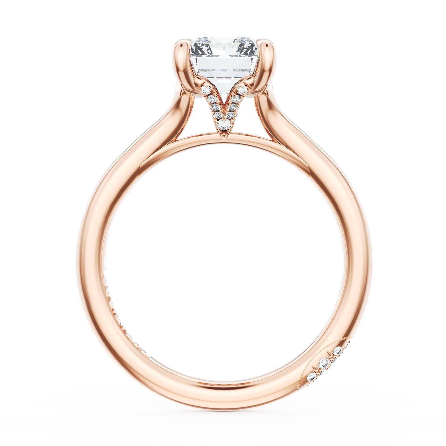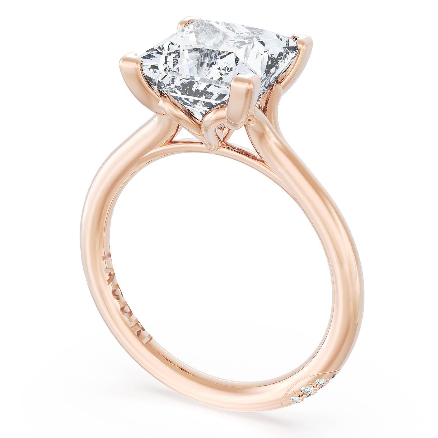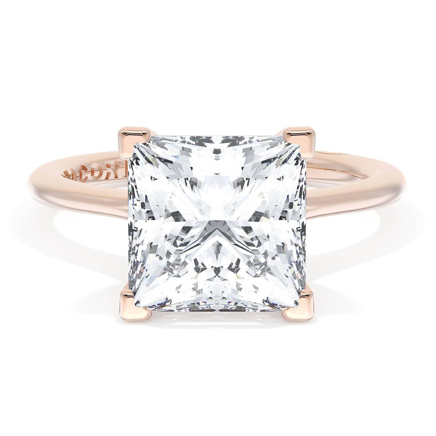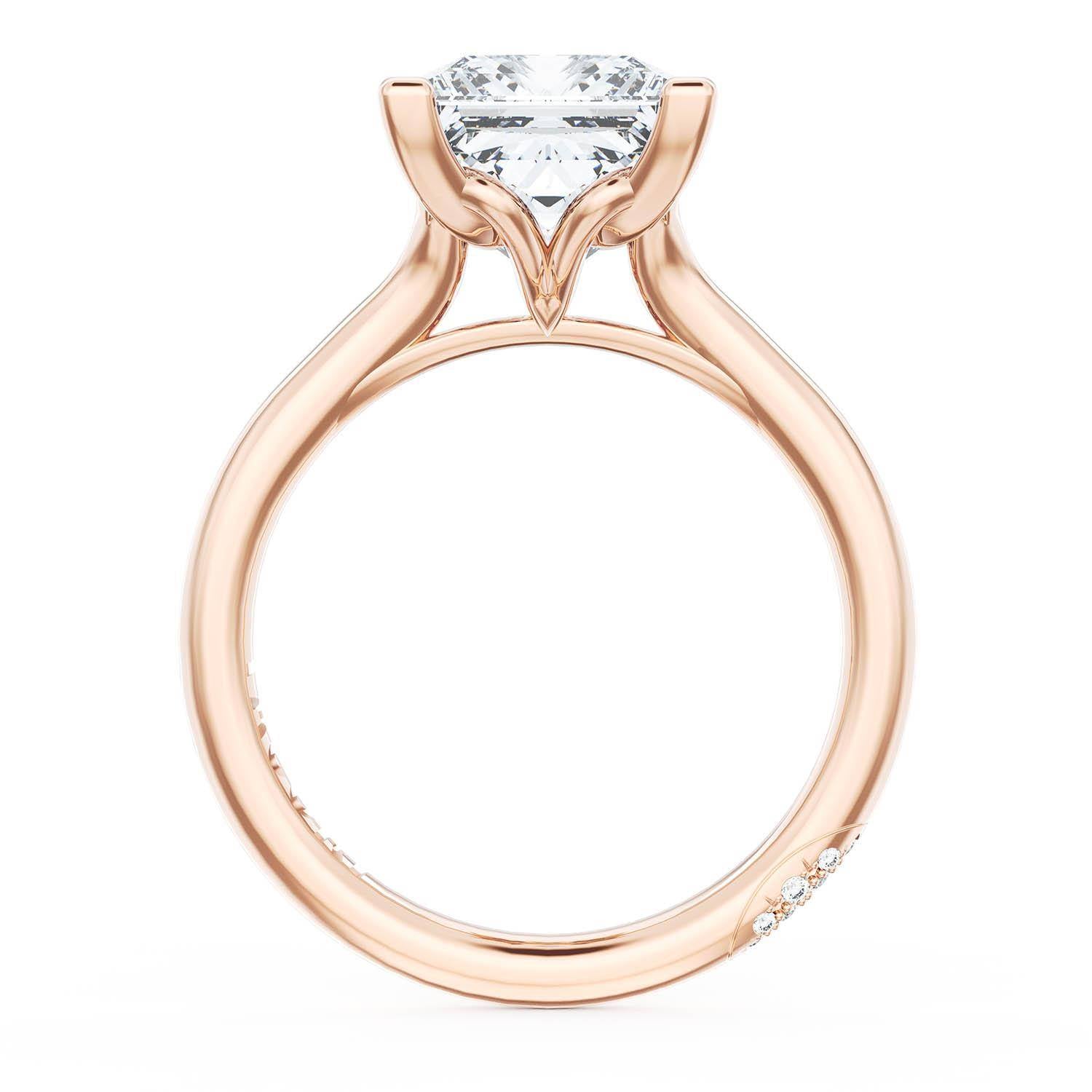 A Princess Solitaire is set into a unique diamond-studded, corset-inspired crown on a high-polish 18kt Rose Gold foundation. A diamond-studded Founder's Crescent marks the resting point.