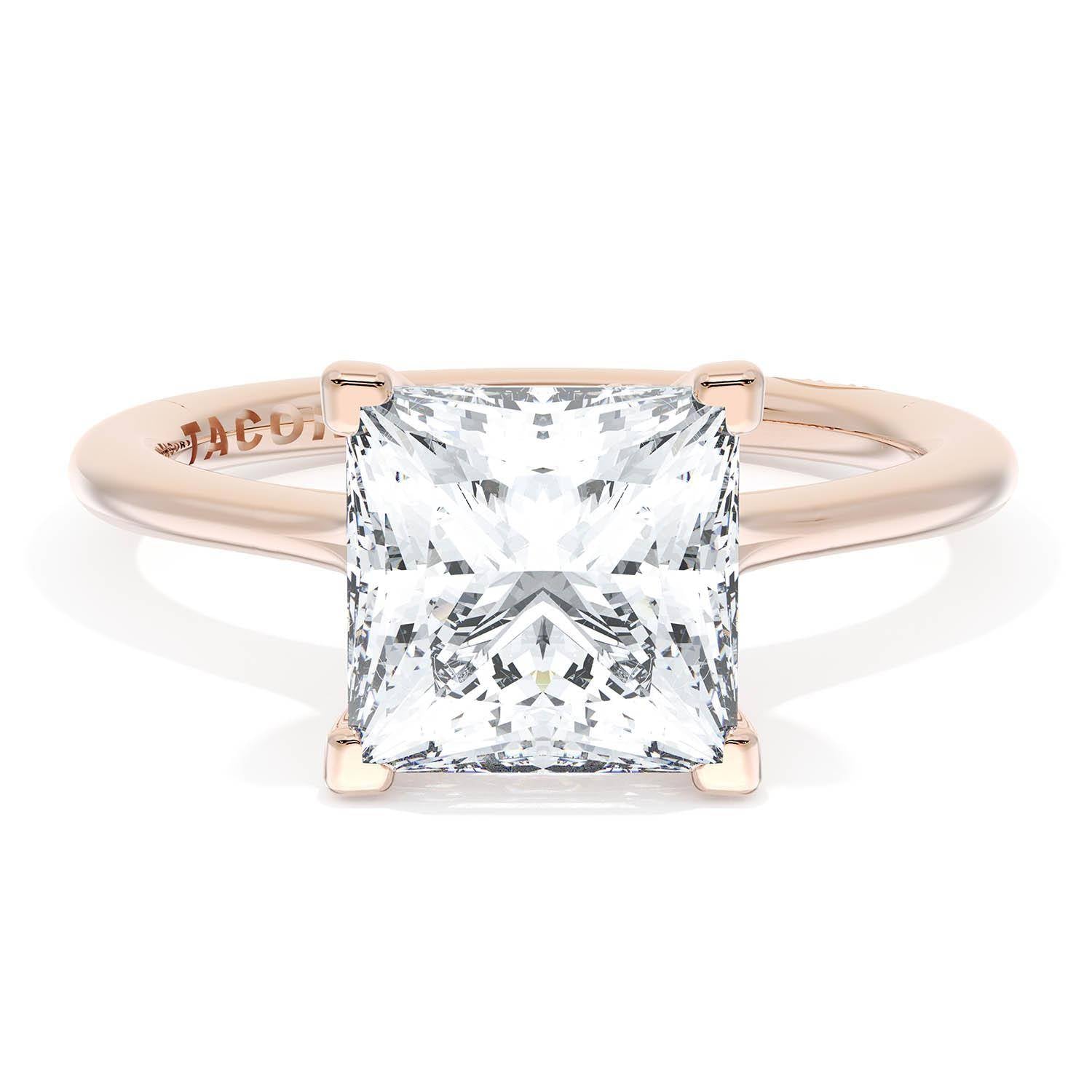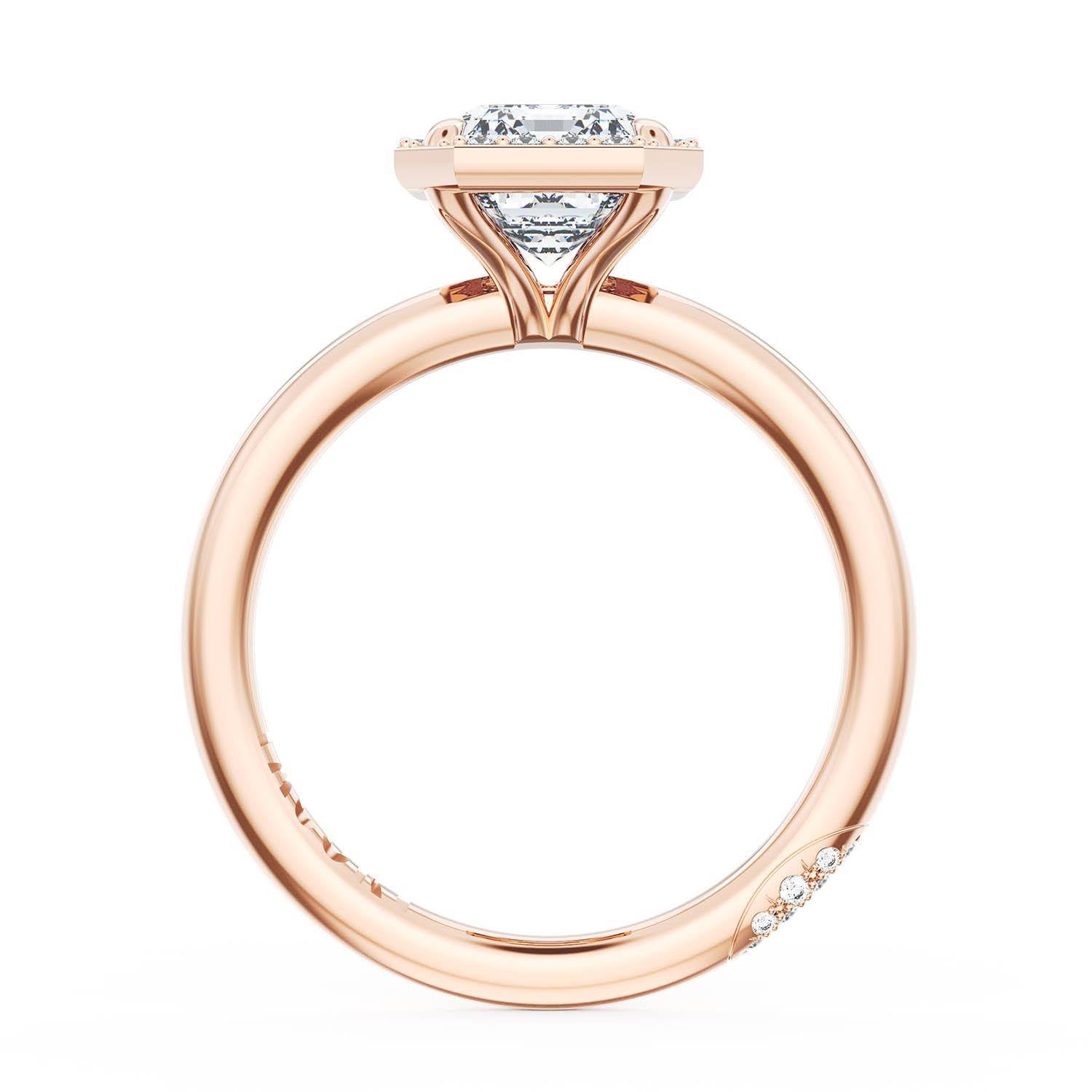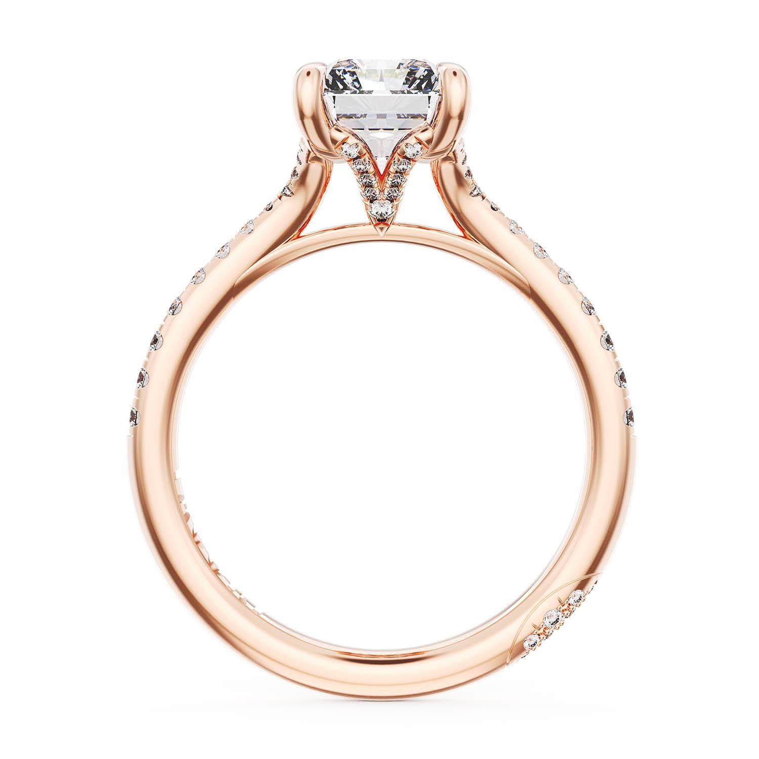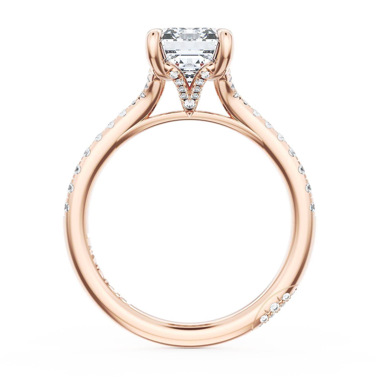 A Princess Solitaire is set into a unique diamond-studded, corset-inspired crown on a high-polish 18kt Rose Gold foundation. A diamond-studded Founder's Crescent marks the resting point.