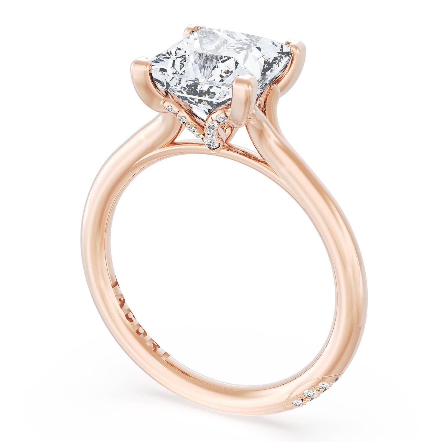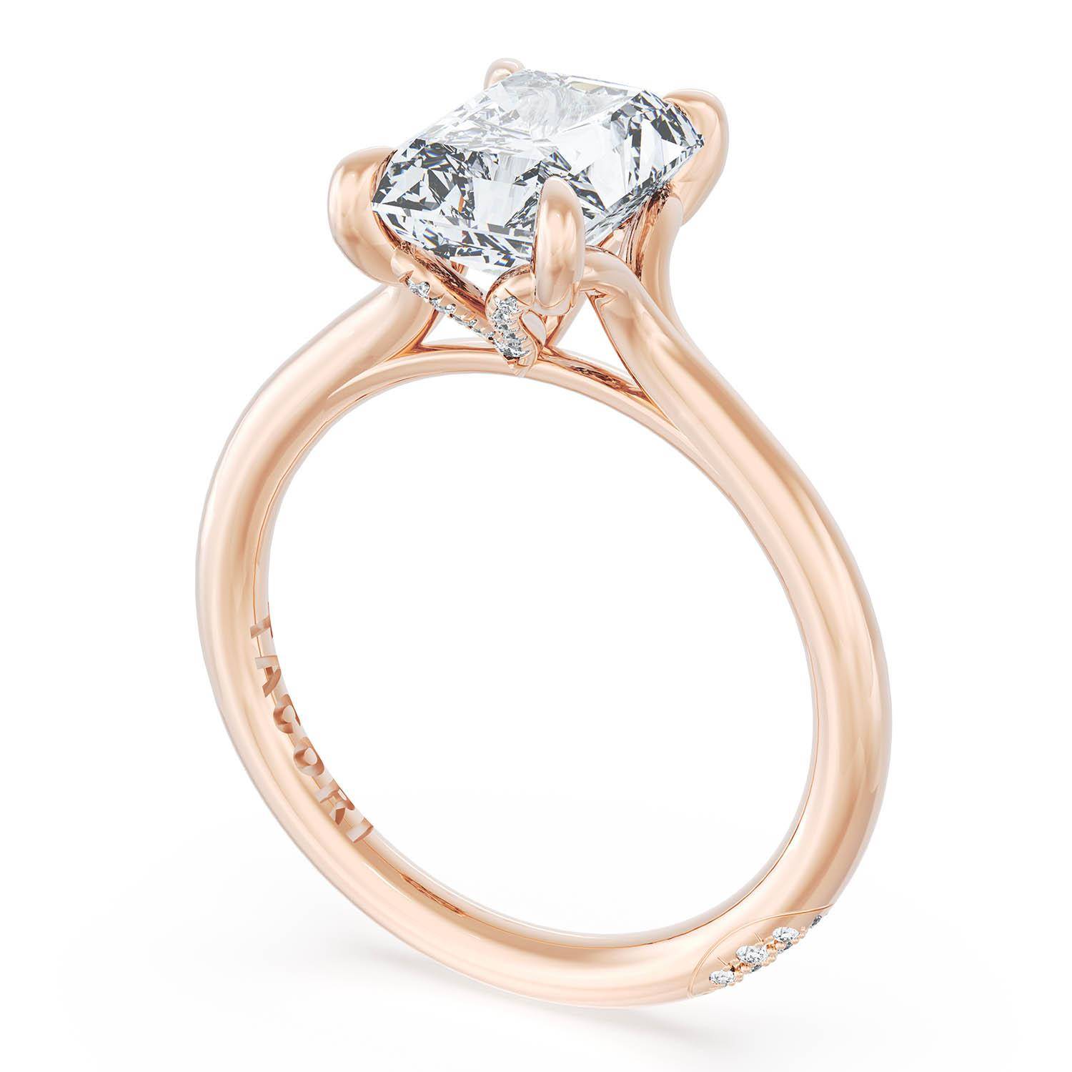 A Radiant Solitaire is set into a unique diamond-studded, corset-inspired crown on a high-polish 18kt Rose Gold foundation. A diamond-studded Founder's Crescent marks the resting point.