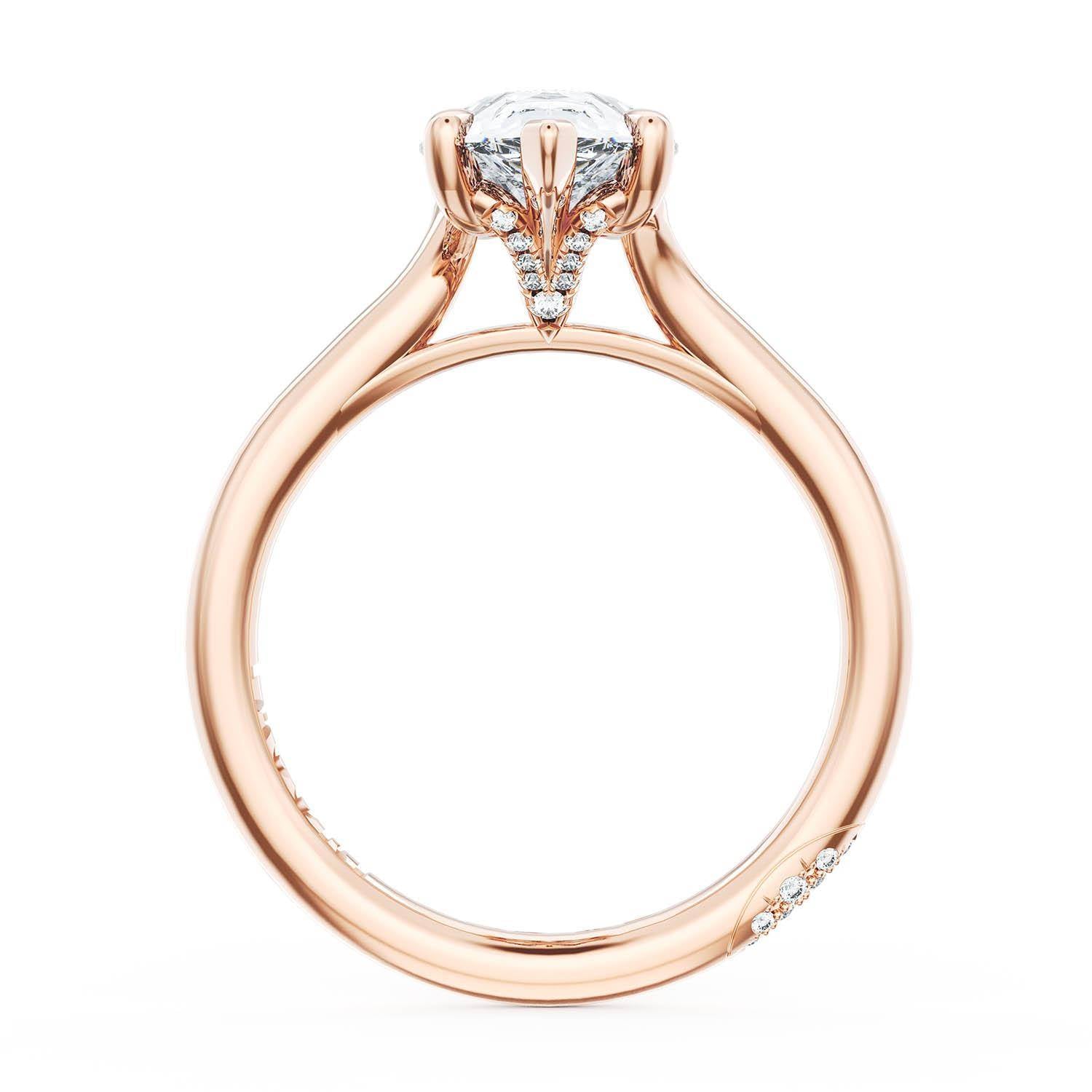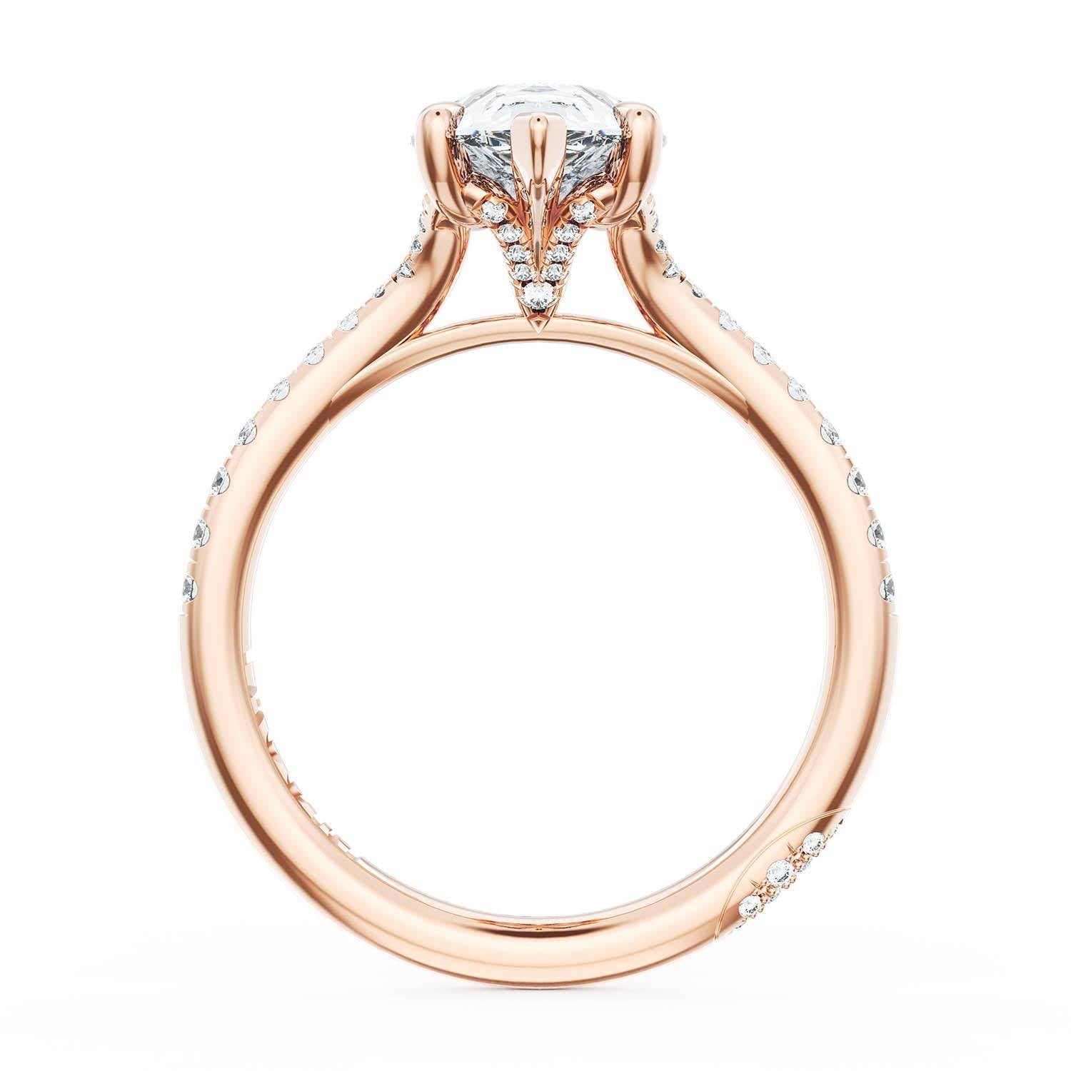 A Pear Solitaire is set into a unique diamond-studded, corset-inspired crown on a high-polish 18kt Rose Gold foundation. A diamond-studded Founder's Crescent marks the resting point.