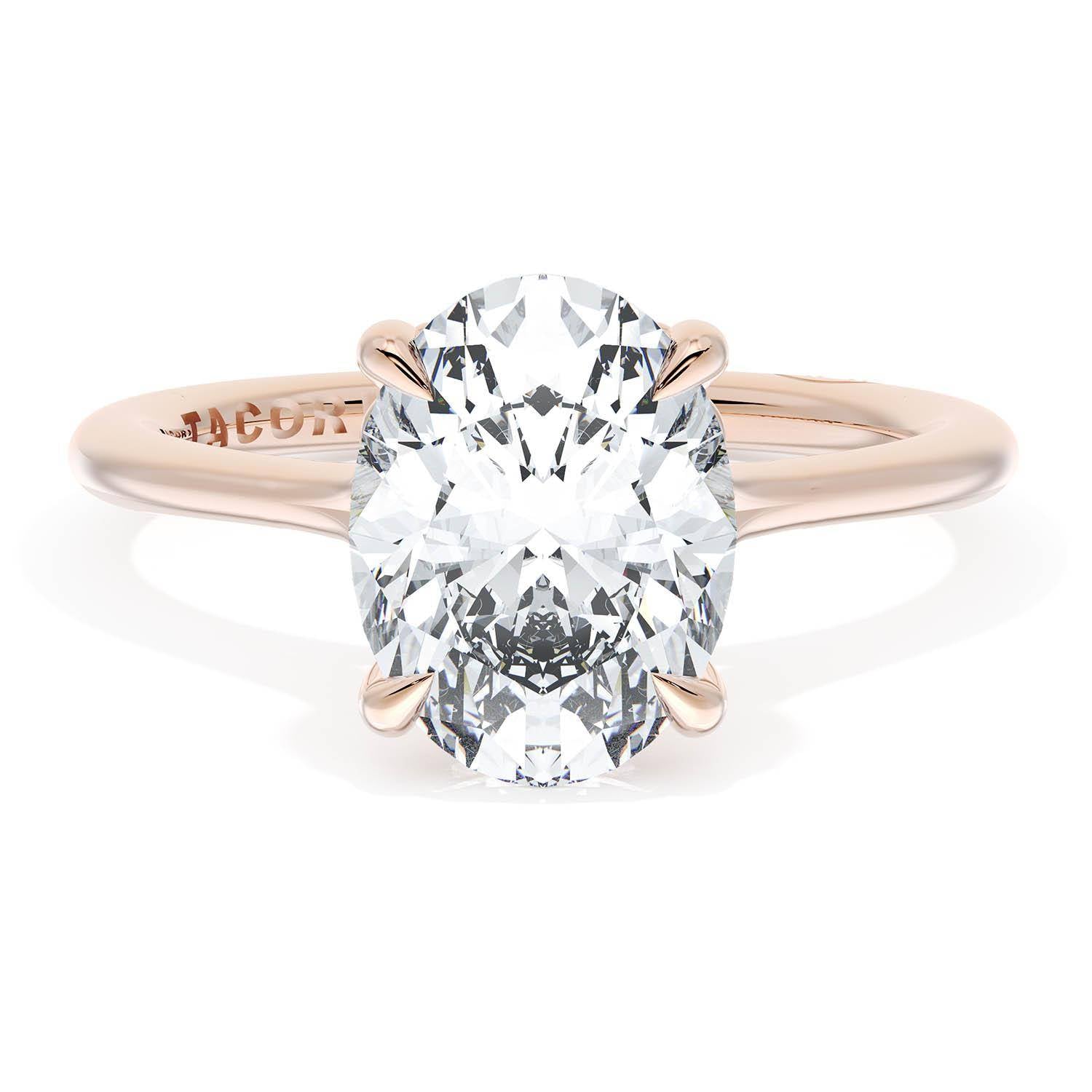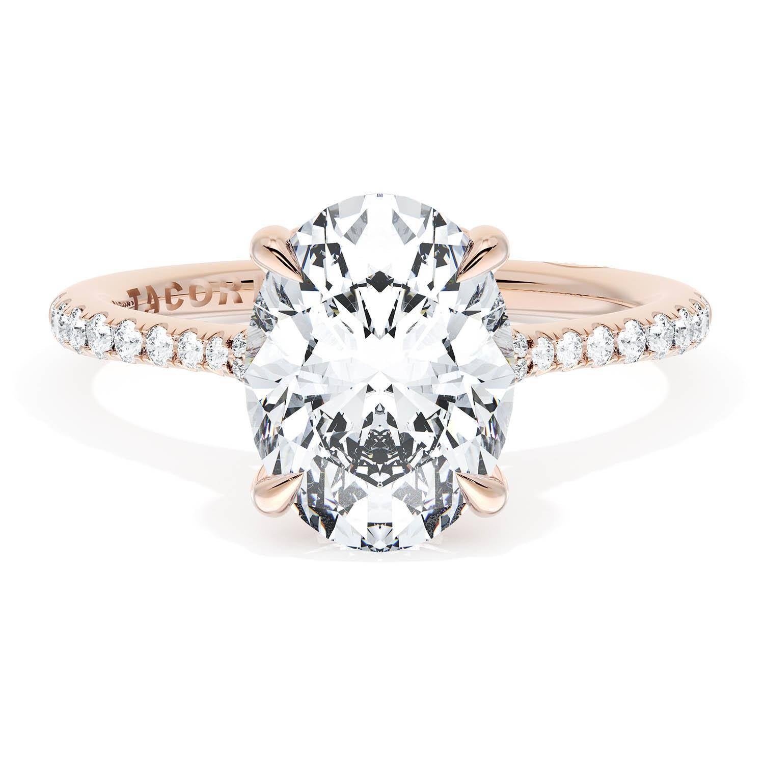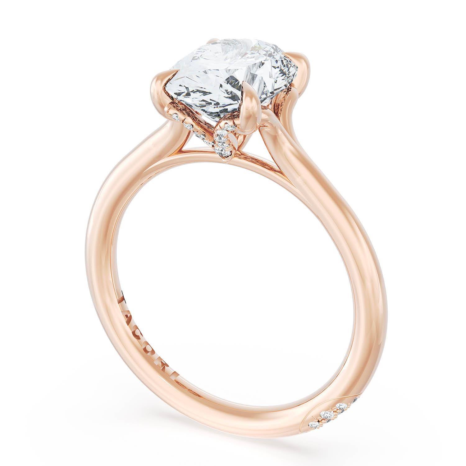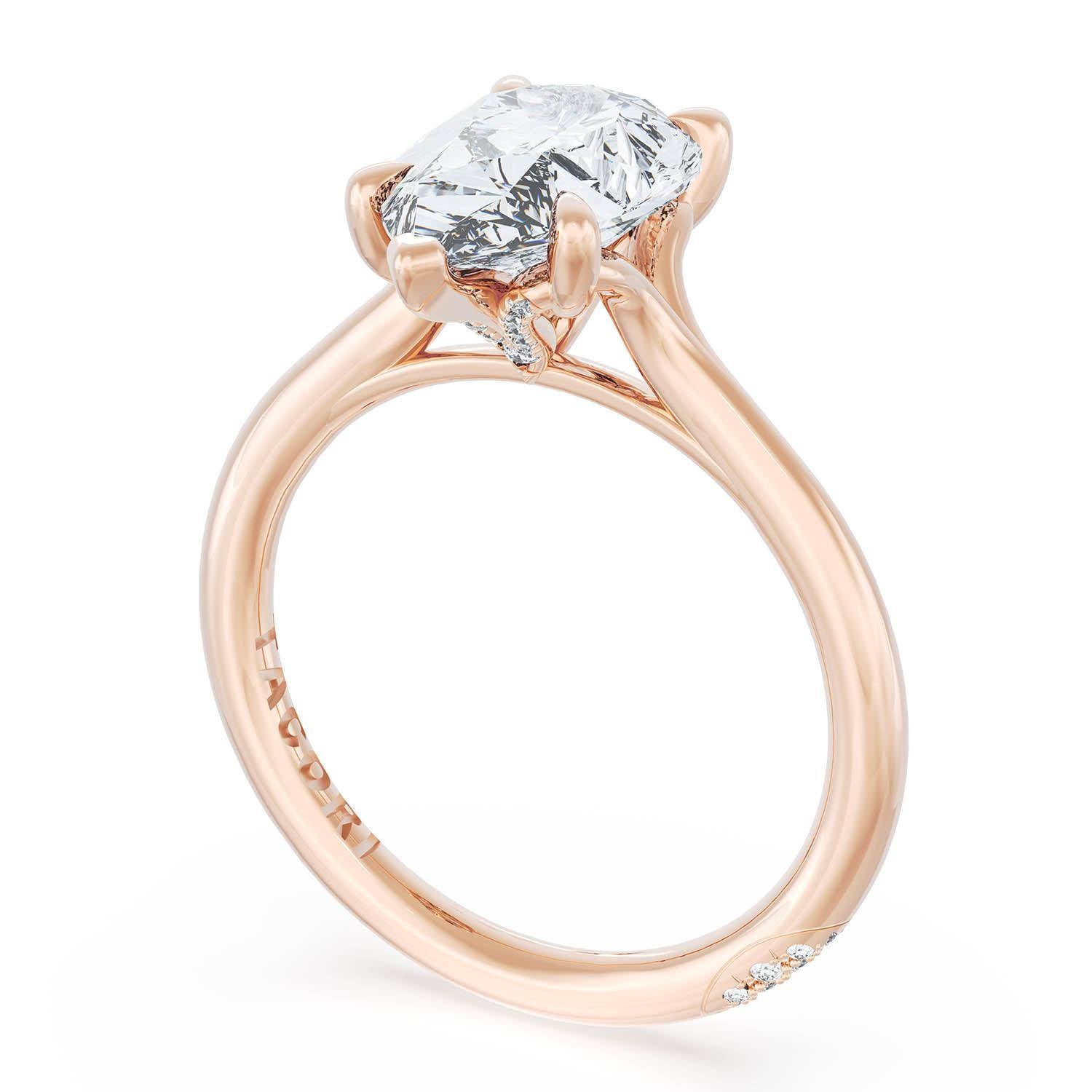 An Oval solitaire is elevated by a modern bloom of round brilliant diamonds, and set into a high-polish 18kt Rose Gold foundation. TACORI Crescents add hidden detail to the underside of the crown.