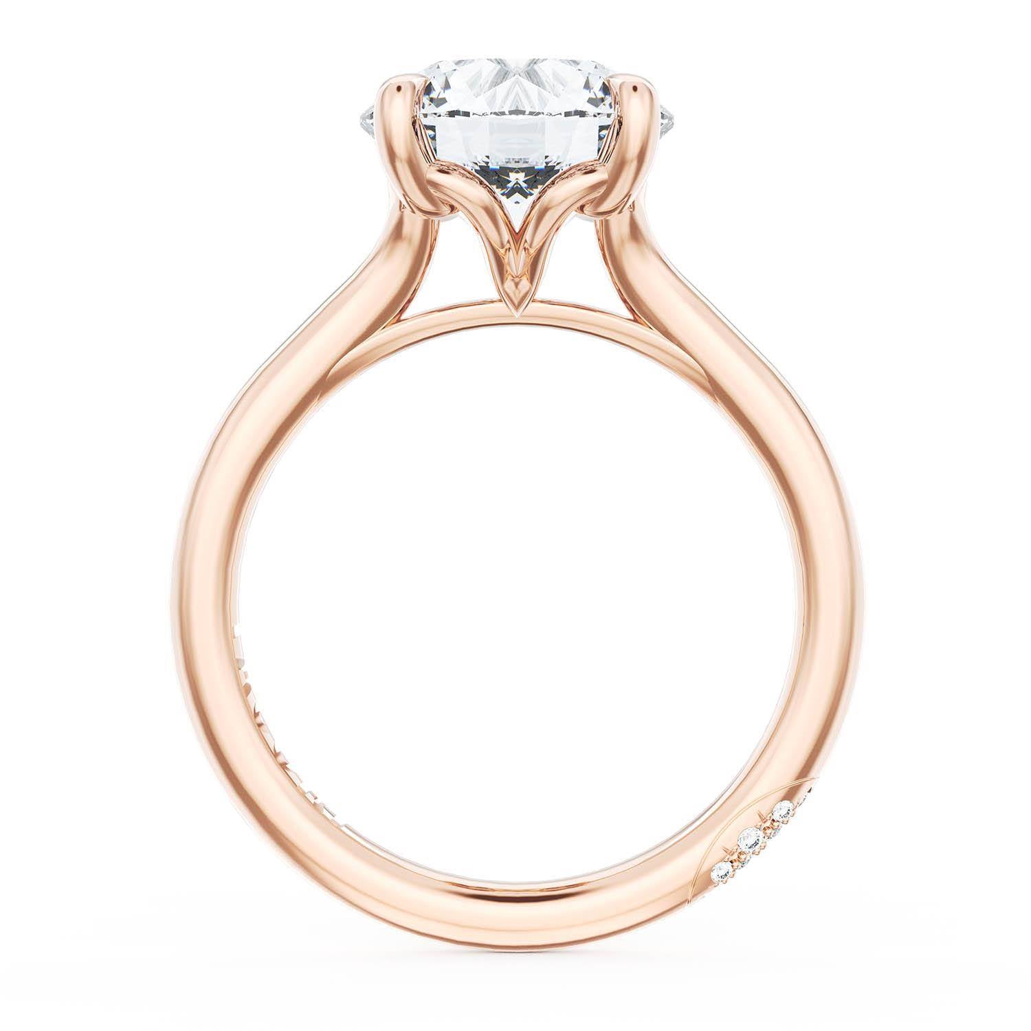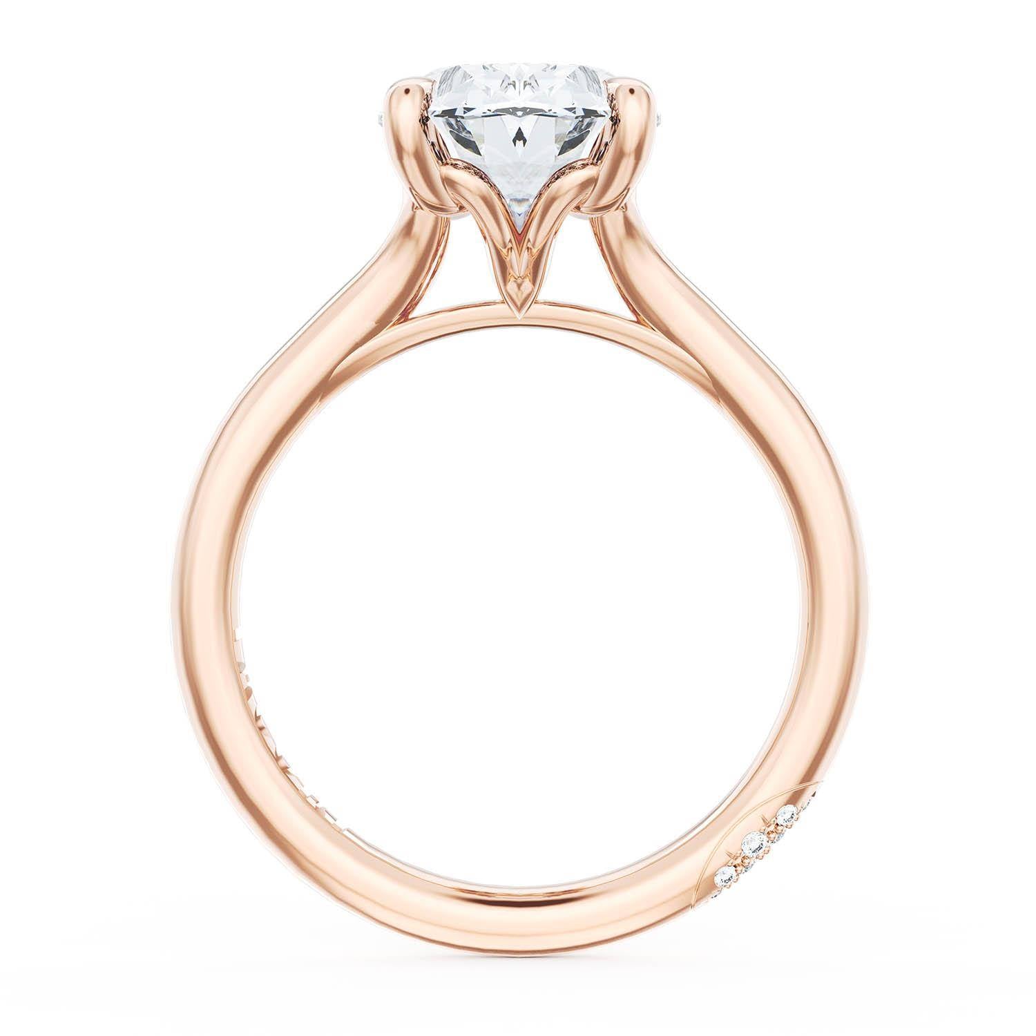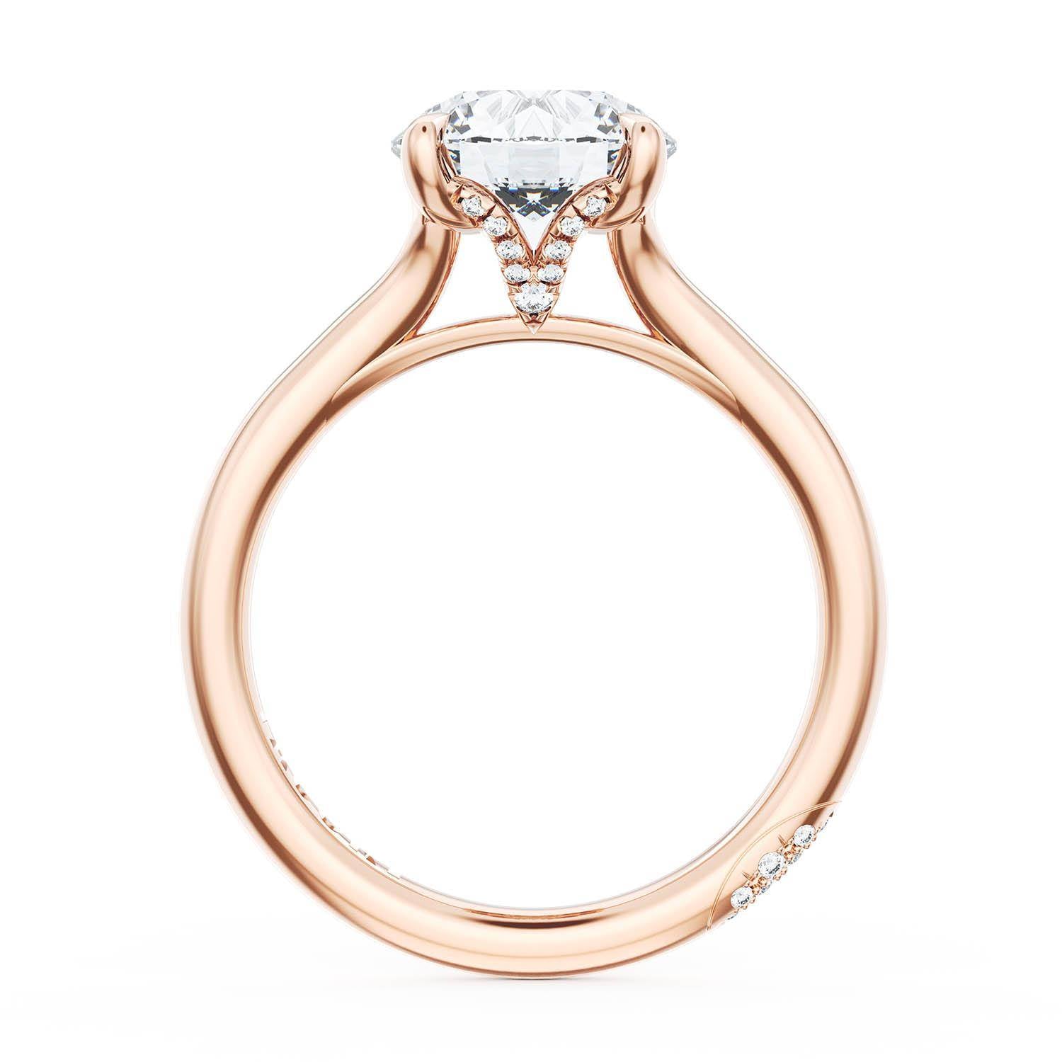 A Round Solitaire is set into a unique corset-inspired crown on a high-polish 18kt Rose Gold foundation. A diamond-studded Founder's Crescent marks the resting point.