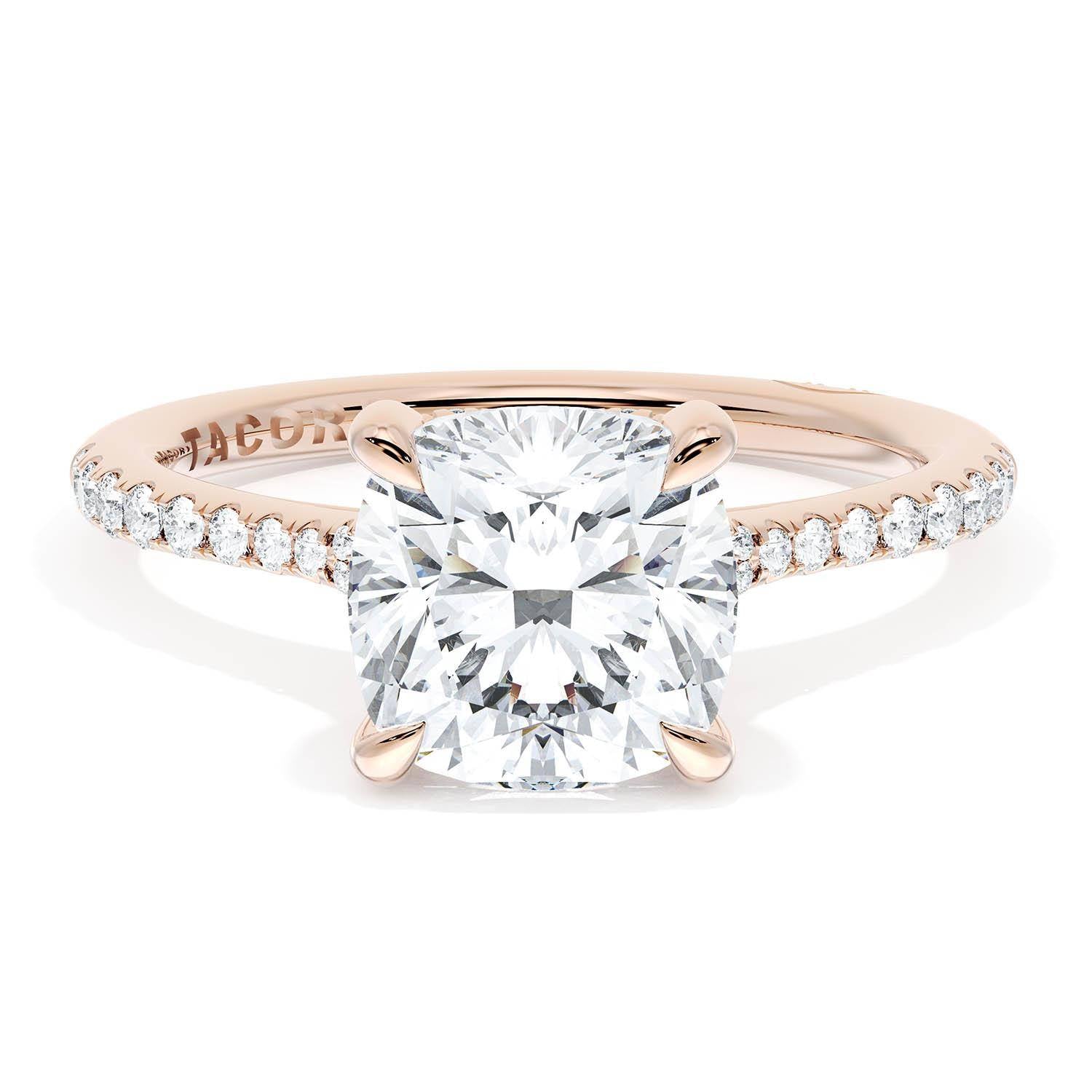 A Cushion Solitaire is set into a unique diamond-studded, corset-inspired crown on a high-polish 18kt Rose Gold foundation. A diamond-studded Founder's Crescent marks the resting point.