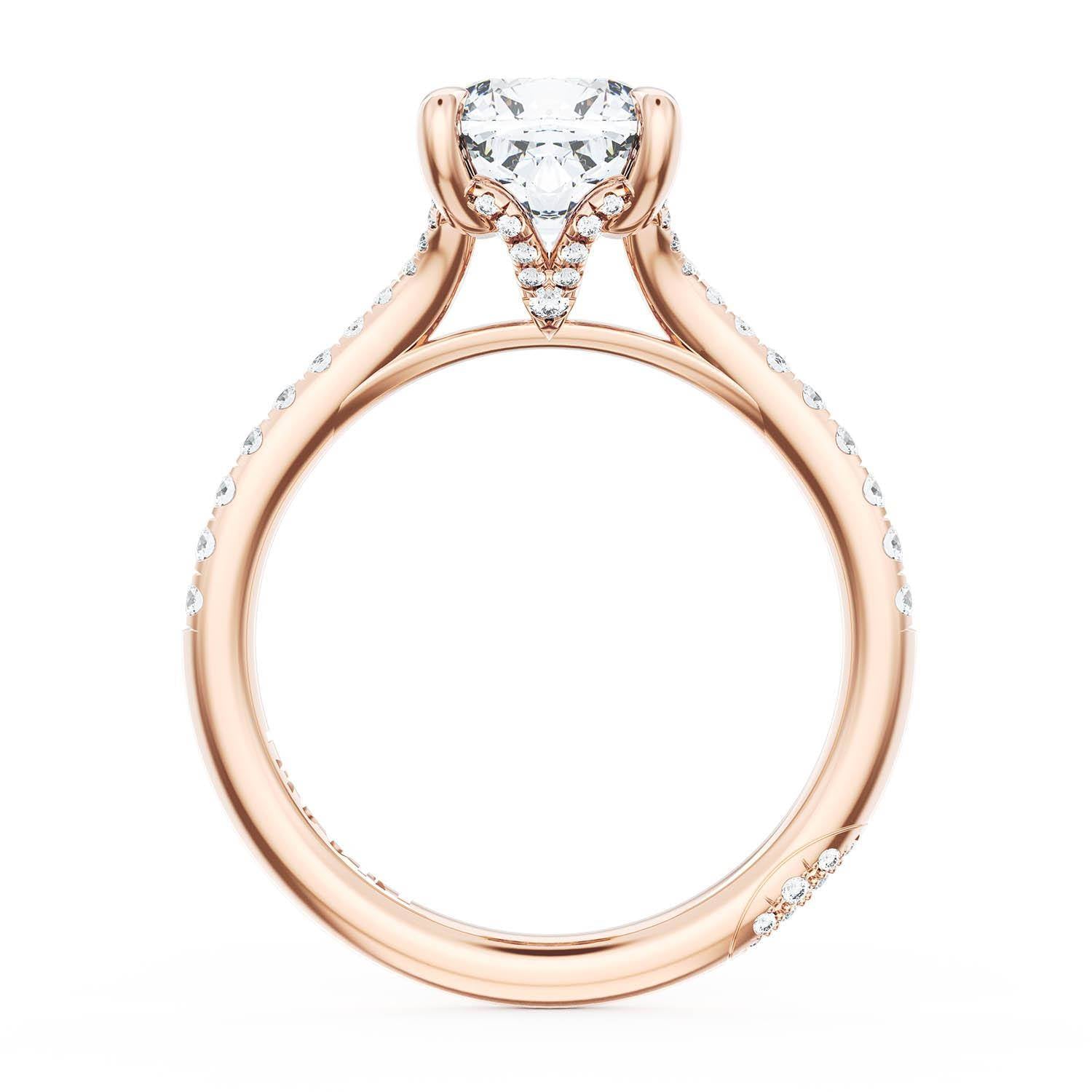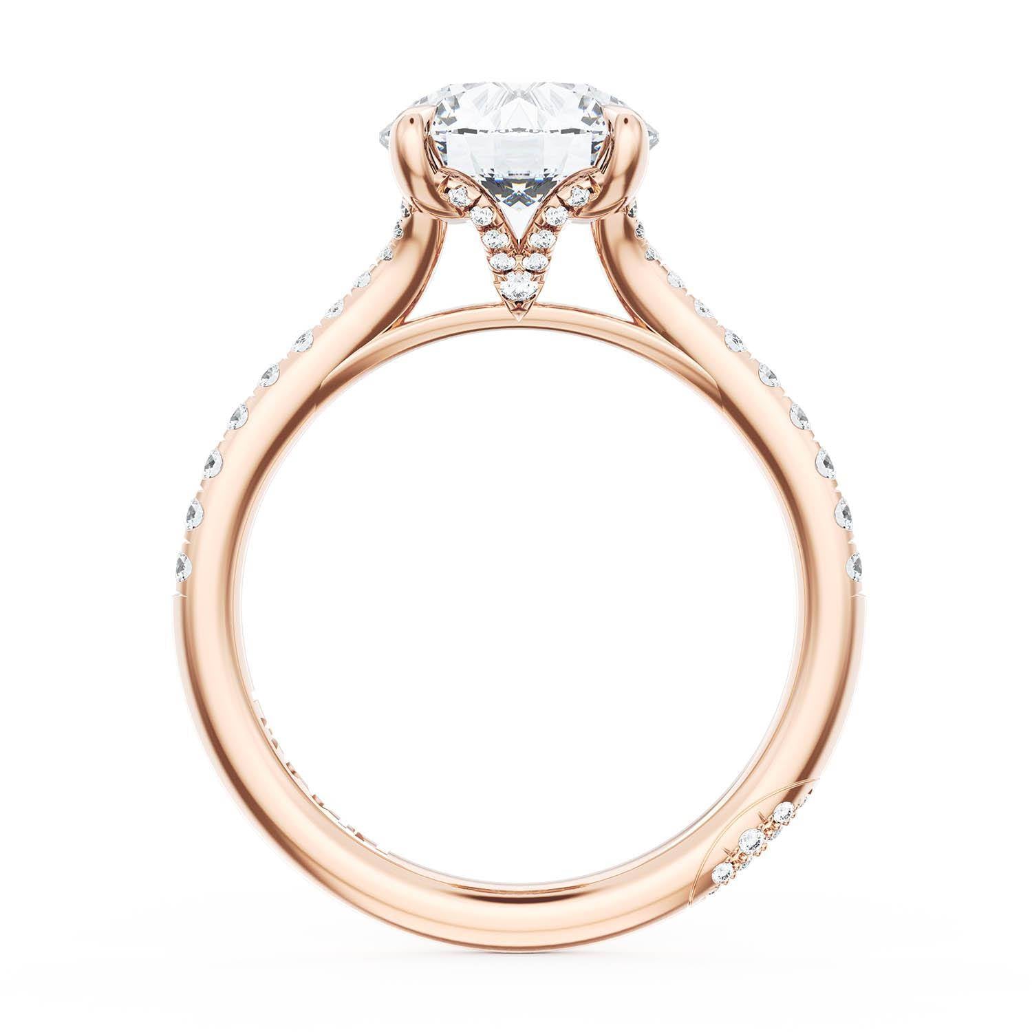 A Round Solitaire is set into a unique corset-inspired crown on a 18kt Rose Gold foundation. Pavé-set diamonds decorate the ceiling and a diamond-studded Founder's Crescent marks the resting point.