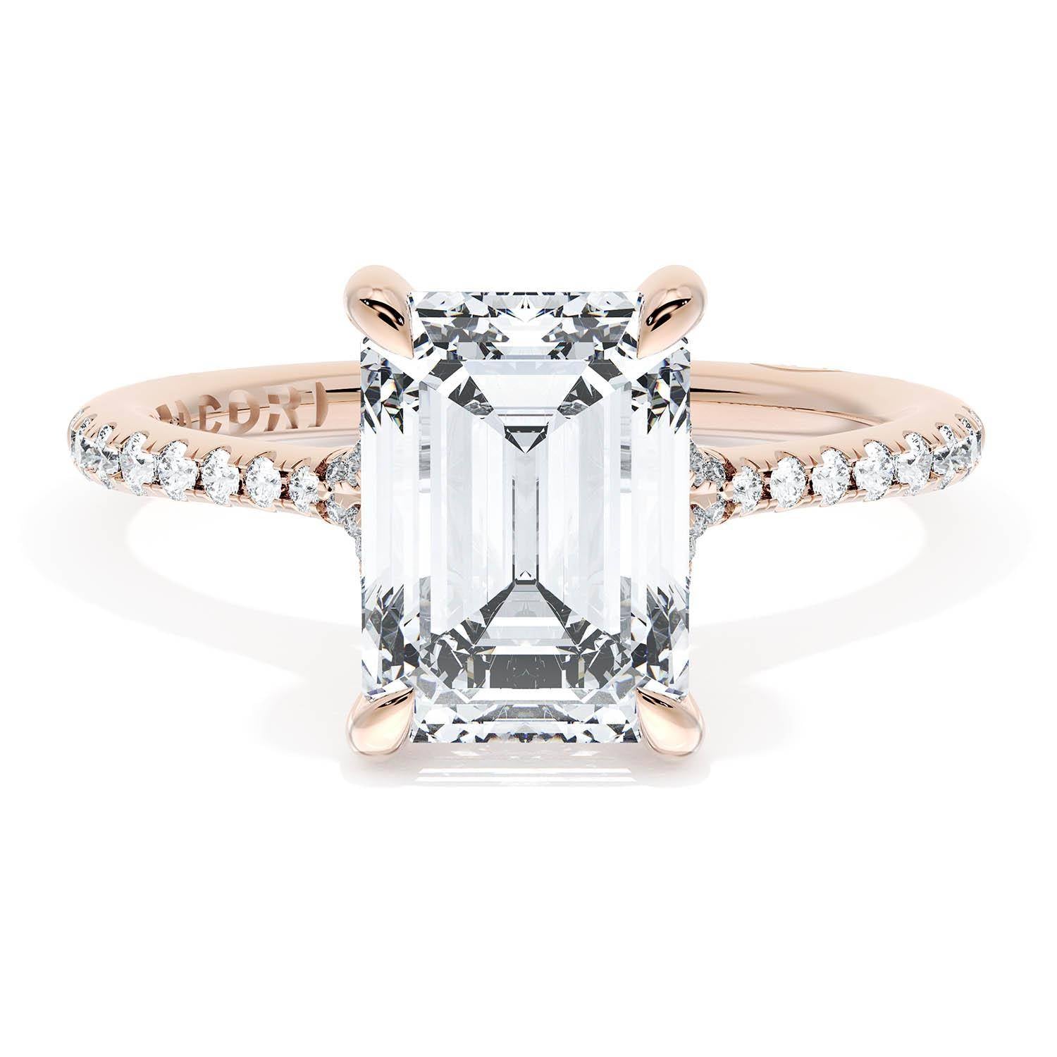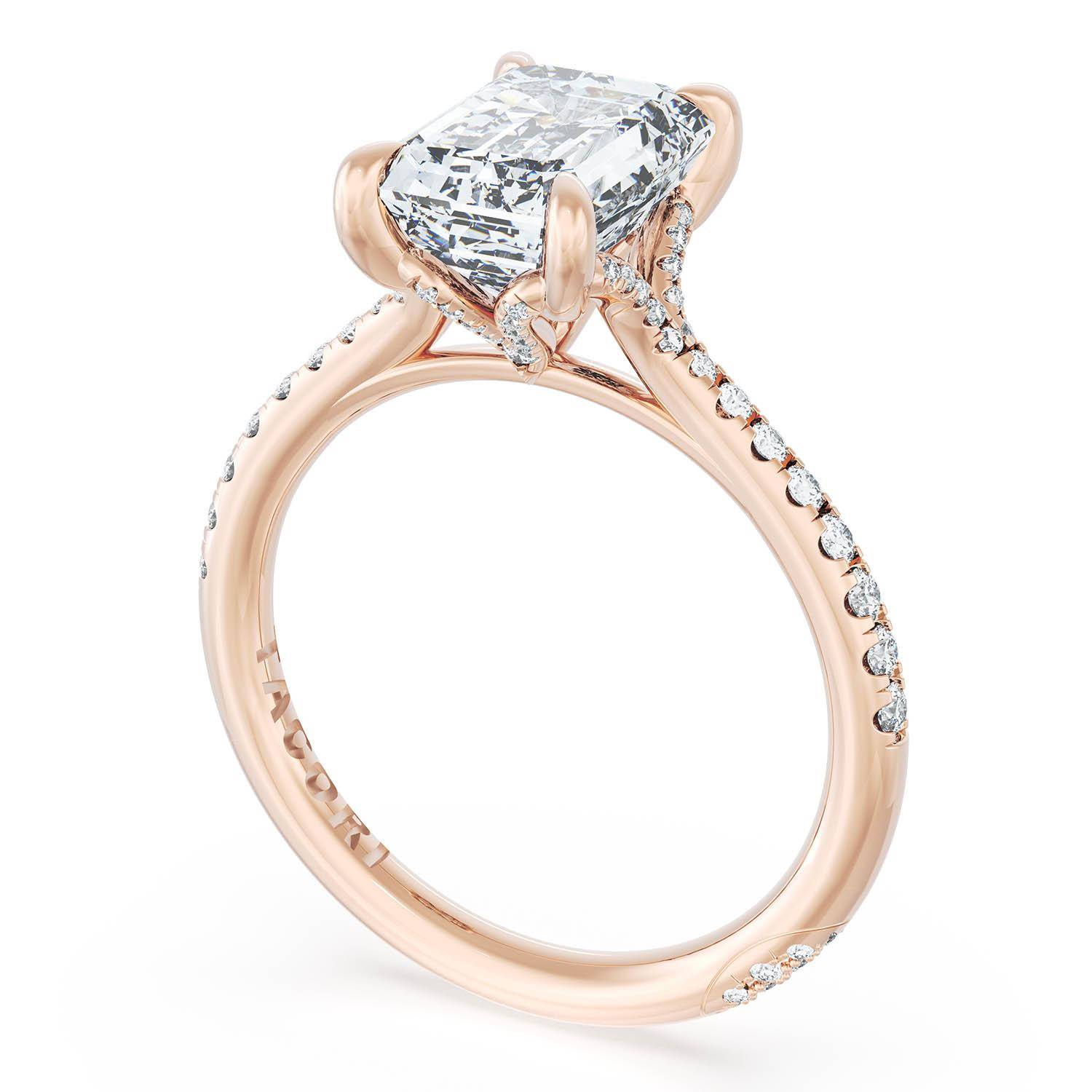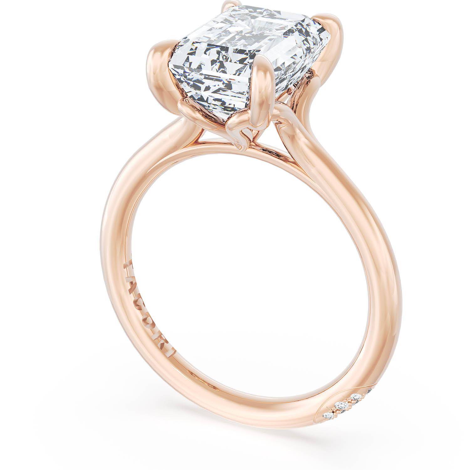 An Emerald solitaire is elevated by a modern bloom of round brilliant diamonds, and set into a high-polish 18kt Rose Gold foundation. TACORI Crescents add hidden detail to the underside of the crown.