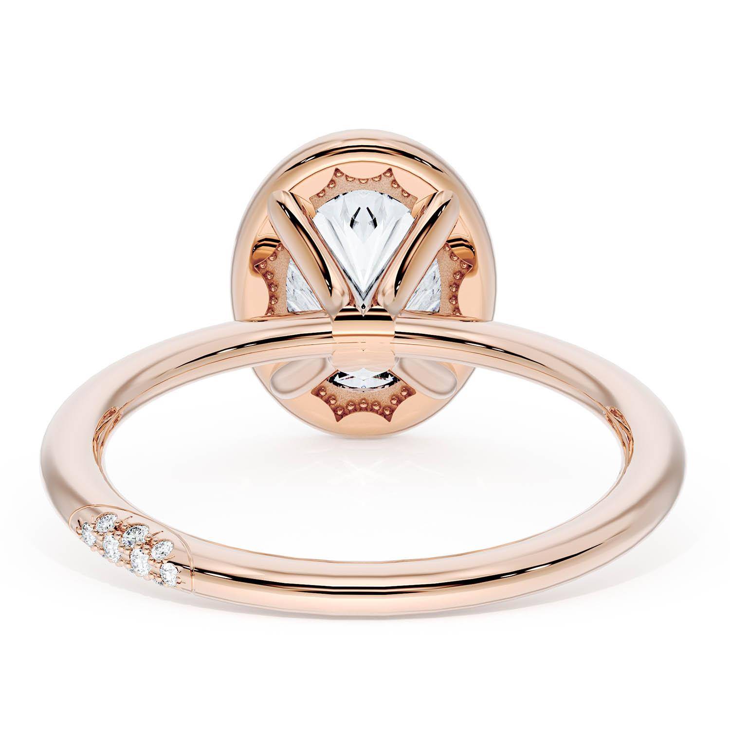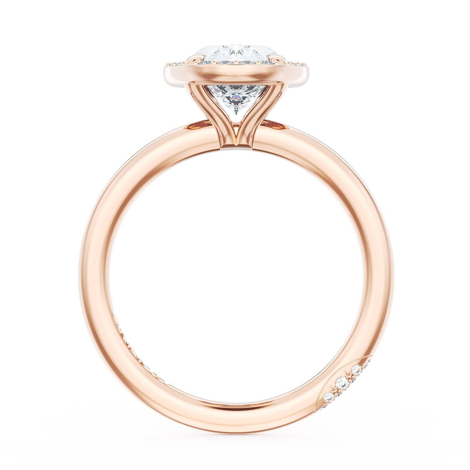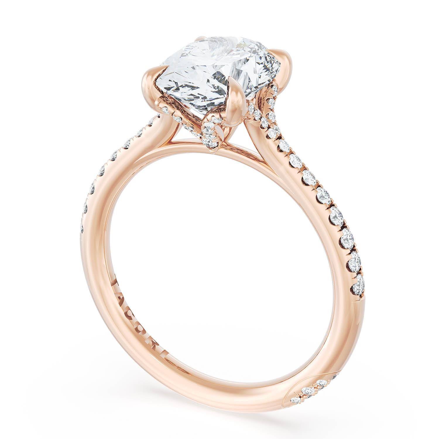 An Oval Solitaire is set into a unique diamond-studded, corset-inspired crown on a high-polish 18kt Rose Gold foundation. A diamond-studded Founder's Crescent marks the resting point.