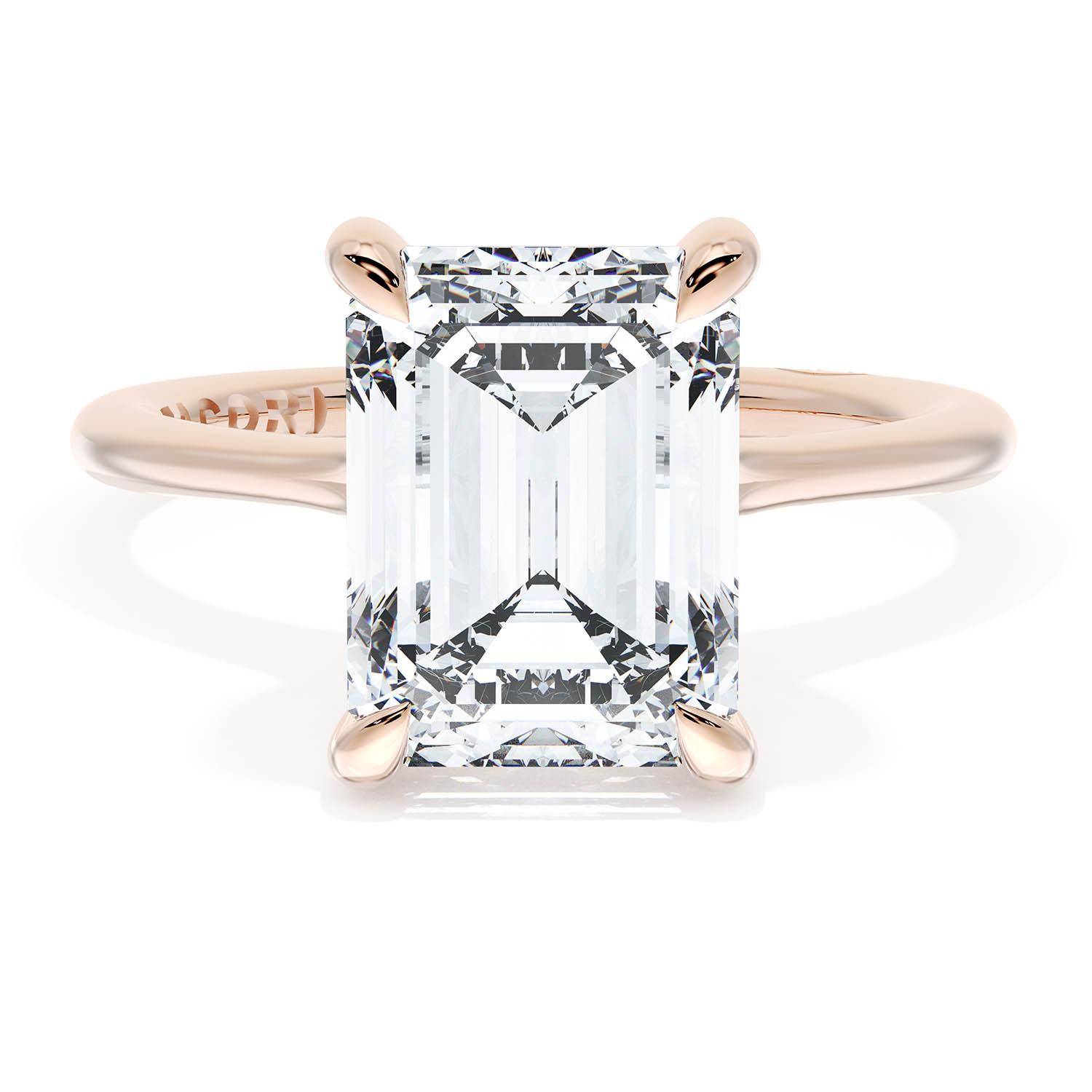 An Emerald Solitaire is set into a unique corset-inspired crown on a high-polish 18kt Rose Gold foundation. A diamond-studded Founder's Crescent marks the resting point.