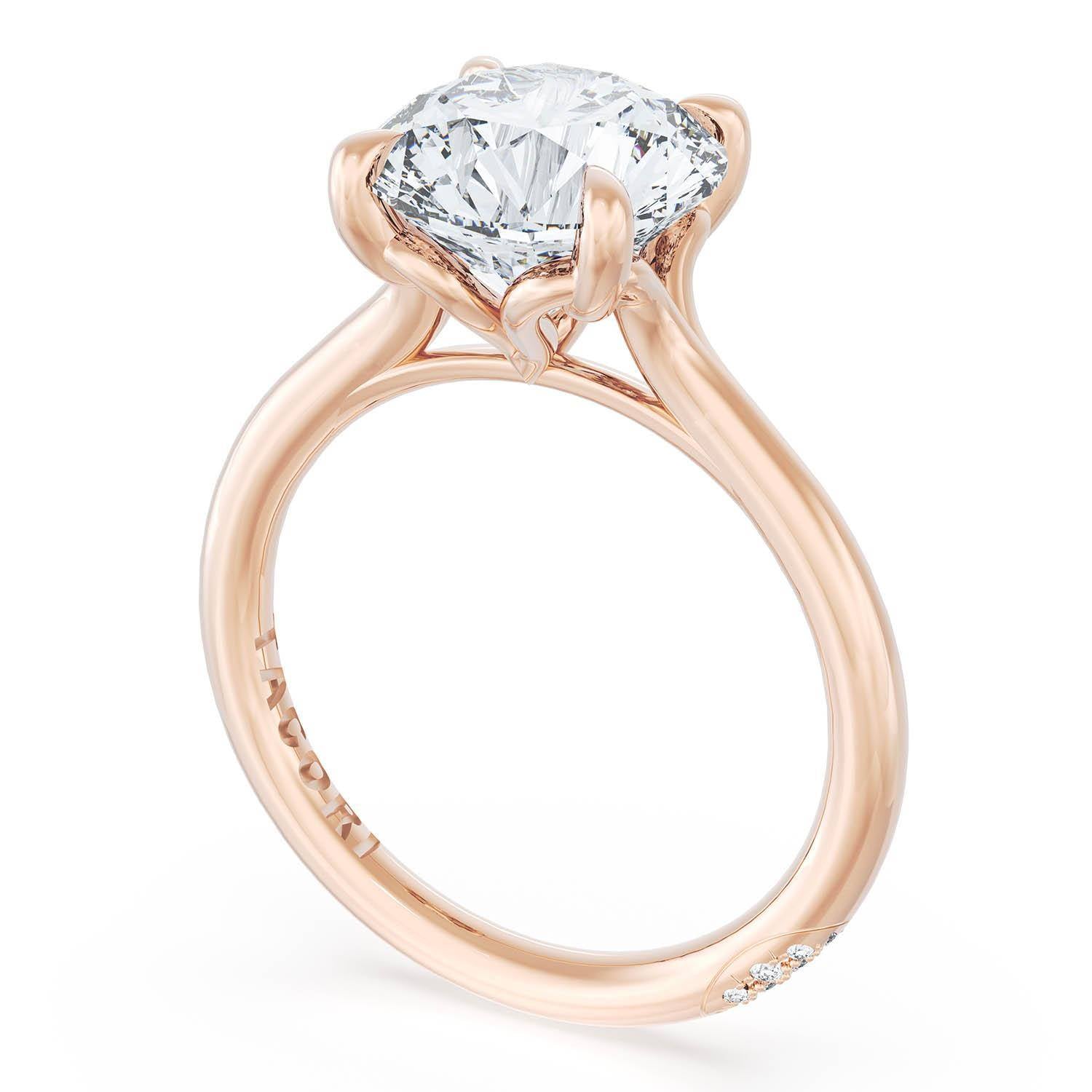 A Round solitaire is elevated by a modern bloom of round brilliant diamonds, and set into a high-polish 18kt Rose Gold foundation. TACORI Crescents add hidden detail to the underside of the crown.