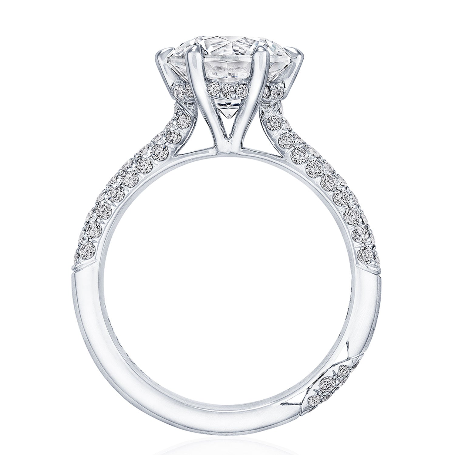 Triple rows of pavé run up the ceiling towards the solitaire, which is set into six prongs of a Cathedral foundation. A hidden bloom adds all-angle sparkle, and a Founder's Crescent marks the resting point.