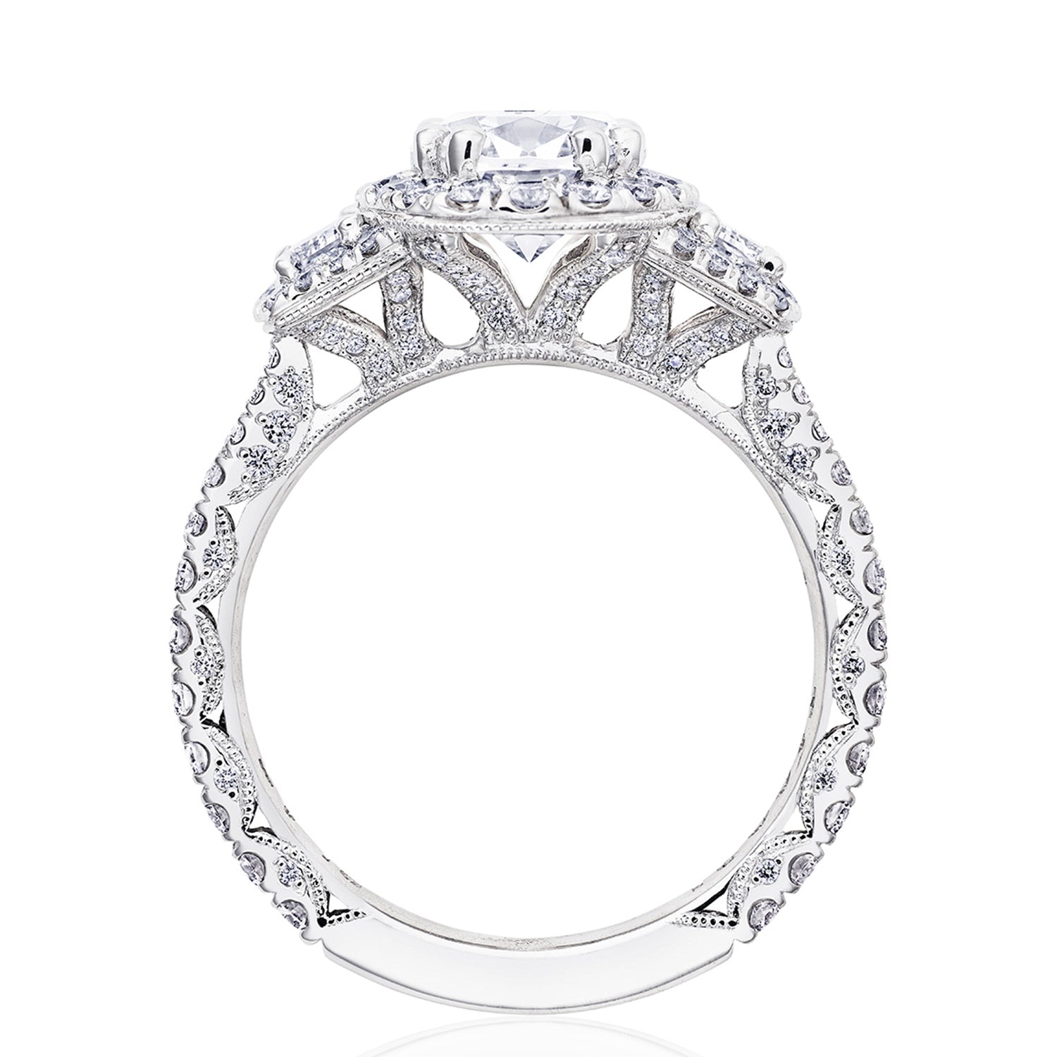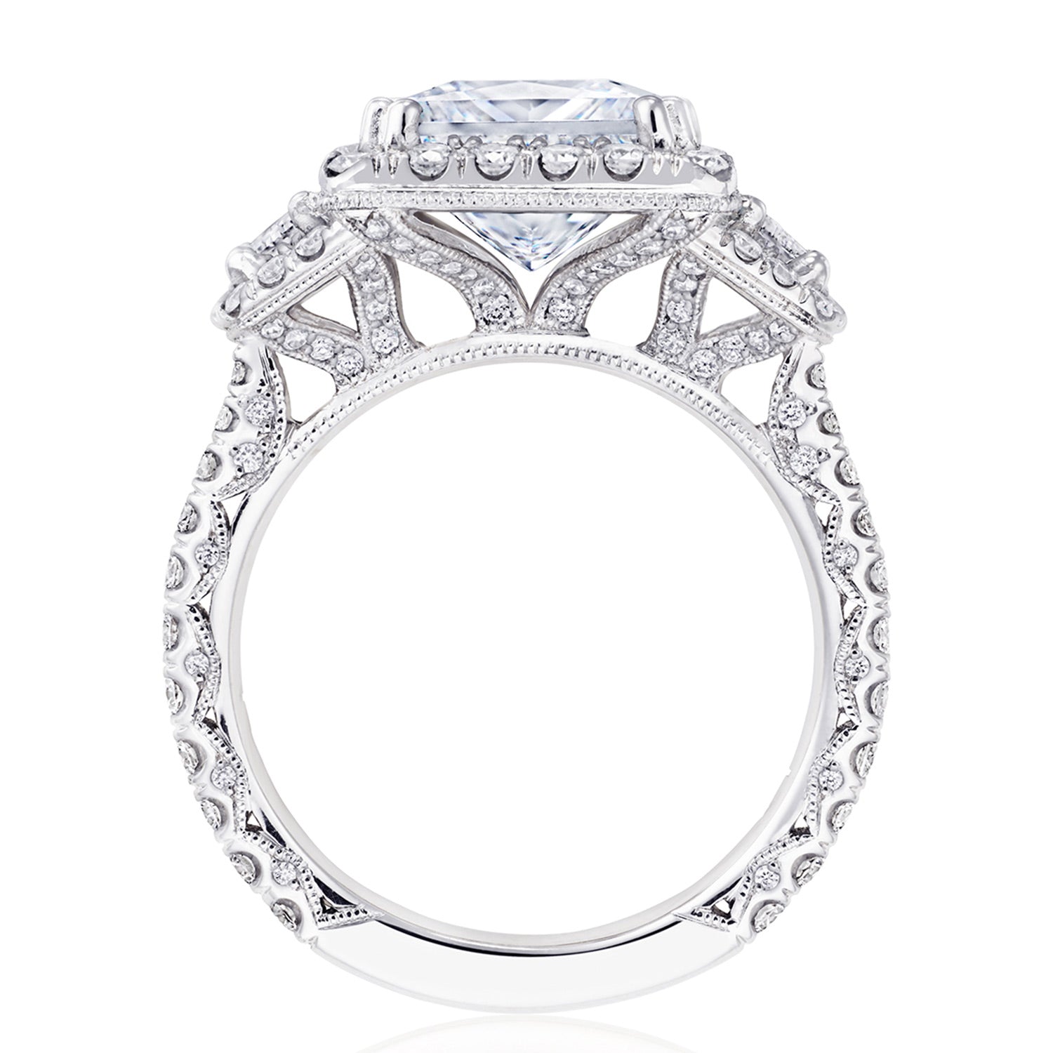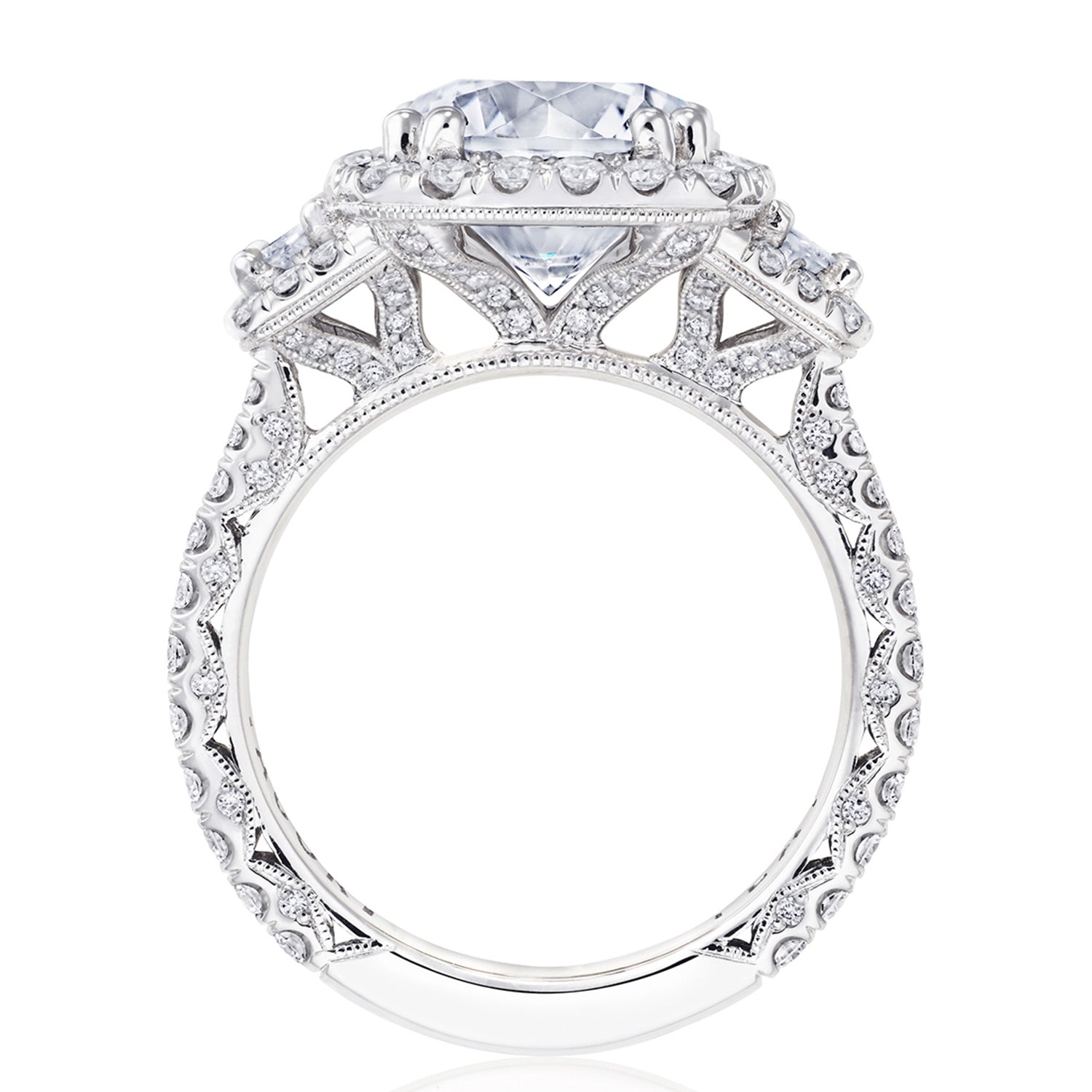Two cadillac-cut side diamonds embrace the center stone, while a bloom encircles all crowning diamonds. Just below, diamond-studded prongs meet a Petite Crescent fabric and a ceiling of small pavé-set diamonds.