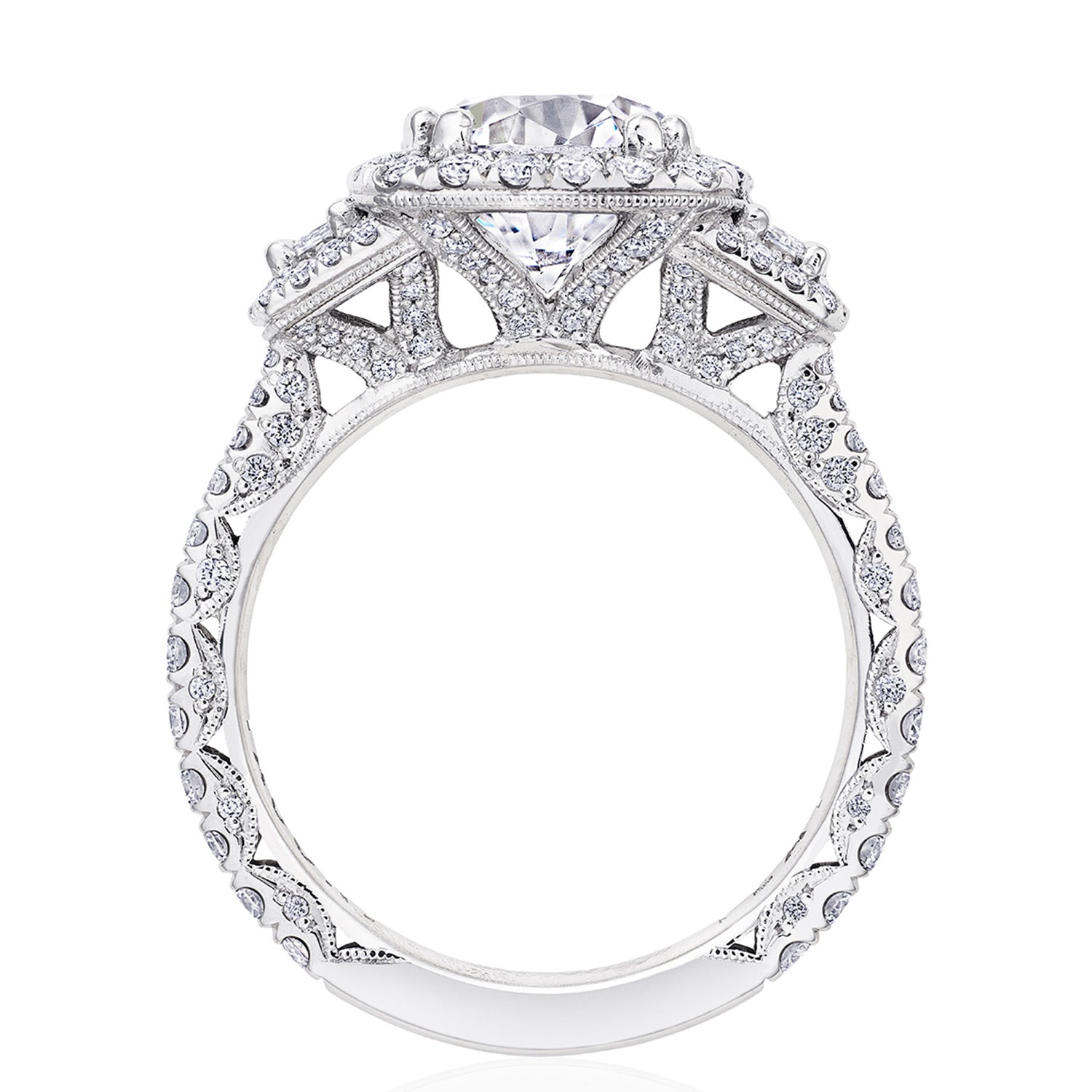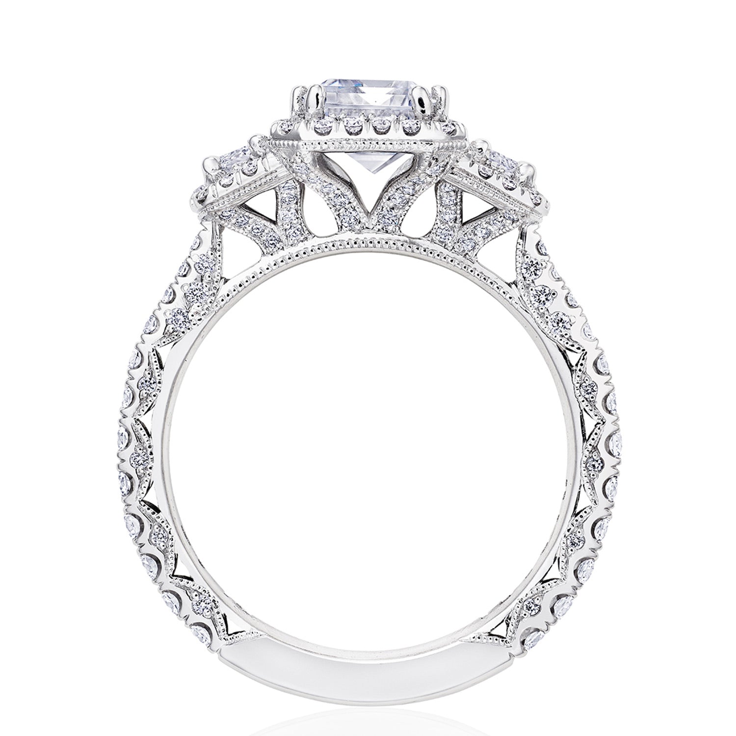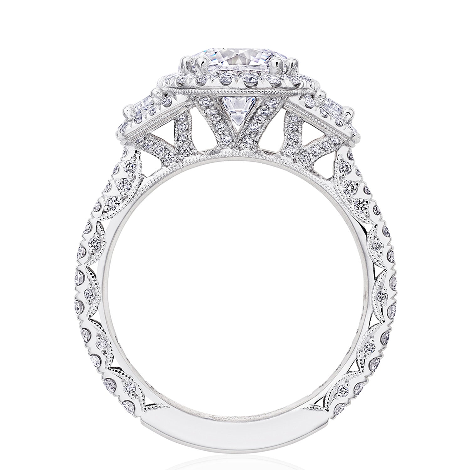 Two cadillac-cut side diamonds embrace the center stone, while a bloom encircles all crowning diamonds. Just below, diamond-studded prongs meet a Petite Crescent fabric and a ceiling of small pavé-set diamonds.