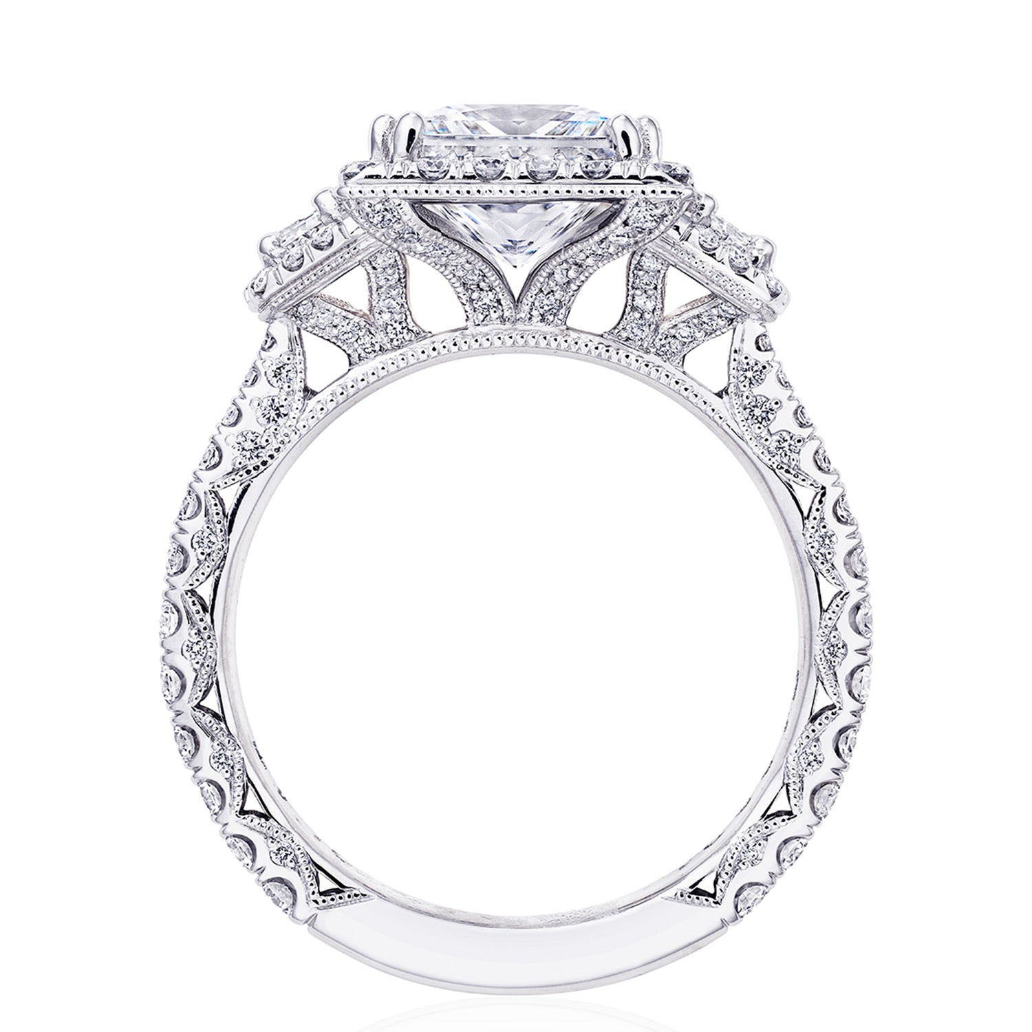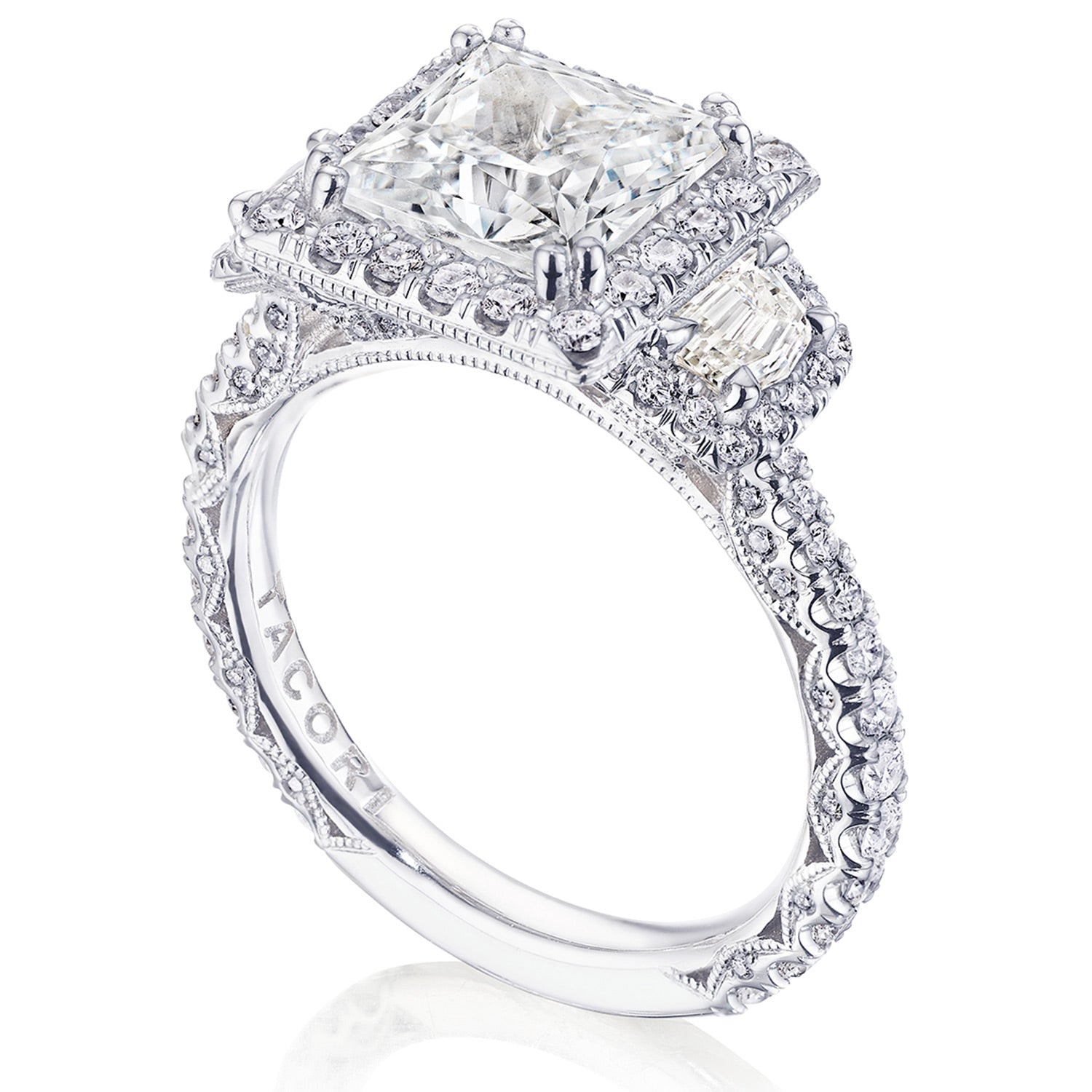 The princess solitaire sits on a Cathedral foundation with a hidden bloom, which adds the TACORI touch. A high-polish band of premium metals is studded with a diamond-studded Signature Crescent at the foundation