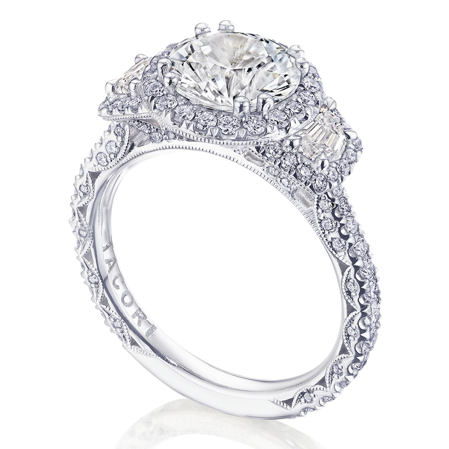 The round-brilliant solitaire sits on a Cathedral foundation with a hidden bloom, which adds the TACORI touch. A high-polish band of premium metals is studded with a diamond-studded Signature Crescent at the foundation