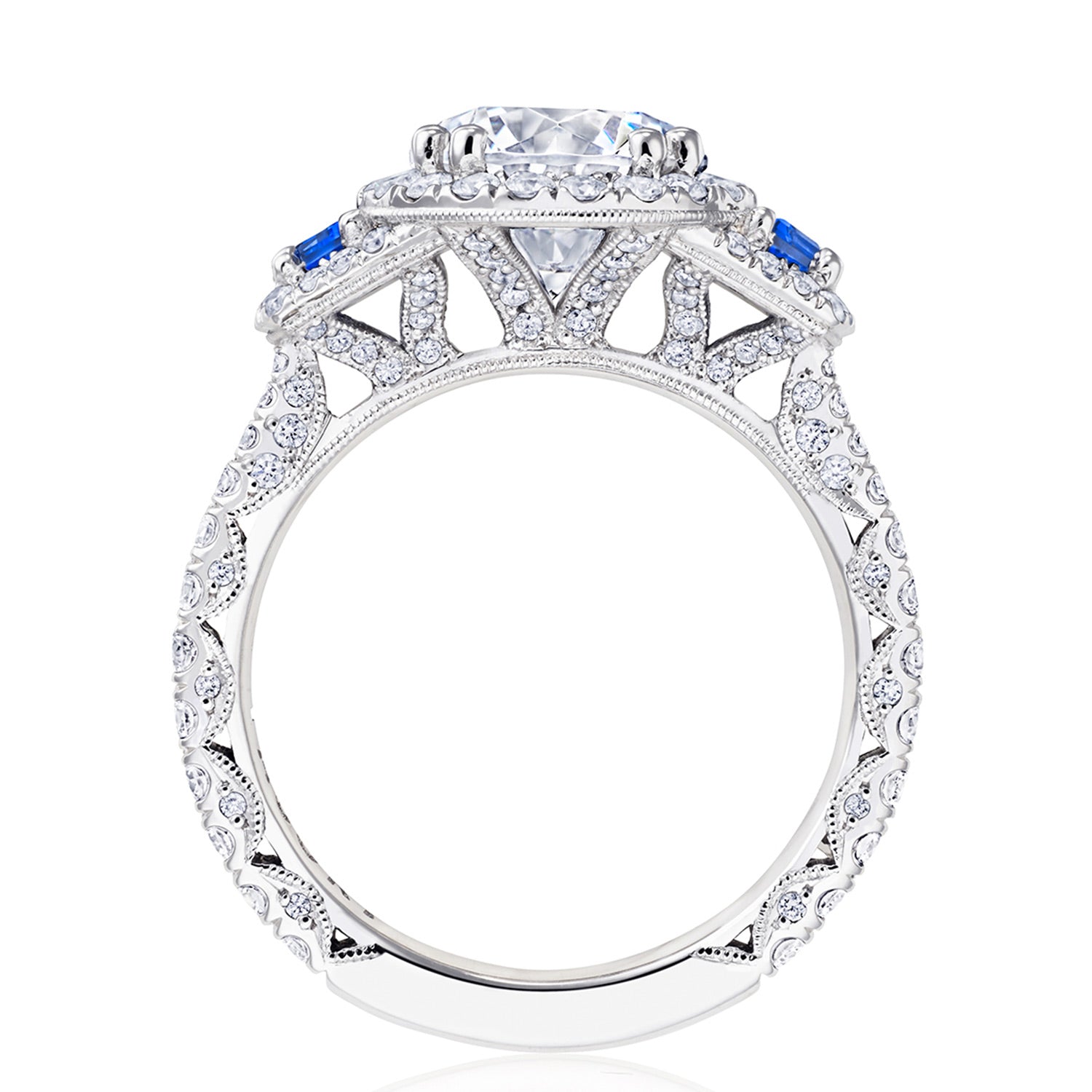 In this three-stone ring, cadillac-cut sapphires embrace the center stone, and a bloom encircles each. Below the crown, diamond-studded prongs meet an innerface of Petite Crescent fabric and a ceiling of pavé.