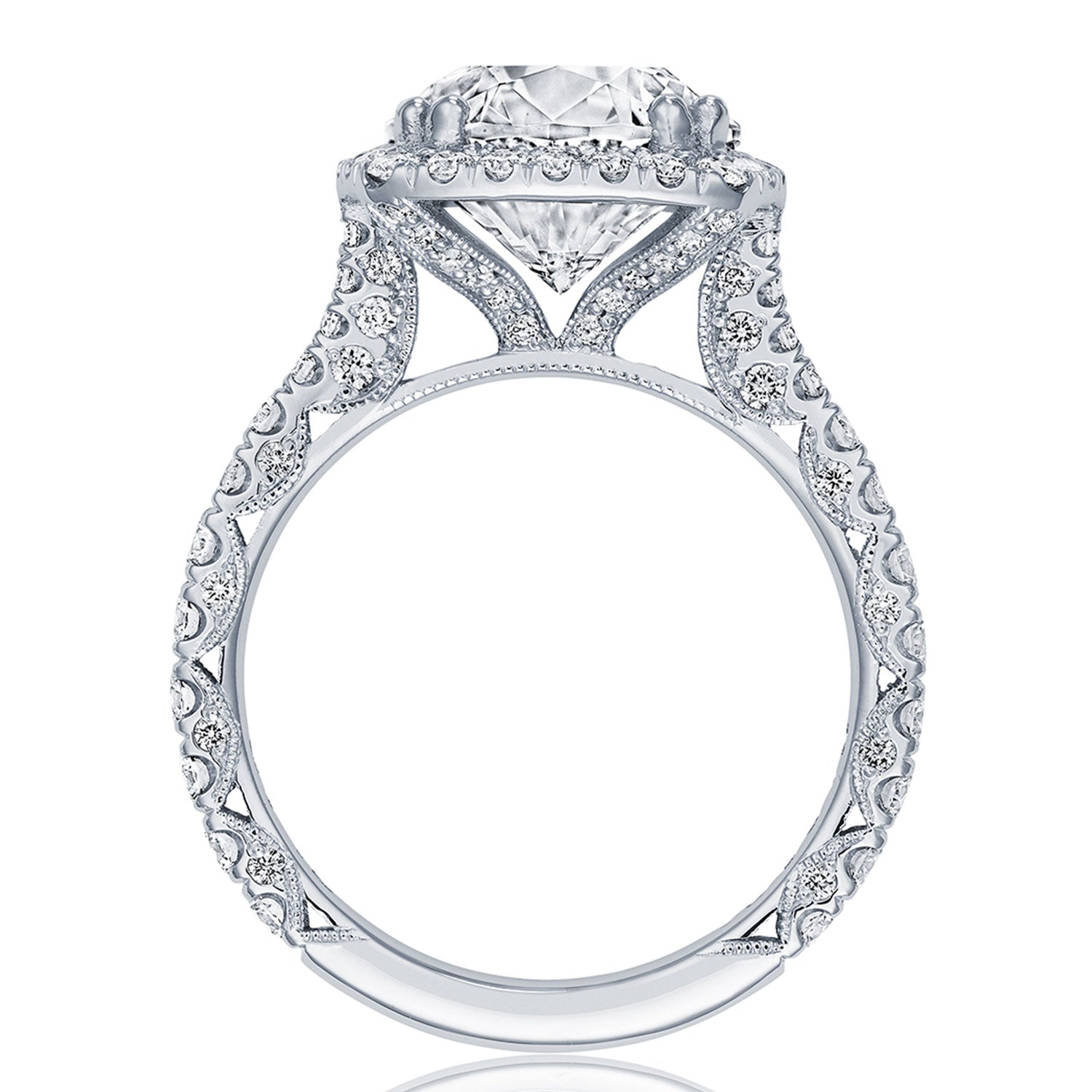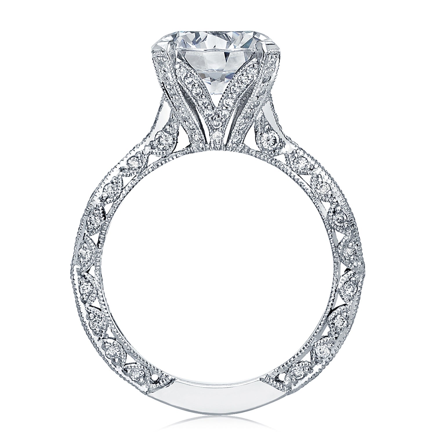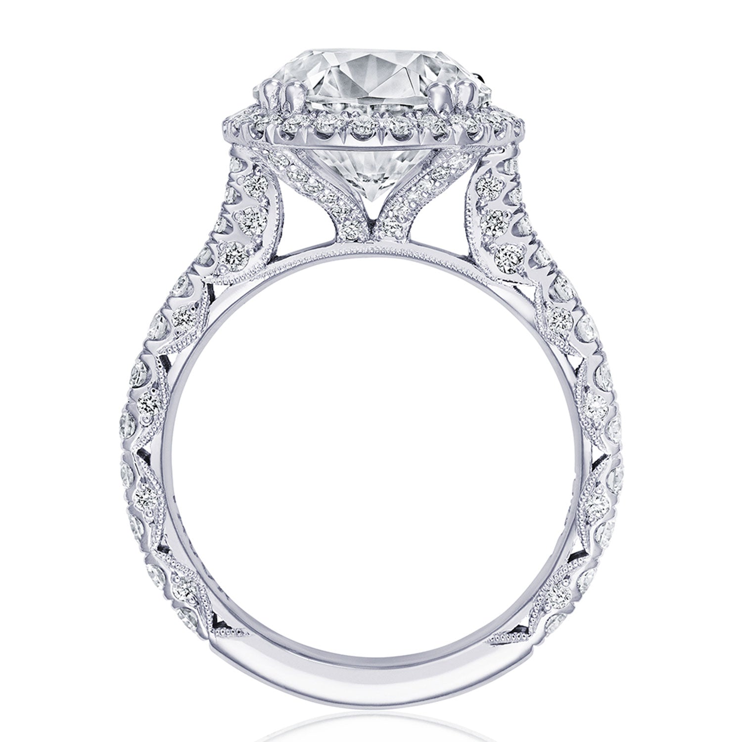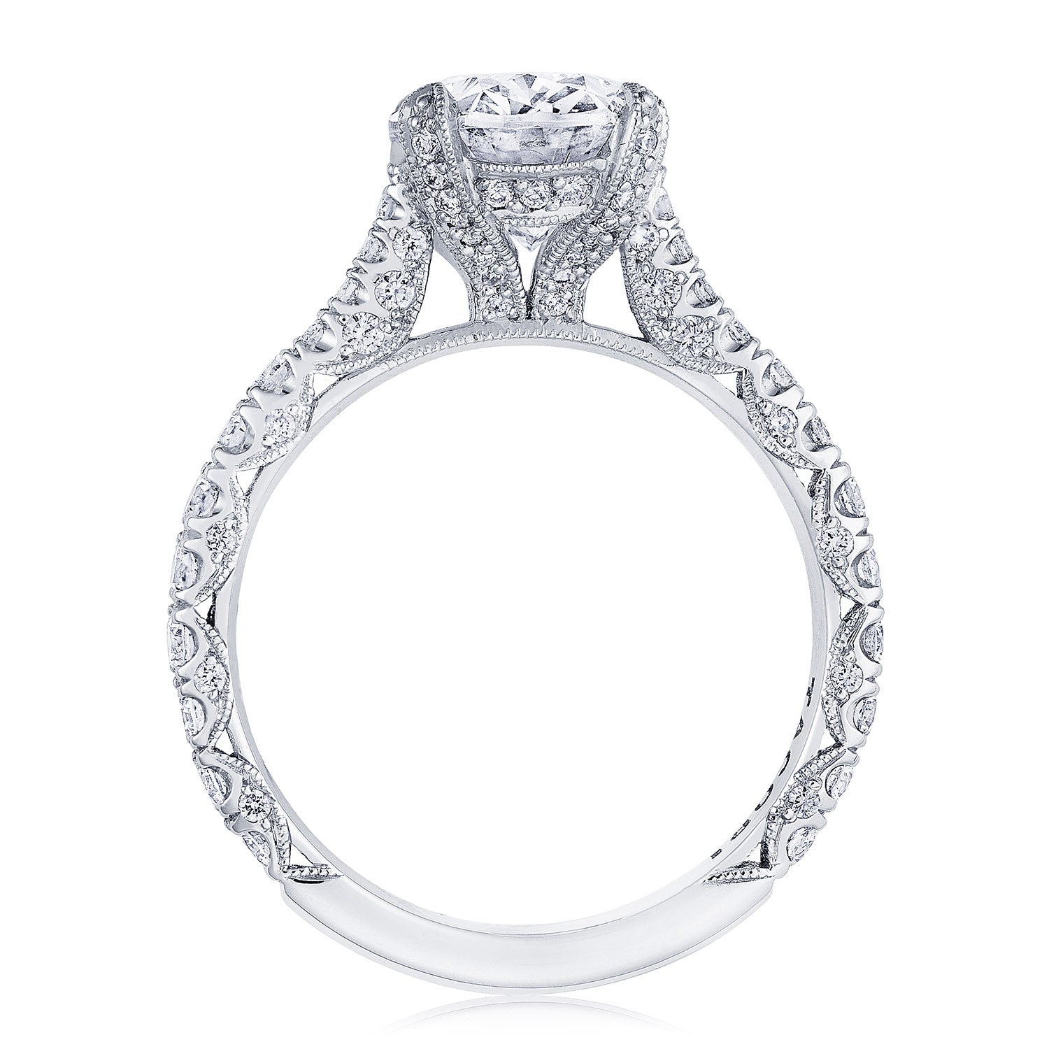 Intense and intricate diamond studding embellishes the Classic Crescent fabric, while round-brilliant diamonds lead up the ceiling towards the solitaire. More diamond detailing is found on the prongs of the Classic 360 foundation.