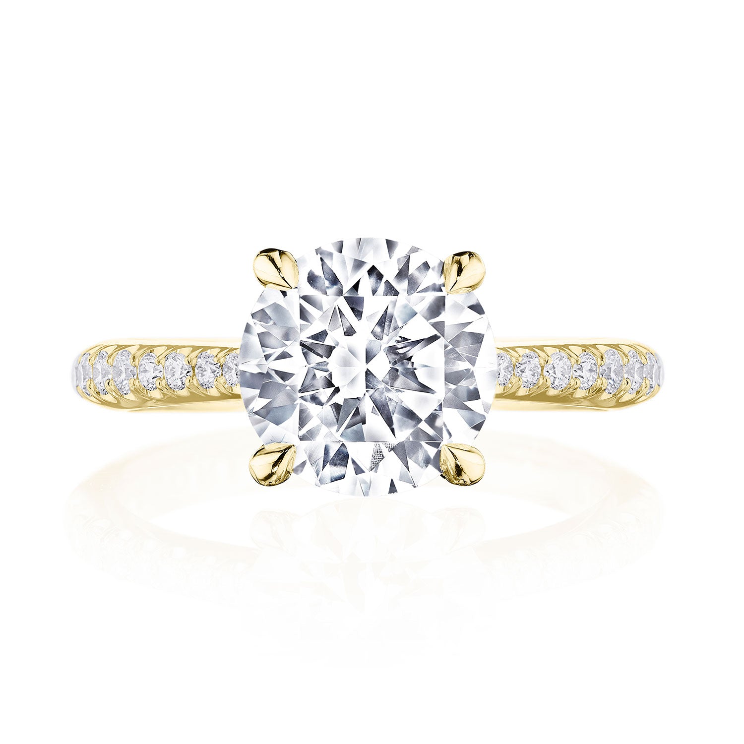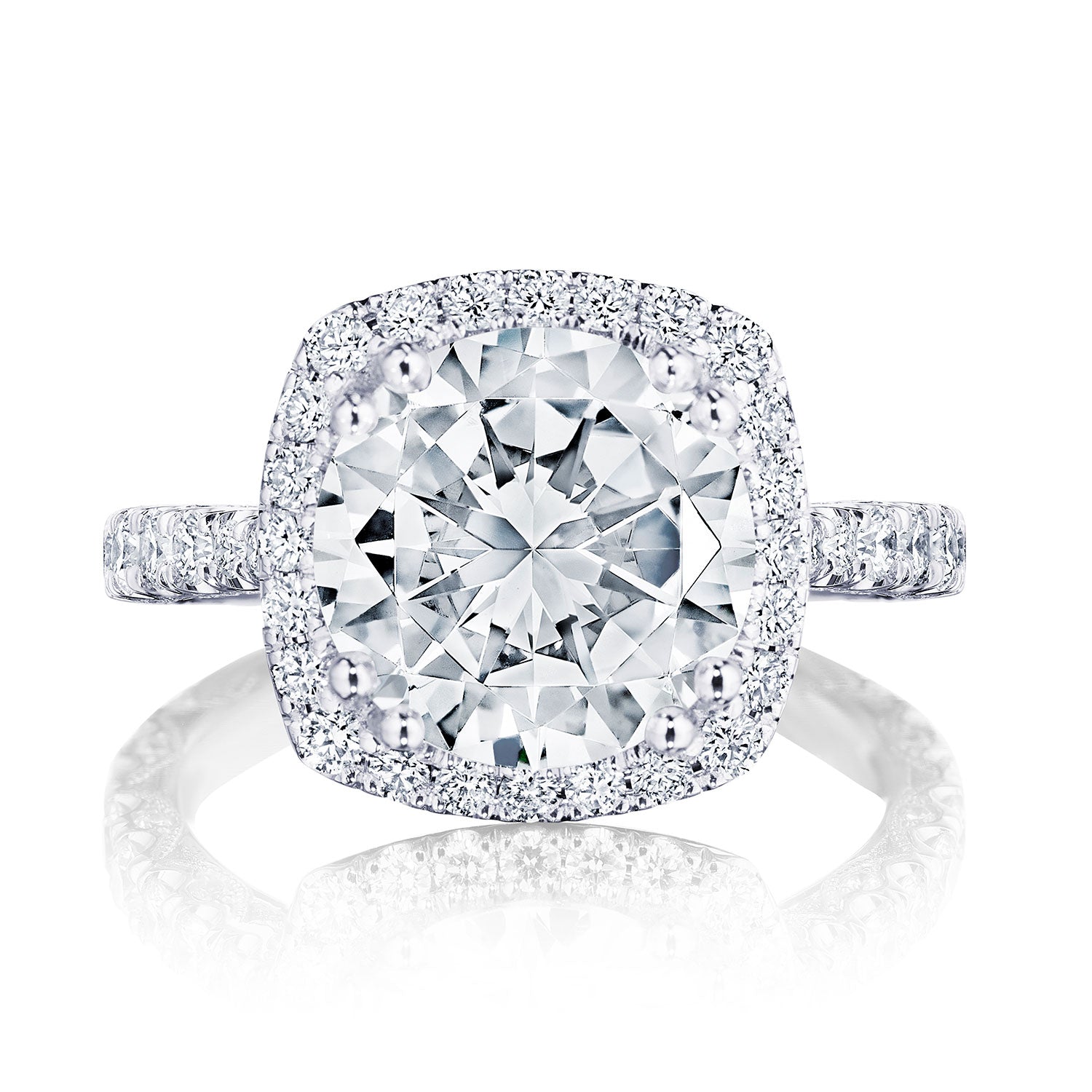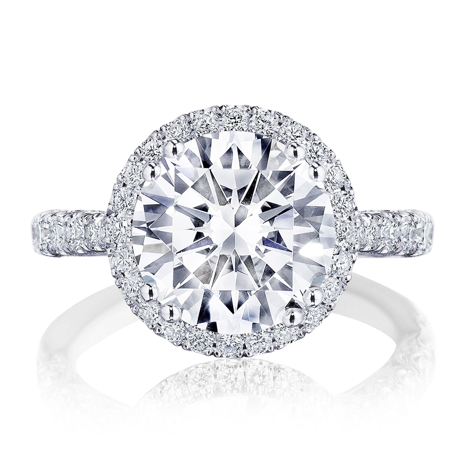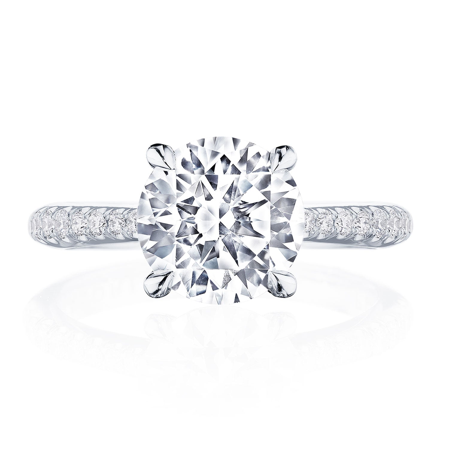 Intense and intricate diamond studding embellishes the Classic Crescent fabric, while round-brilliant diamonds lead up the ceiling towards the solitaire. More diamond detailing is found on the prongs of the Classic 360 foundation.