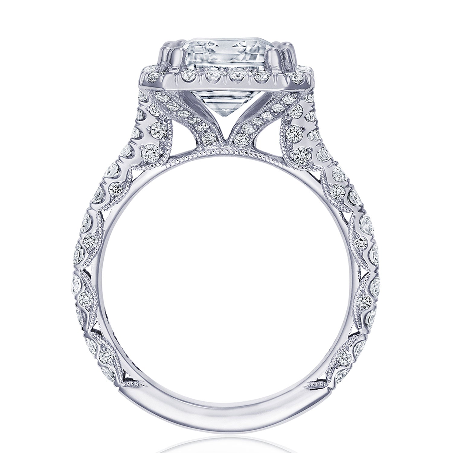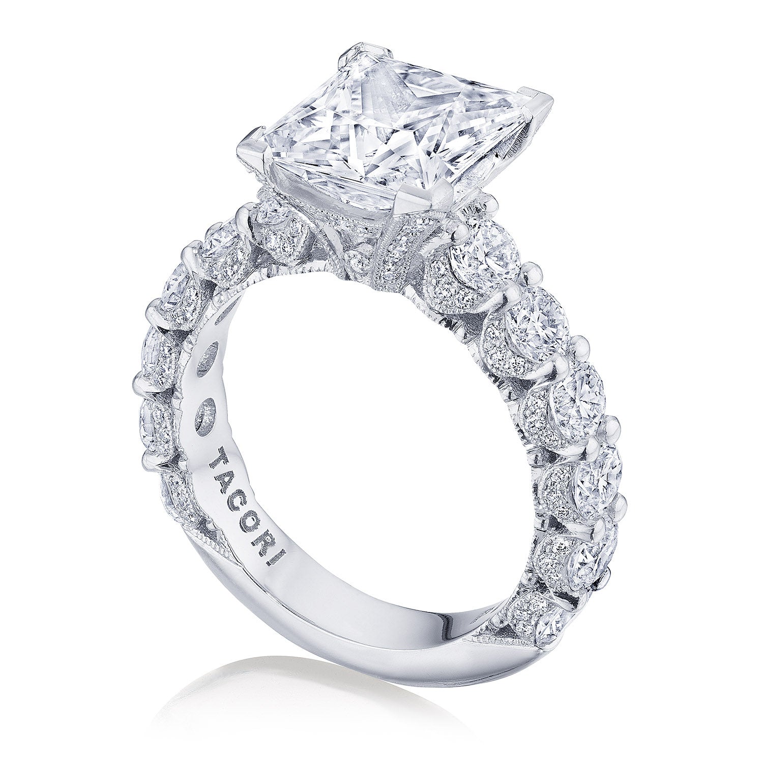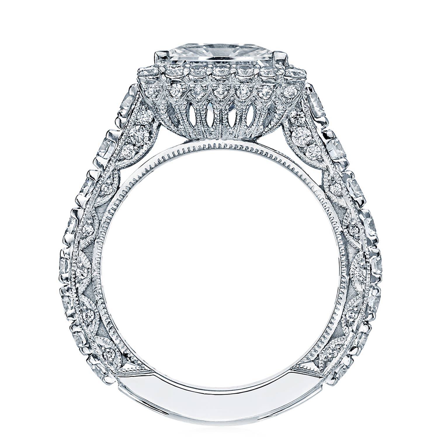 Intense and intricate diamond studding embellishes the Classic Crescent fabric, while round-brilliant diamonds lead up the ceiling towards the princess solitaire. More diamond detailing is found on the prongs of the Classic 360 foundation.