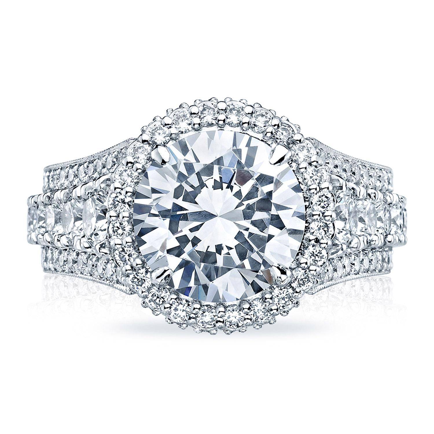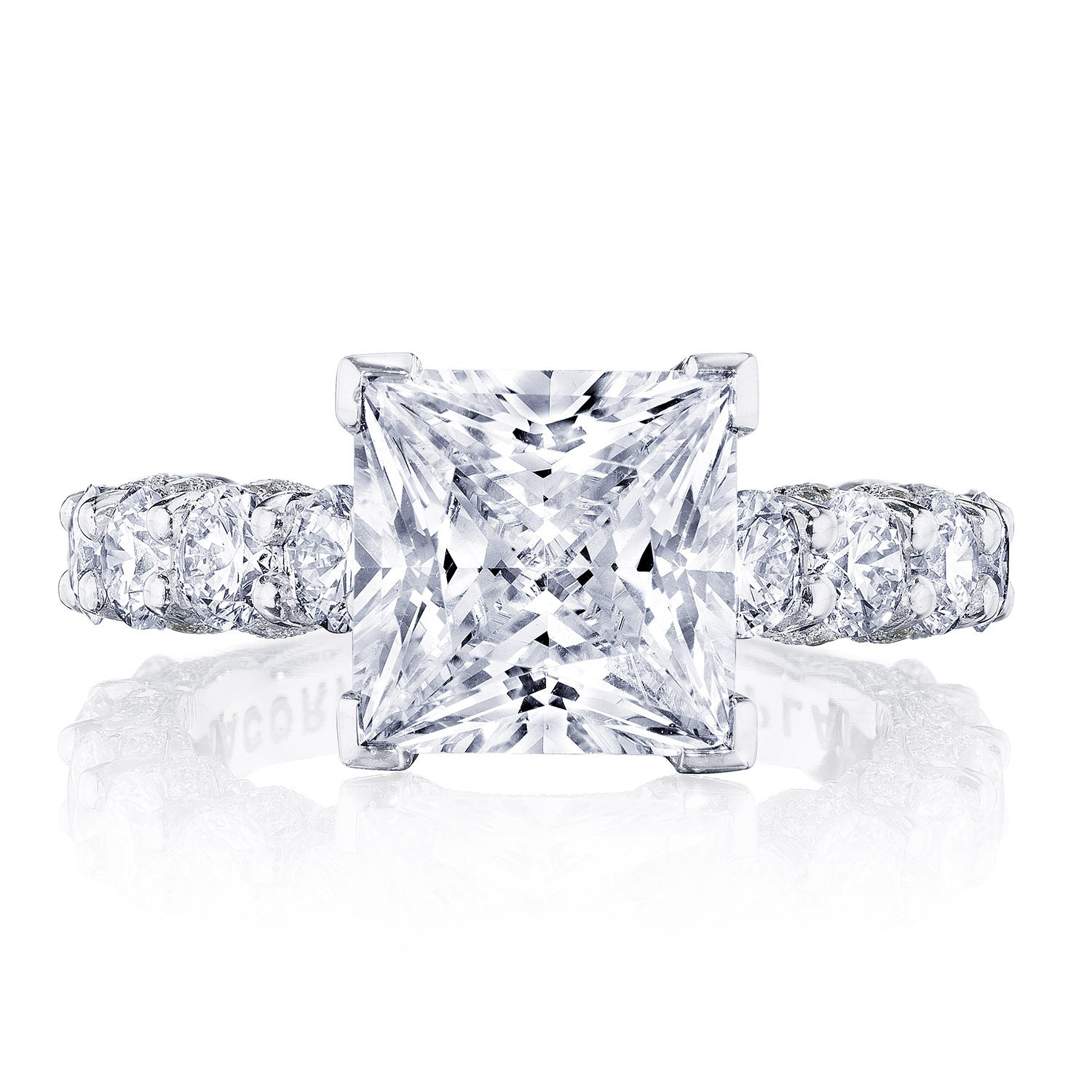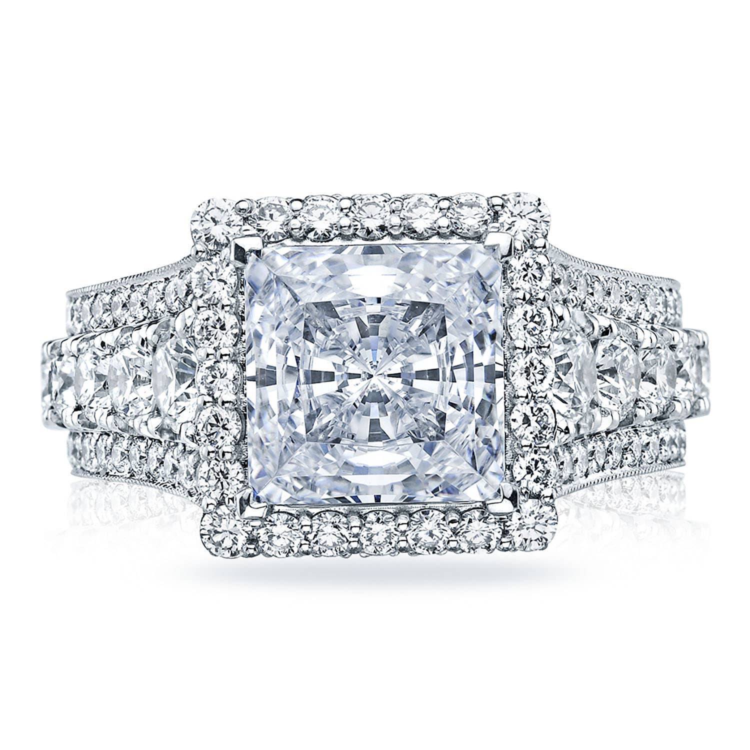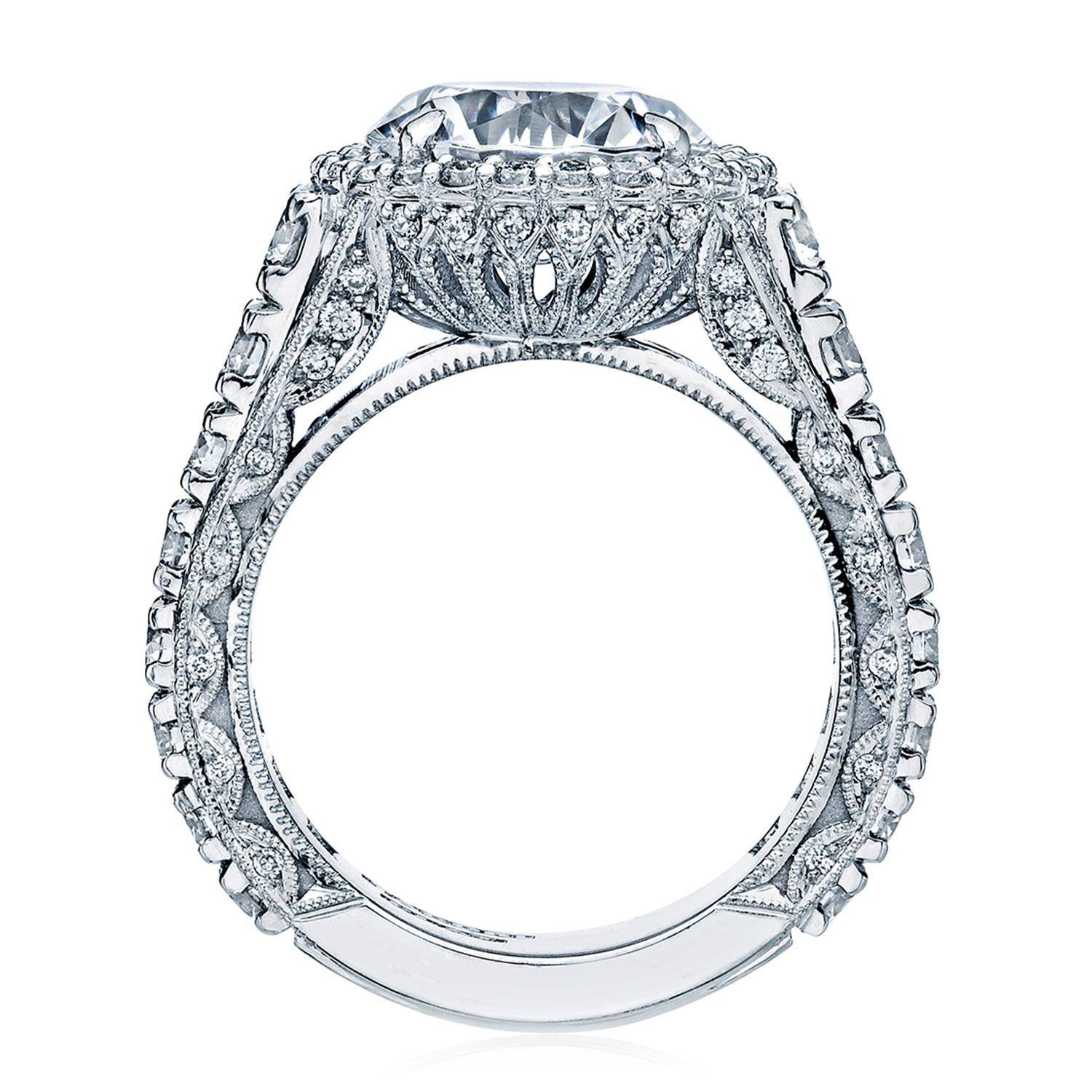 Intense and intricate diamond studding embellishes the Classic Crescent fabric, while round-brilliant diamonds lead up the ceiling towards the princess solitaire. More diamond detailing is found on the prongs of the Classic 360 foundation.