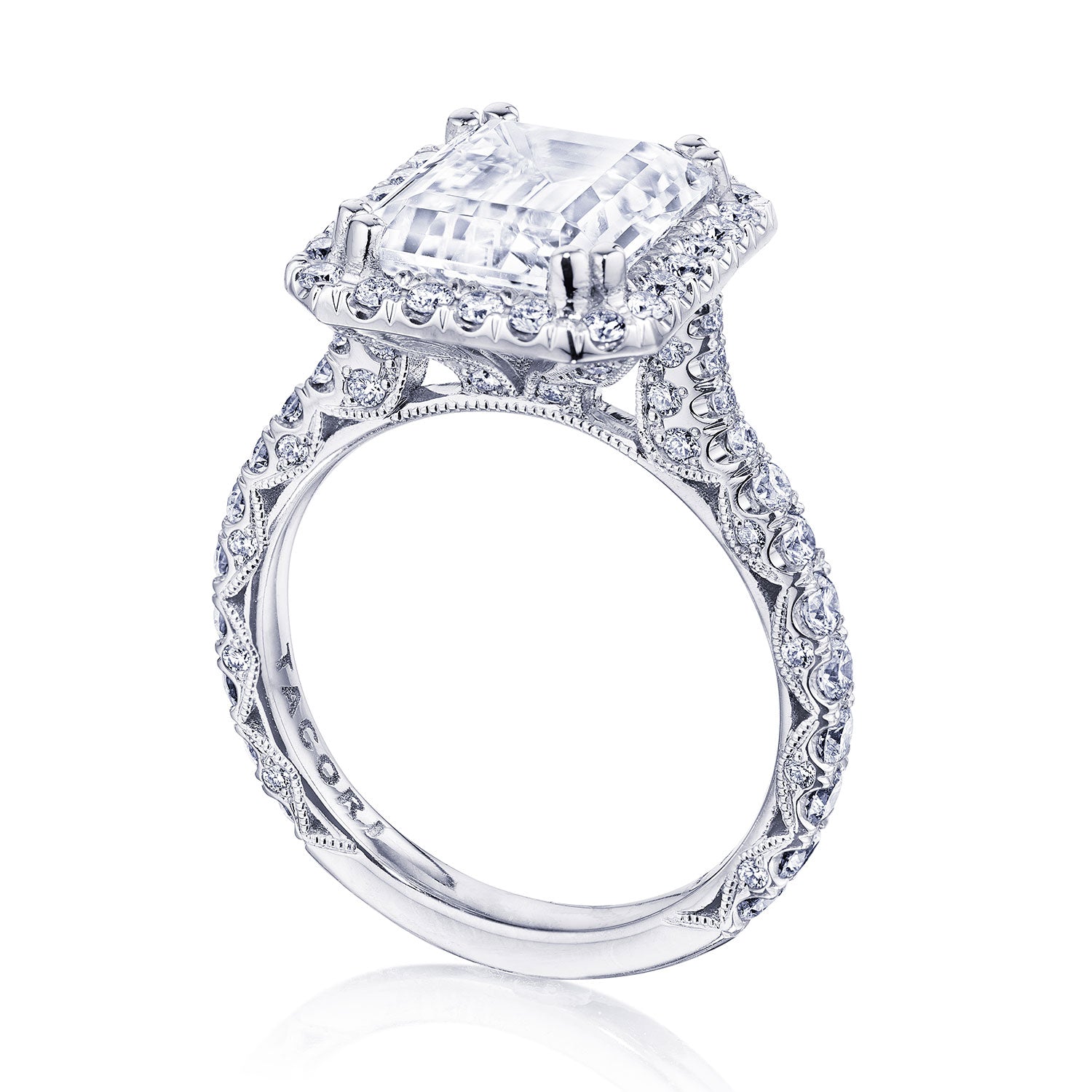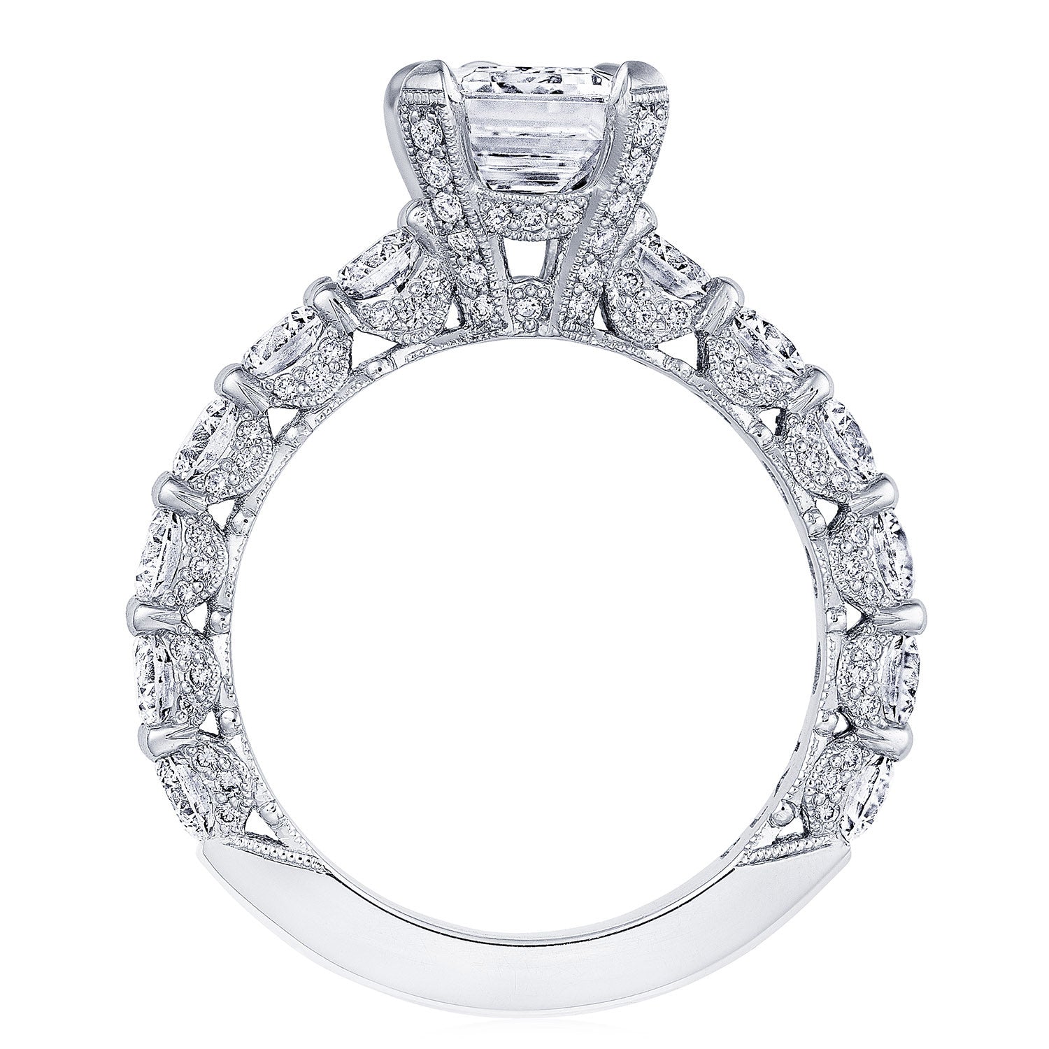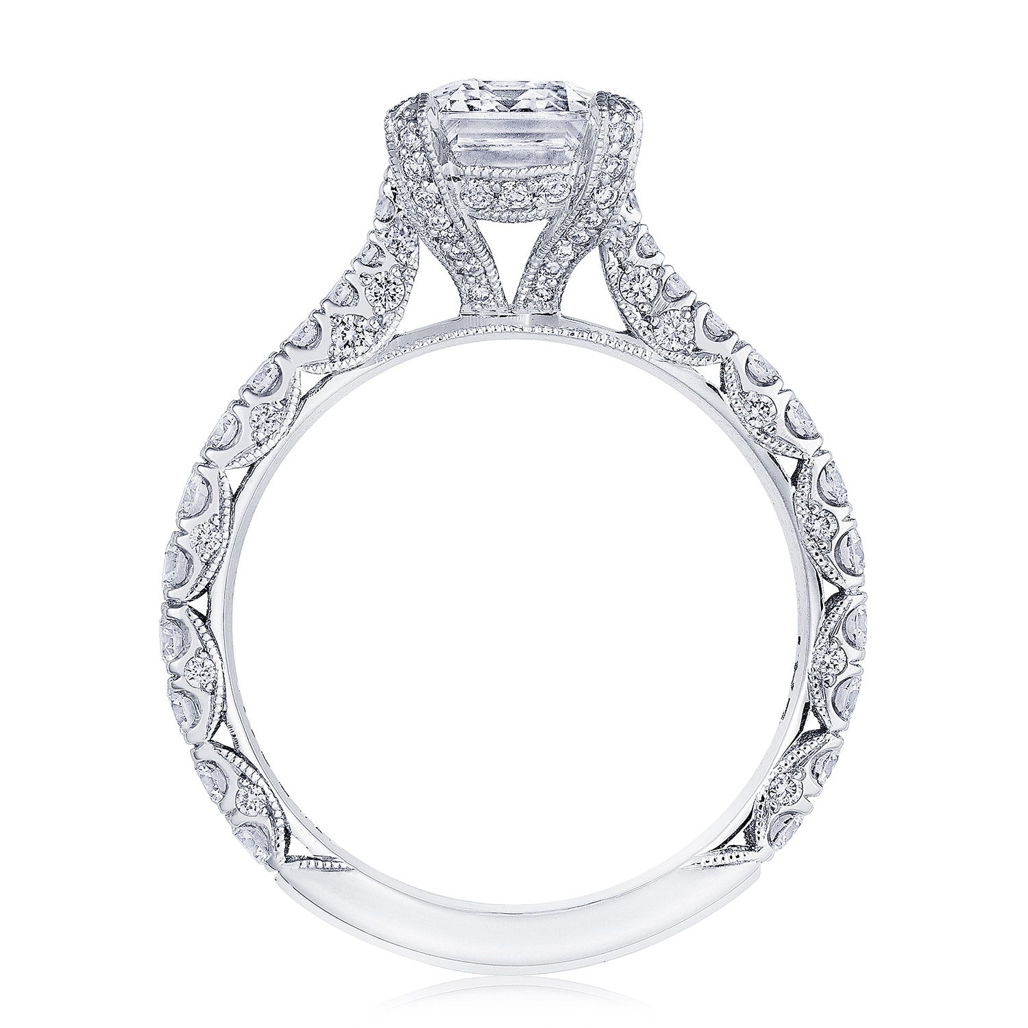 The broad ceiling of this band is decorated with rows of round-brilliant diamonds, which lead towards the bloomed emerald-cut center stone. Two ample windows of light sit just below the cage-like Cathedral foundation.