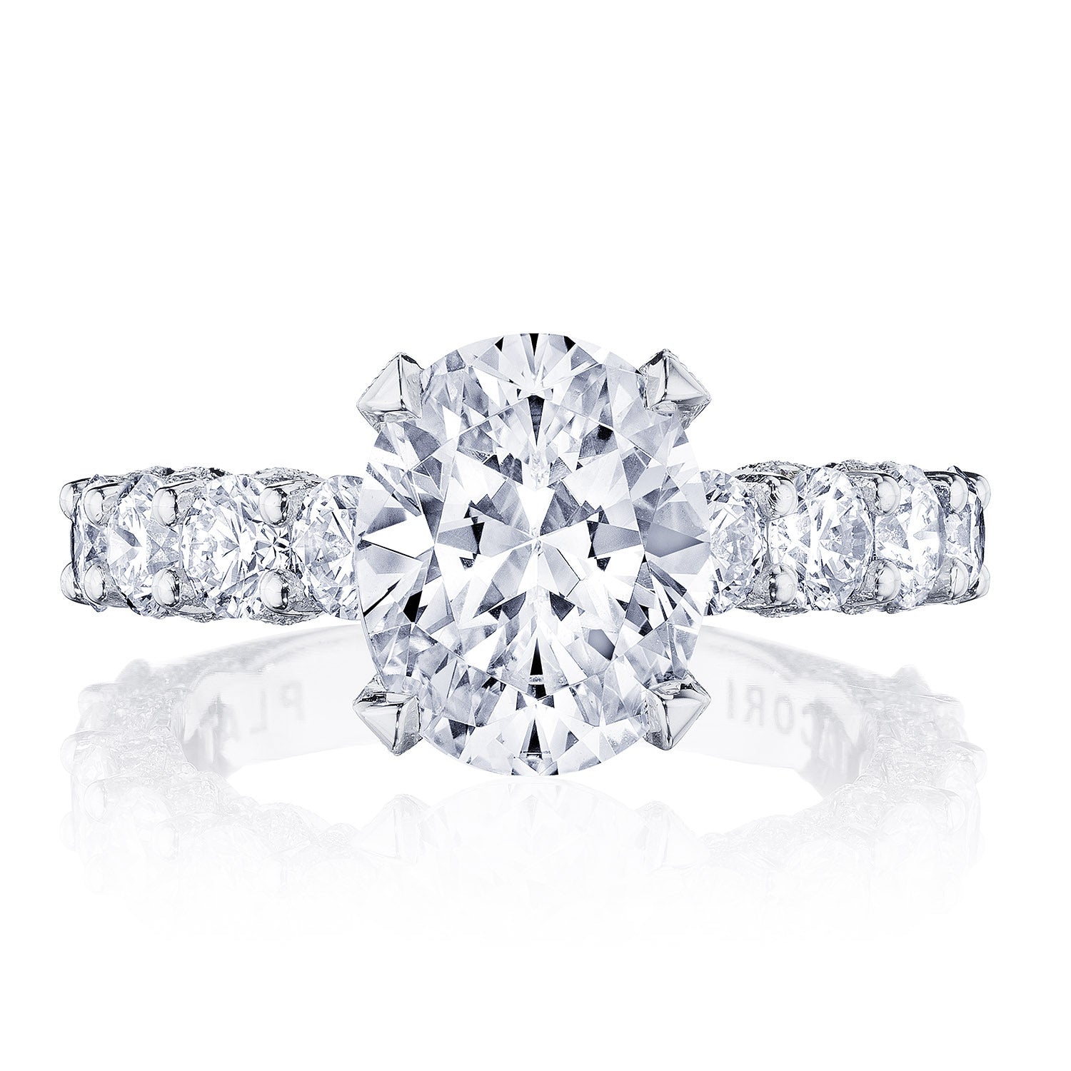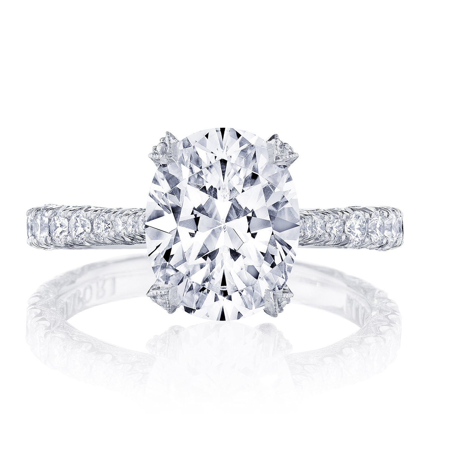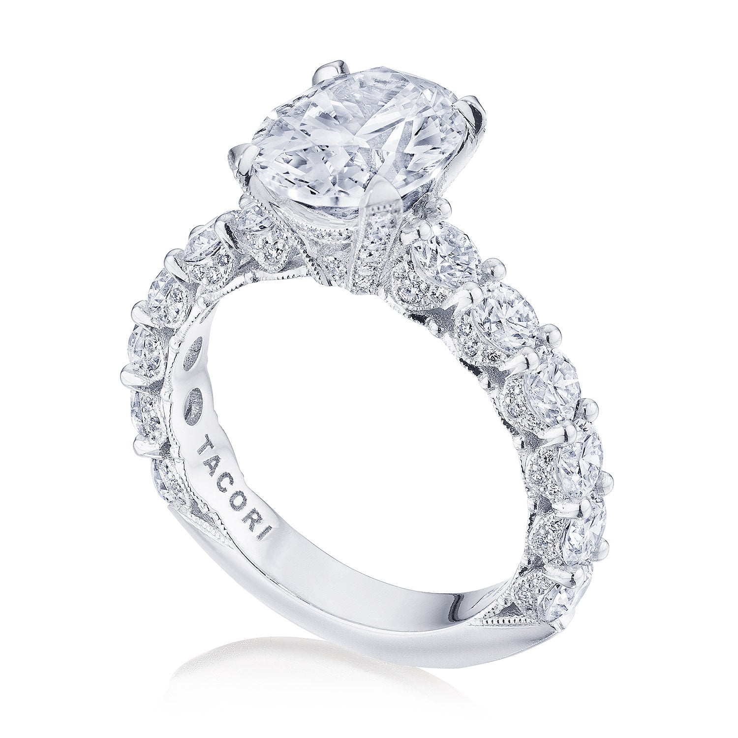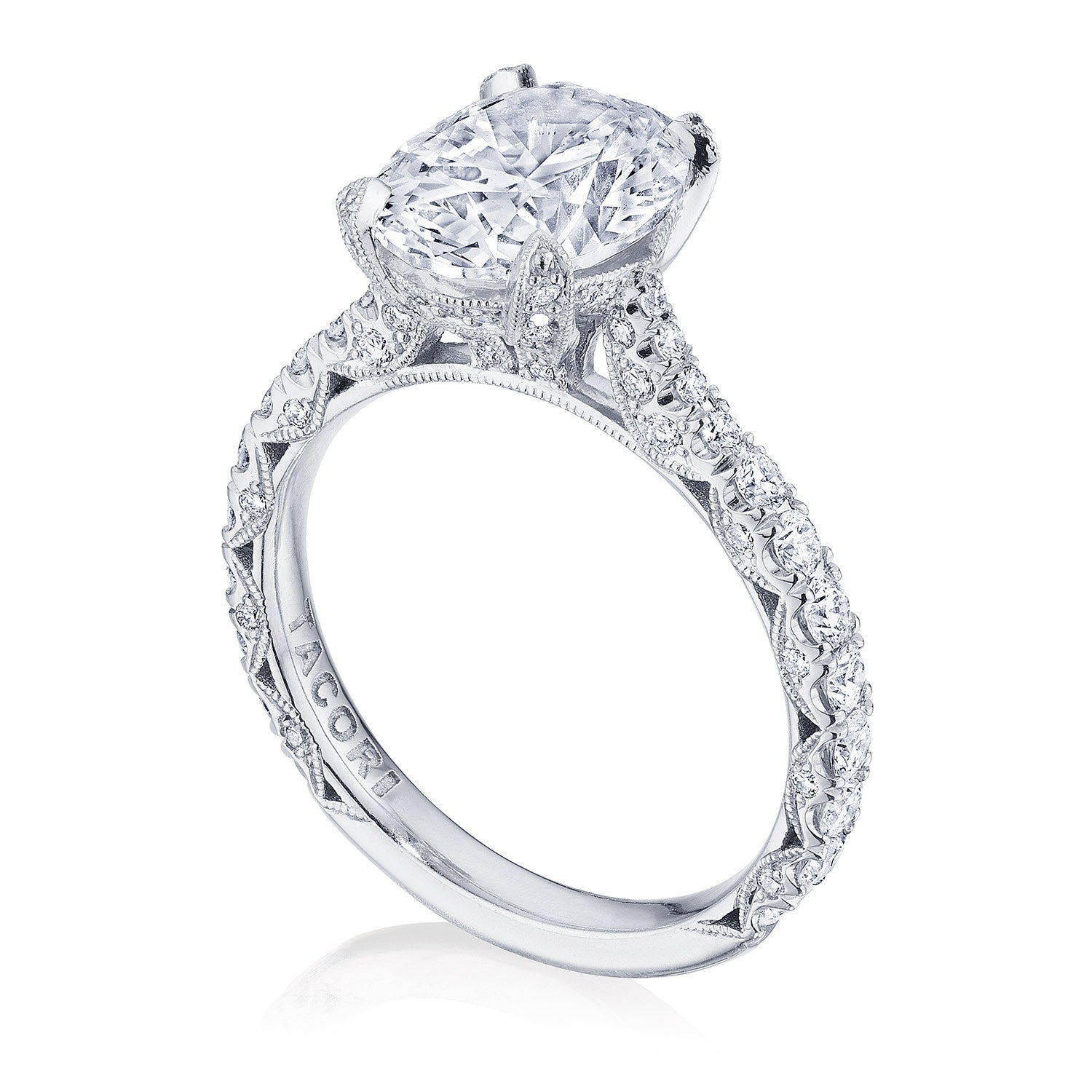 Intense and intricate diamond studding embellishes the Classic Crescent fabric, while round-brilliant diamonds lead up the ceiling towards the oval solitaire. More diamond detailing is found on the prongs of the Classic 360 foundation.