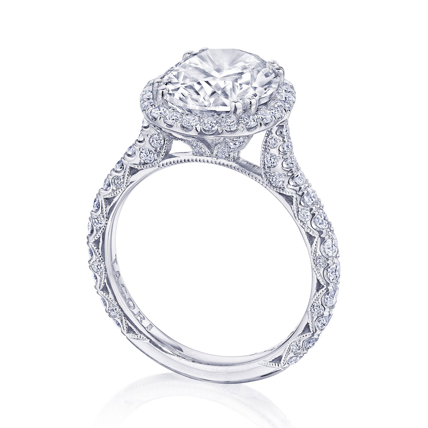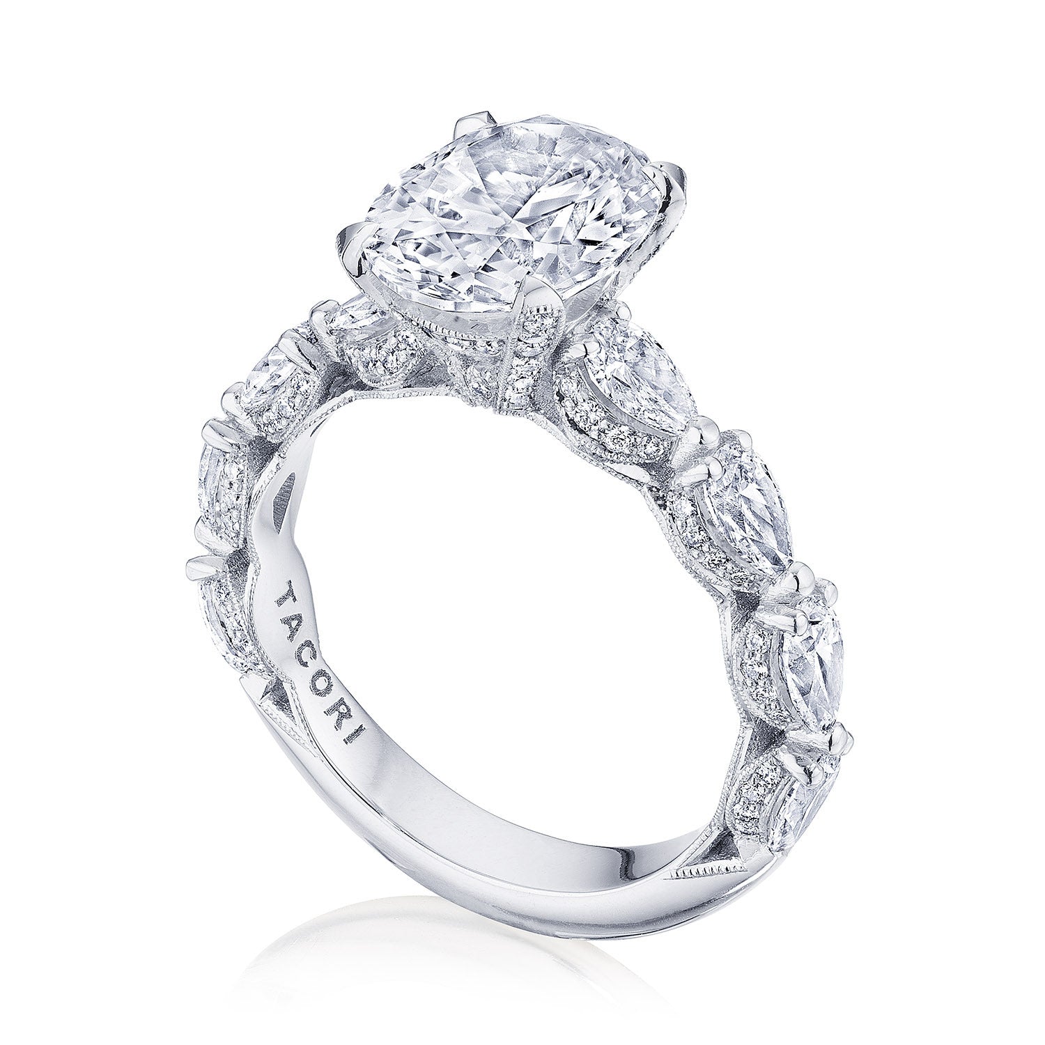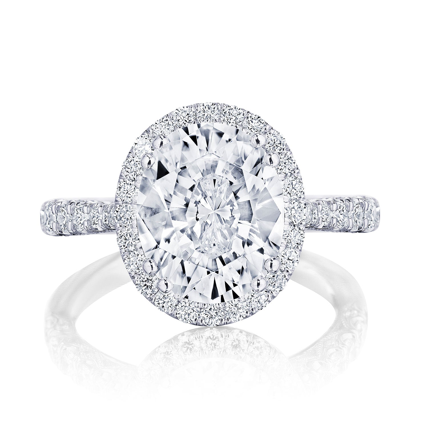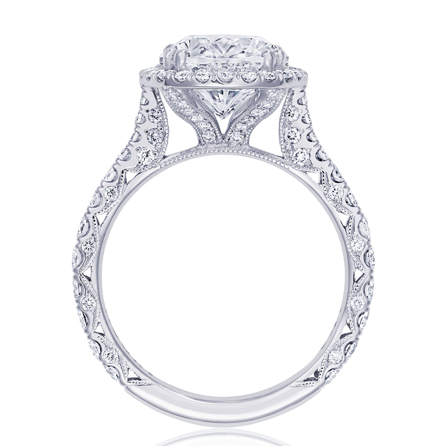 Intense and intricate diamond studding embellishes the Classic Crescent fabric, while round-brilliant diamonds lead up the ceiling towards the oval solitaire. More diamond detailing is found on the prongs of the Classic 360 foundation.