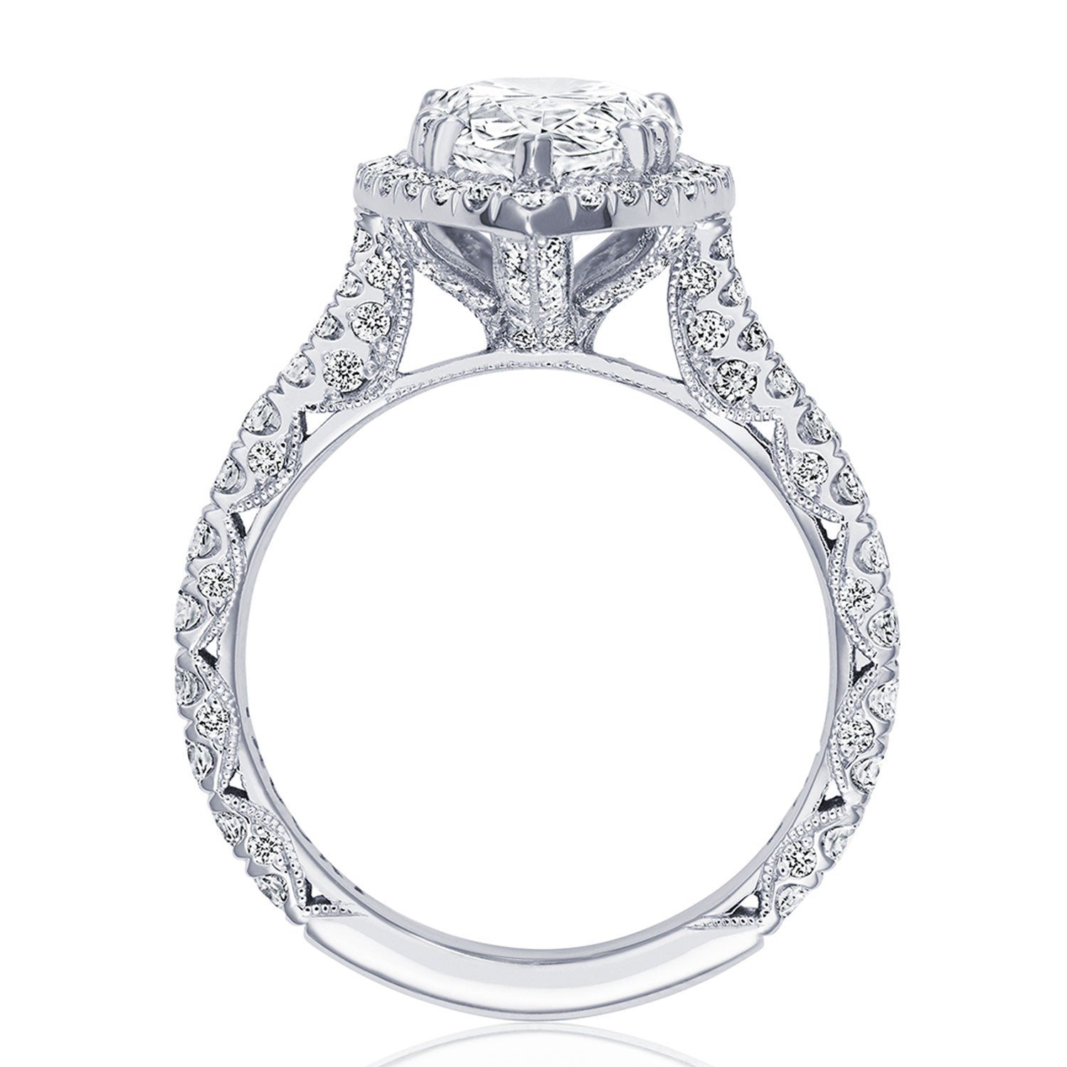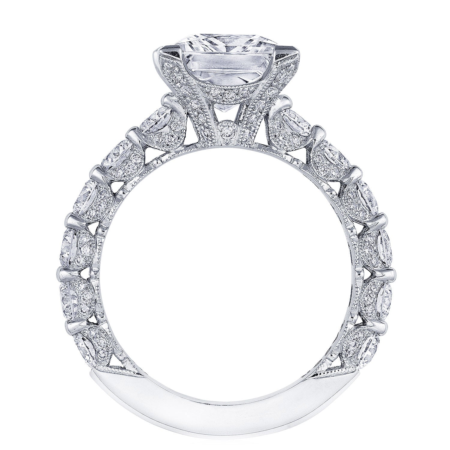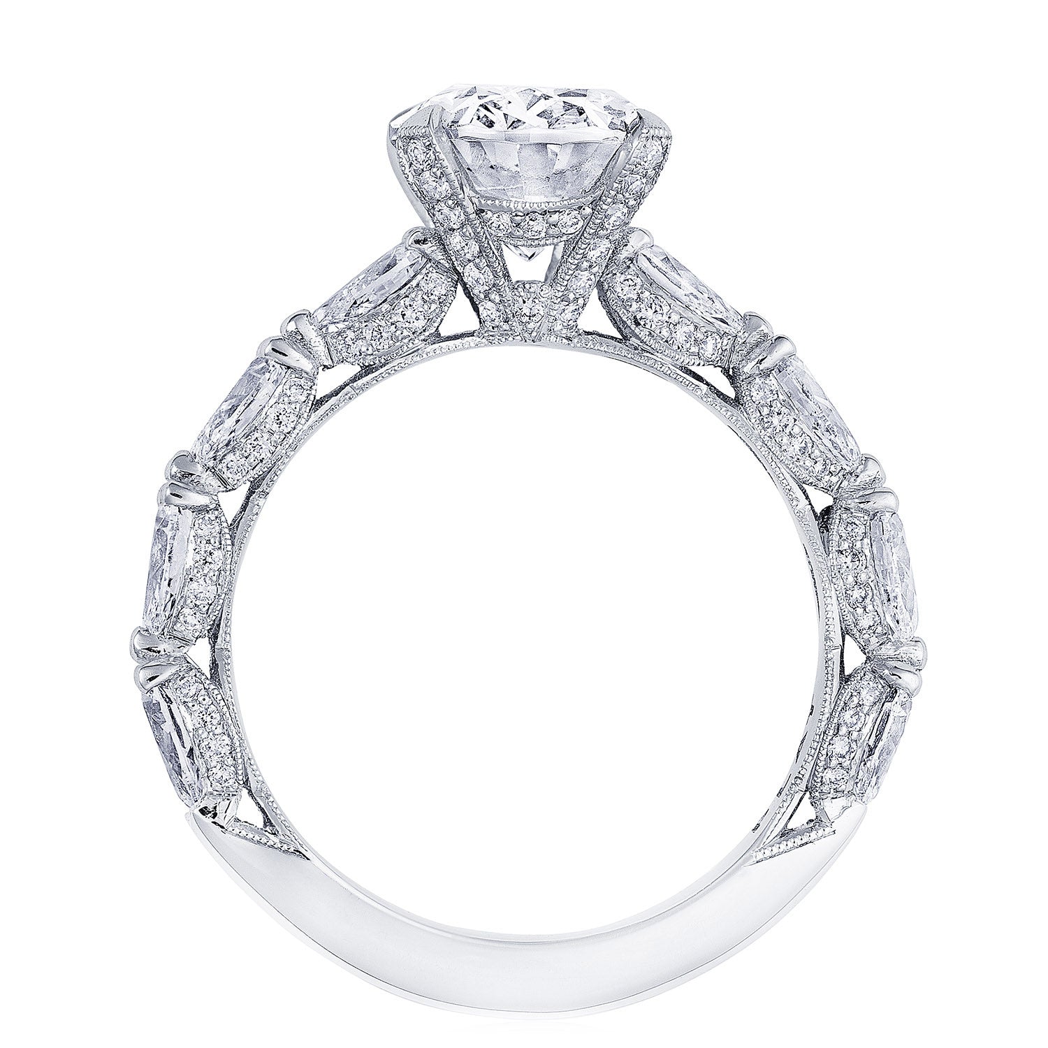 Pear-shape diamonds are set East-to-West on the ceilling, leading towards a solitaire set in a Classic 360 foundation. Delicate diamond studding decorates the prongs, while more diamonds accent the innerface of Classic Crescent fabric.