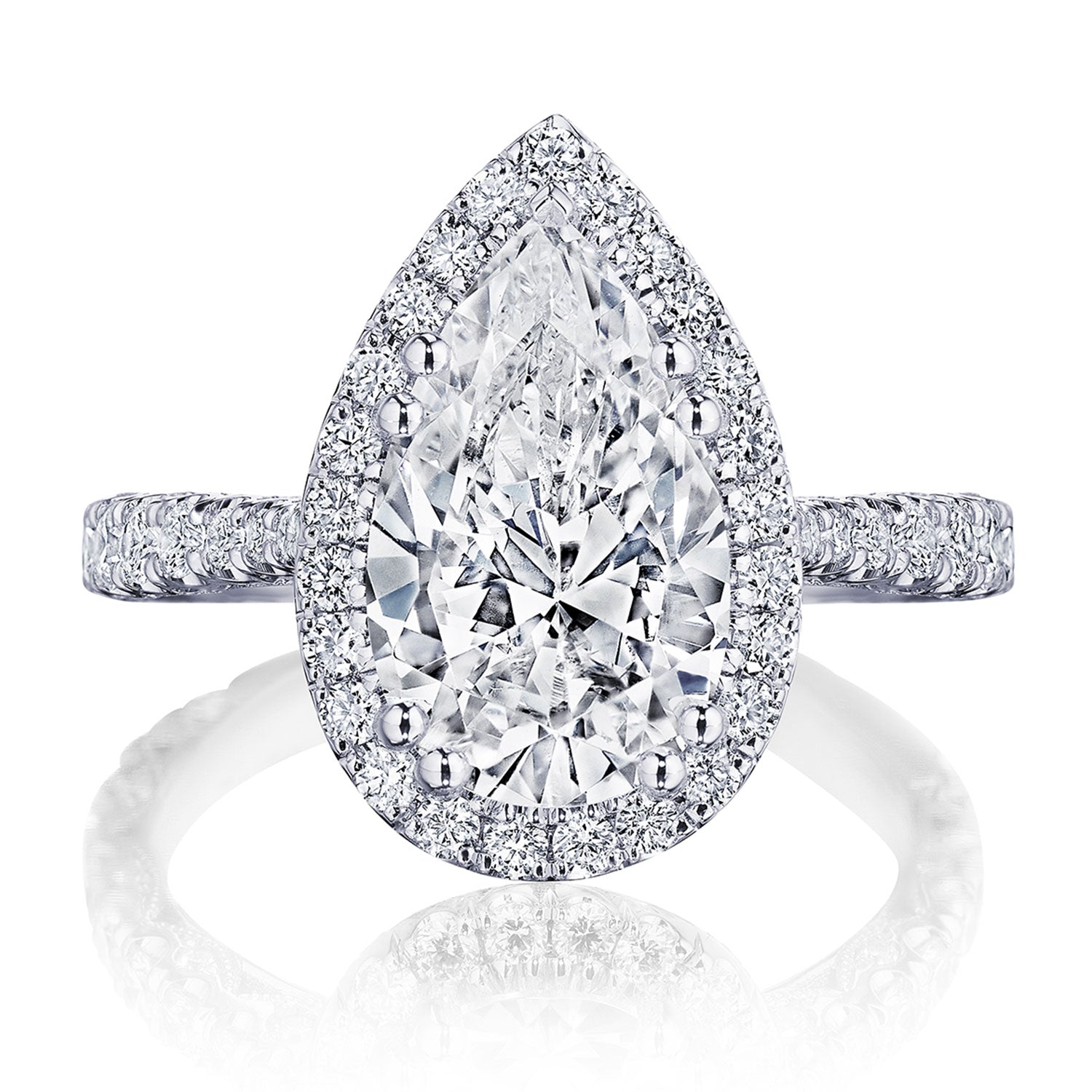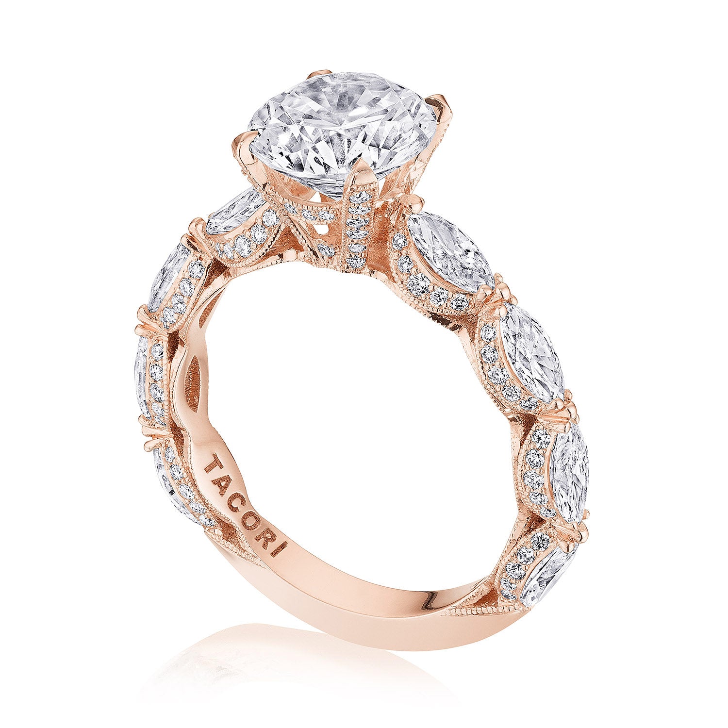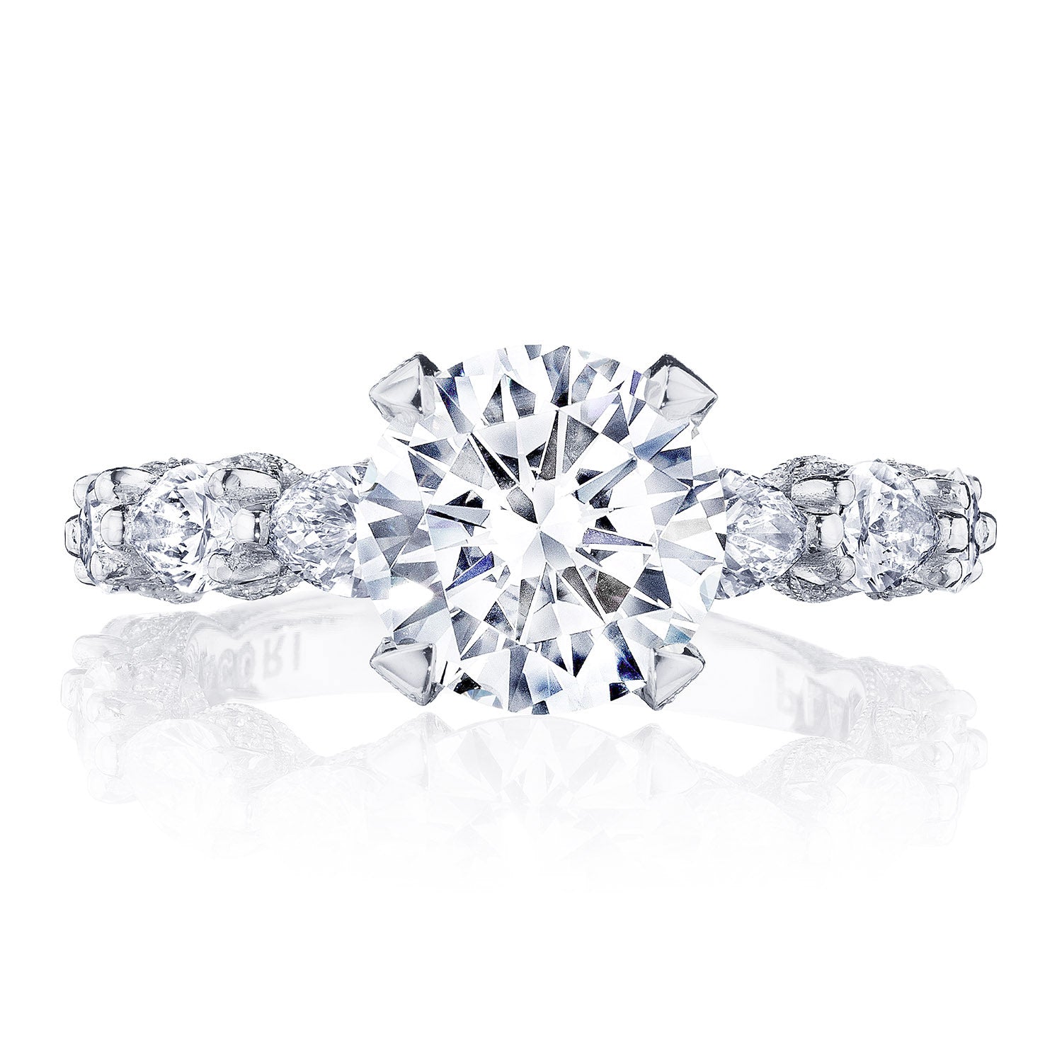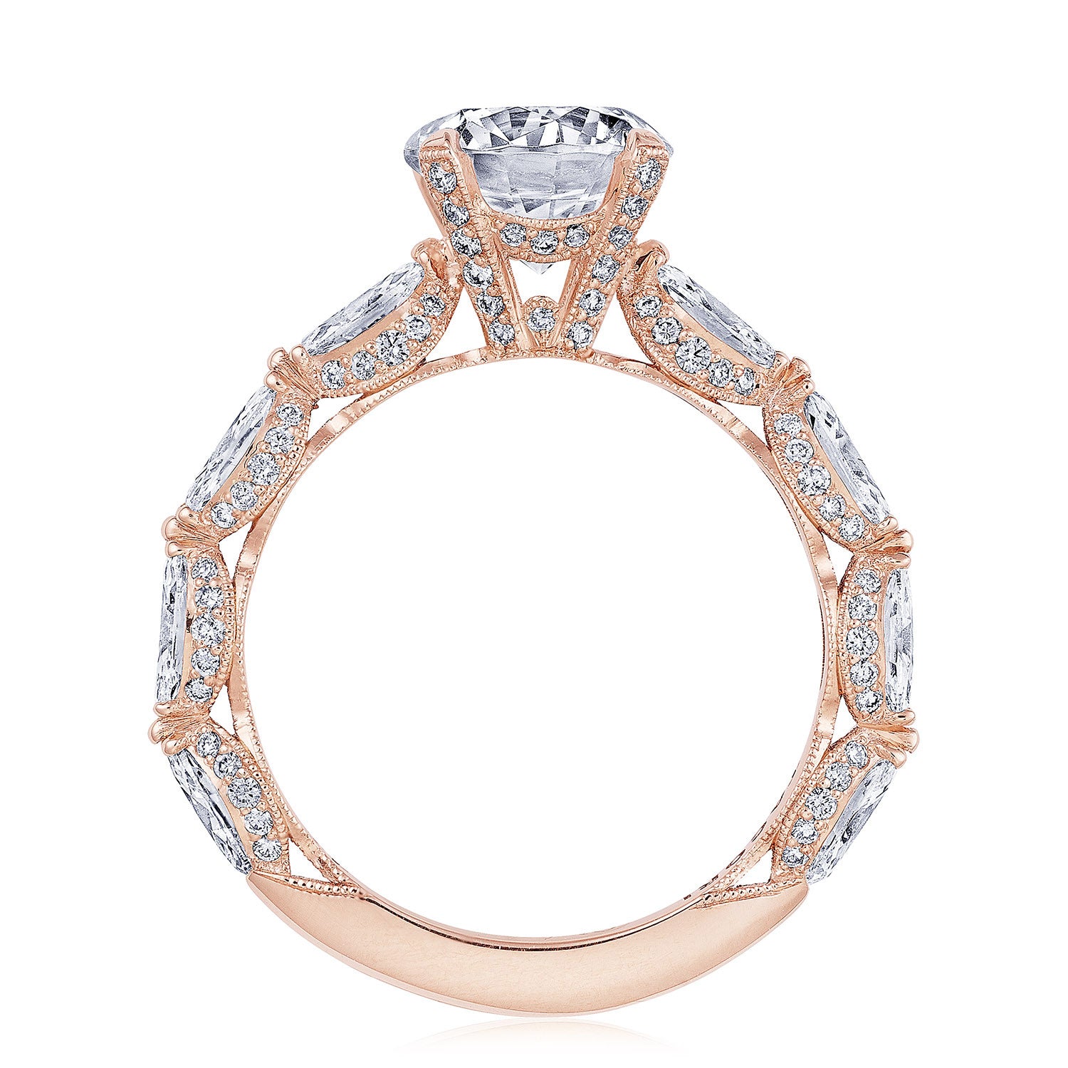Pear-shape diamonds are set East-to-West on the ceilling, leading towards a solitaire set in a Classic 360 foundation. Delicate diamond studding decorates the prongs, while more diamonds accent the innerface of Classic Crescent fabric.