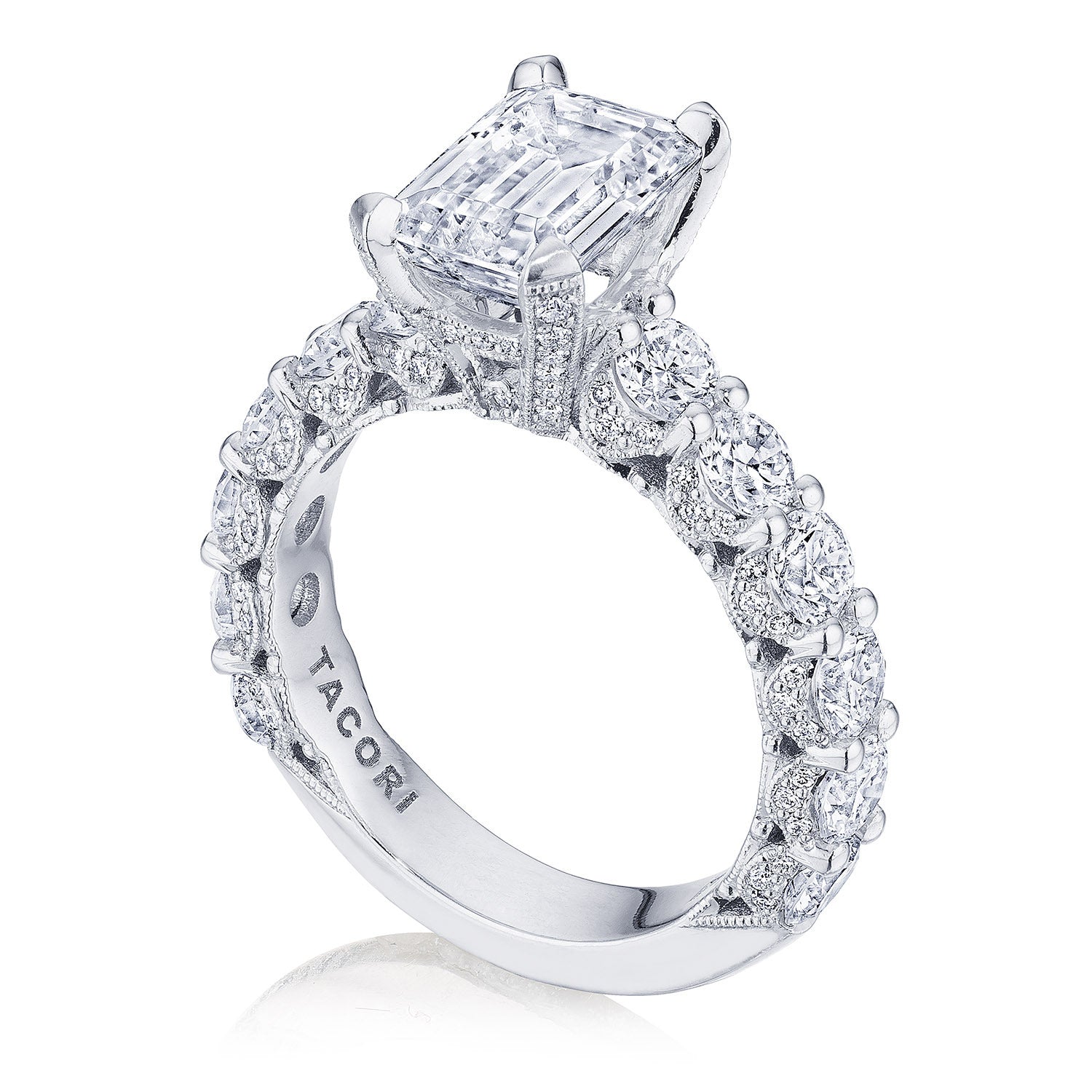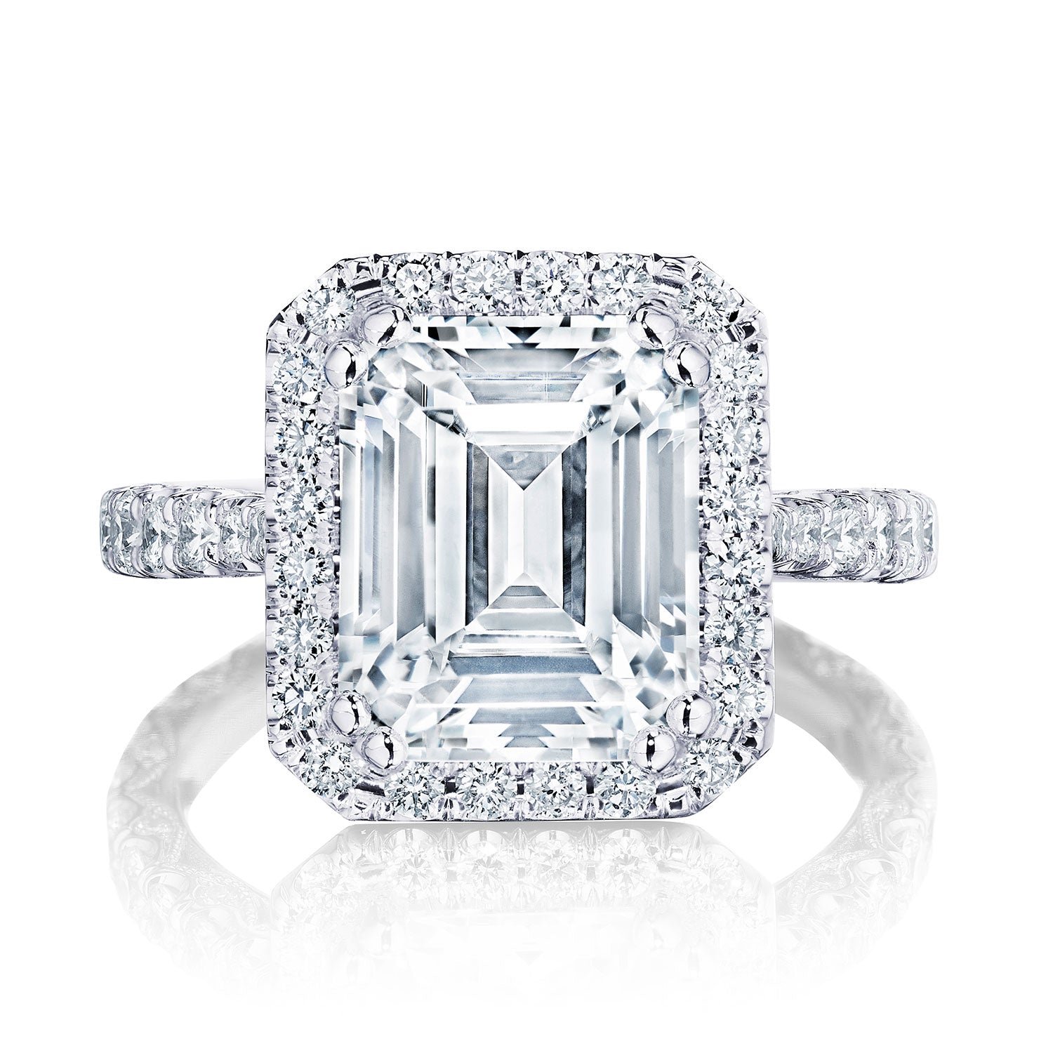 We dare you to look away. Graduating diamonds keep the look contemporary yet heirloom, and lead up to the grand finale, an emerald cut center diamond. Intricate diamond crescent details make this ring an absolute stunner.