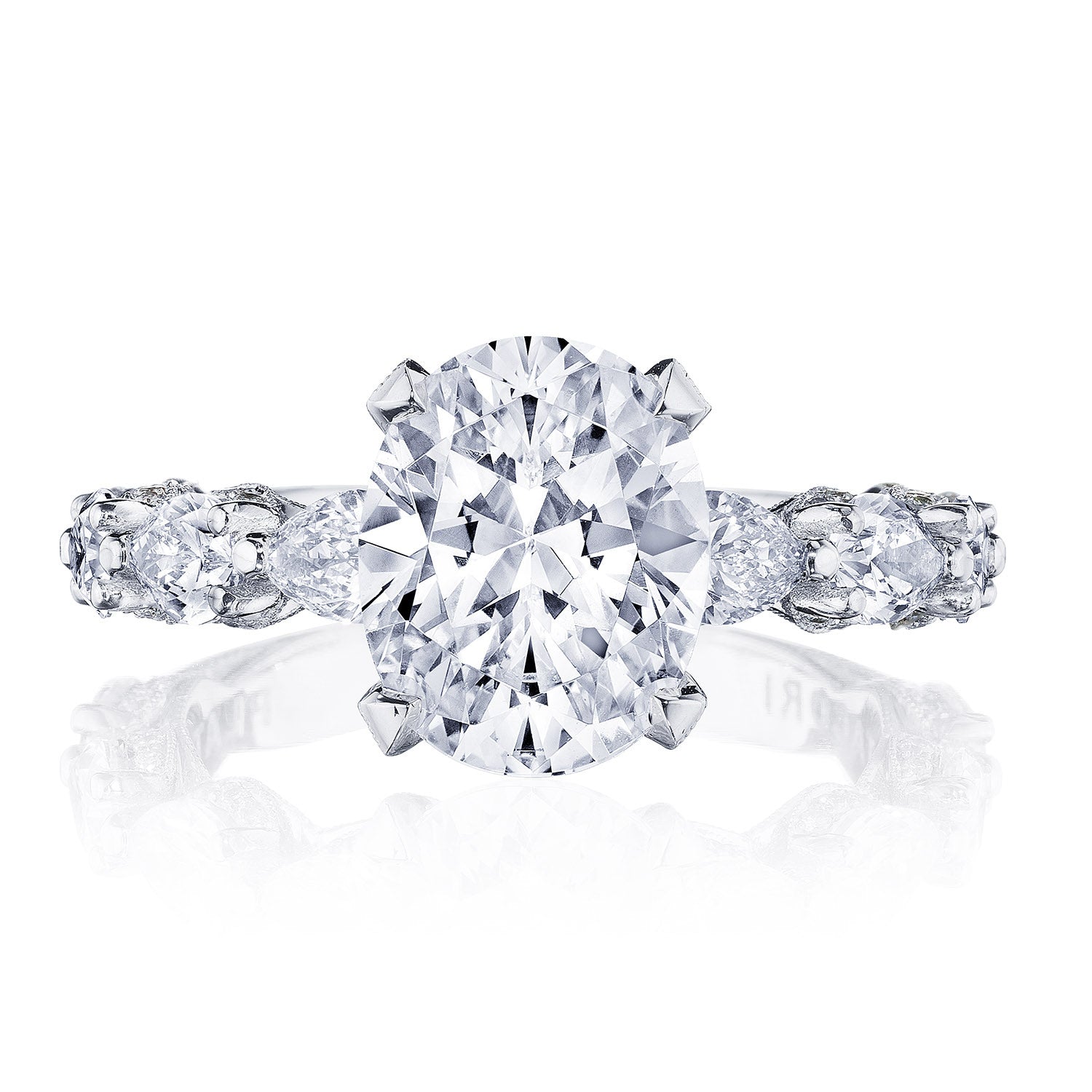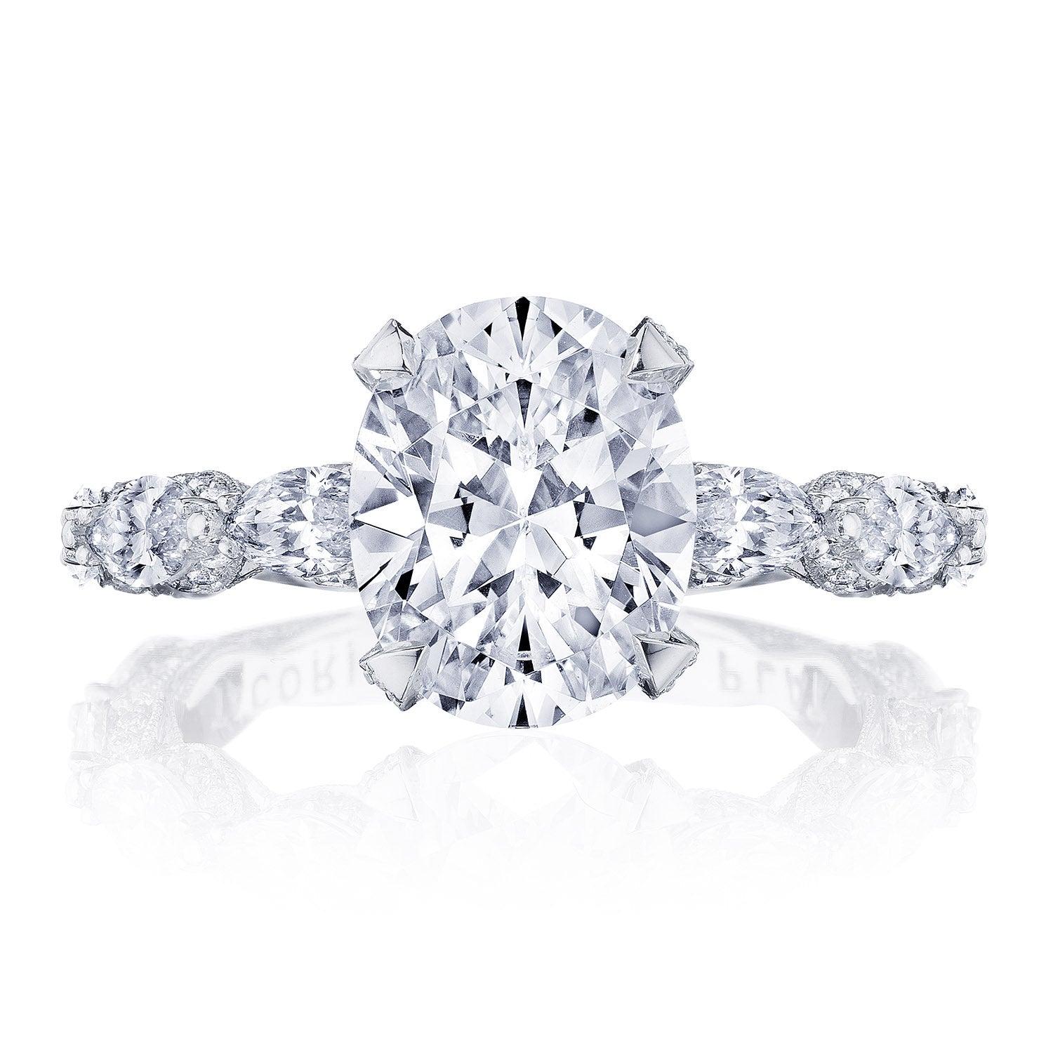 Round-brilliant diamonds embellish the ceiling and lead to the center stone, which is spotlighted with an oval bloom. A hidden bloom adds sparkle to the Cathedral foundation, while Classic Crescent fabric decorates the innerface of the band.