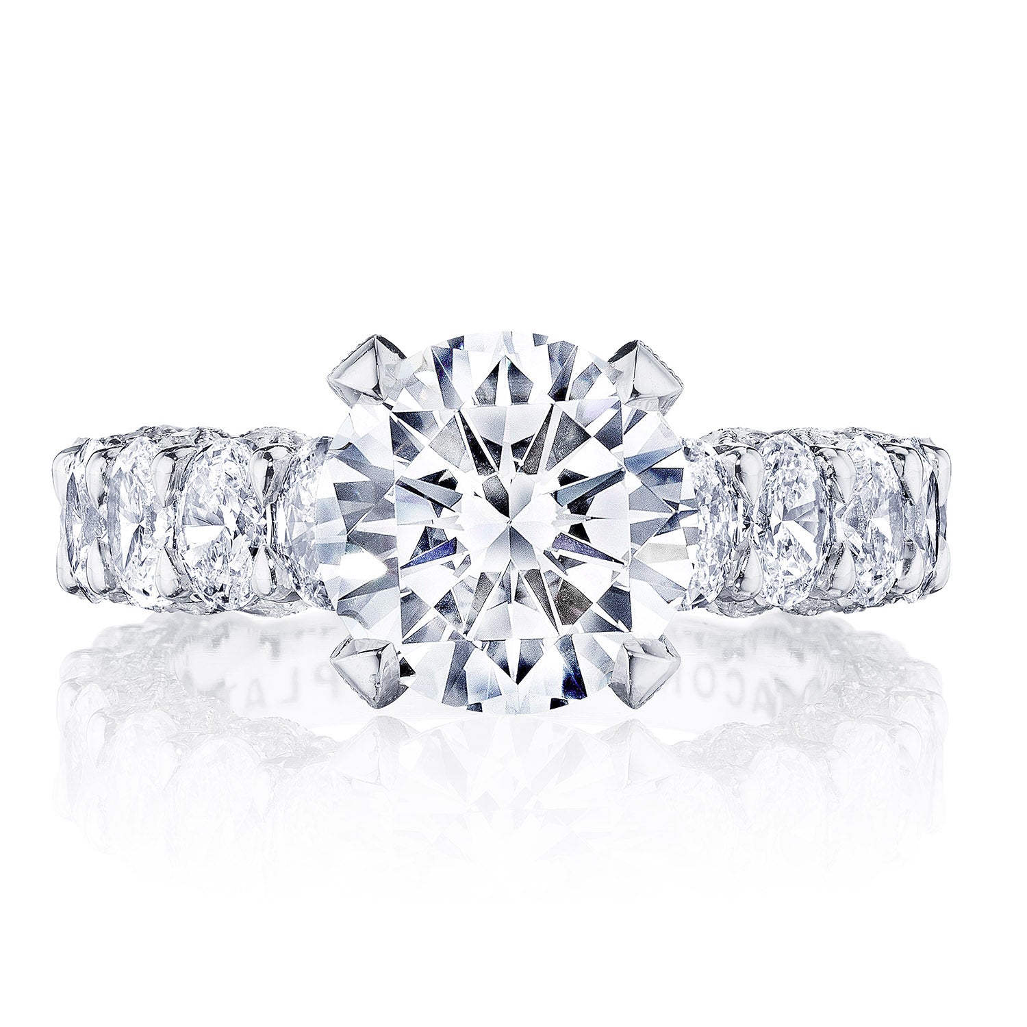 Oval-shape diamonds are set East-to-West on the ceilling, leading towards a solitaire set in a Classic 360 foundation. Delicate diamond studding decorates the prongs, while more diamonds accent the innerface of Classic Crescent fabric.