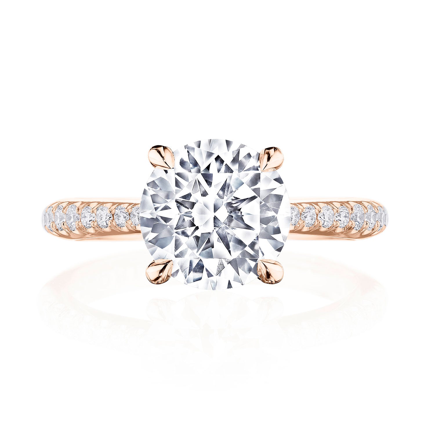 Graduating diamonds lead up the ceiling of the ring to the center stone, which is set into diamond-studded prongs of a Cathedral foundation. A hidden bloom and diamond studding in the Petite Crescent fabric add distive detail.