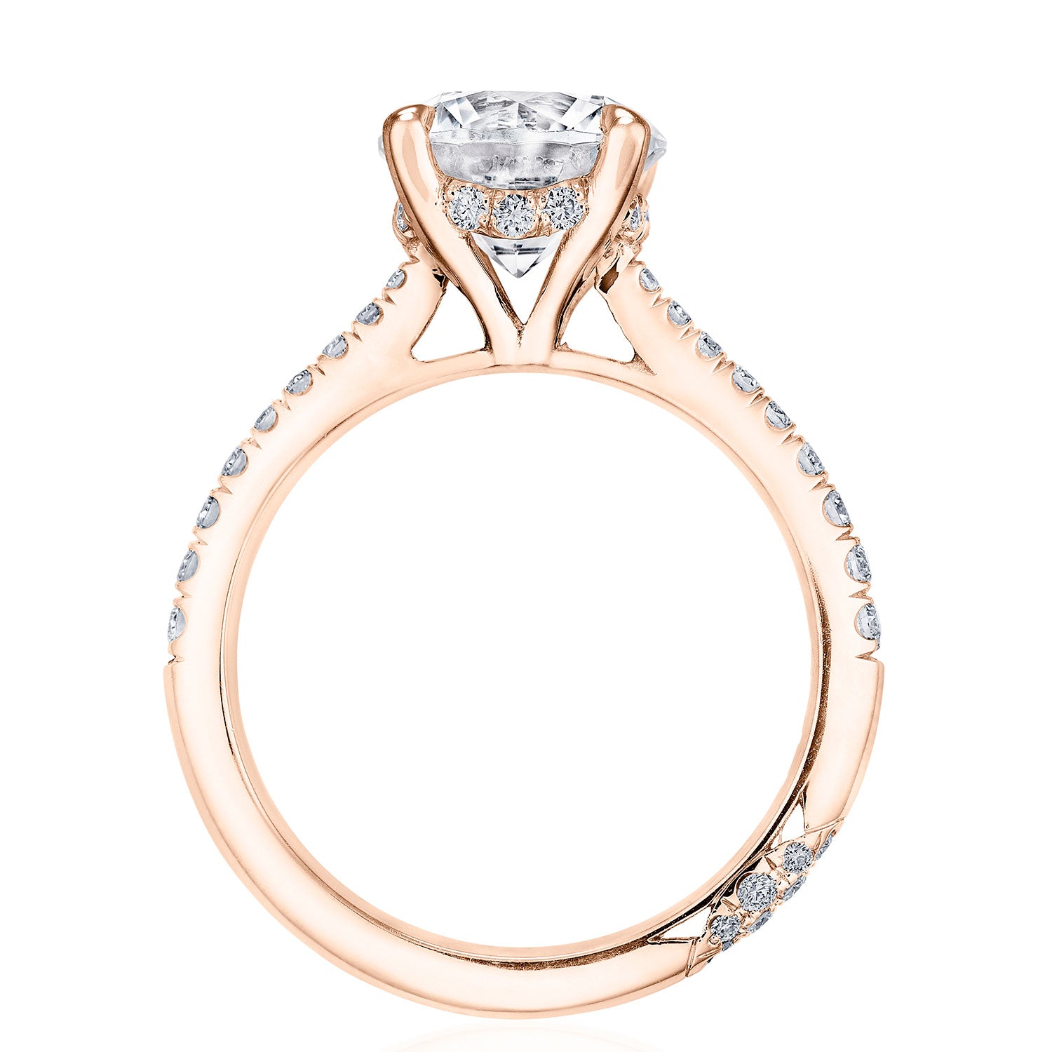 Diamond-studded Petite Crescent fabric decorates the innerface, while pavé-set diamonds lead up the ceiling towards the solitaire, which is set into the diamond-studded prongs. A hidden bloom adds brilliance beneath the crown.